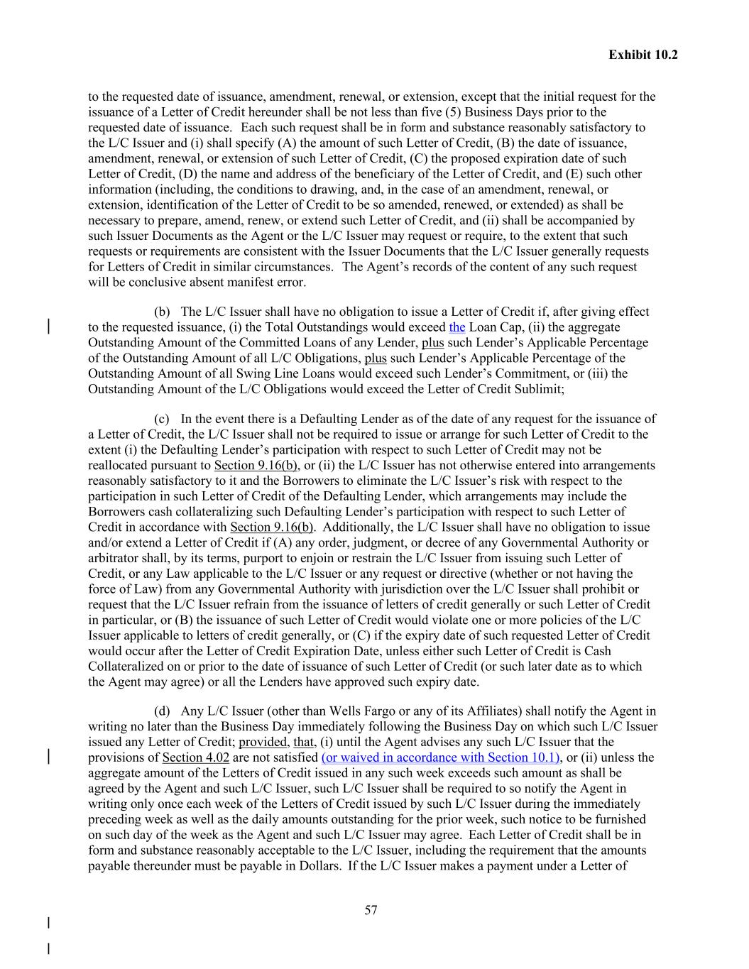 57 Exhibit 10.2 to the requested date of issuance, amendment, renewal, or extension, except that the initial request for the issuance of a Letter of Credit hereunder shall be not less than five (5) Business Days prior to the requested date of issuance. Each such request shall be in form and substance reasonably satisfactory to the L/C Issuer and (i) shall specify (A) the amount of such Letter of Credit, (B) the date of issuance, amendment, renewal, or extension of such Letter of Credit, (C) the proposed expiration date of such Letter of Credit, (D) the name and address of the beneficiary of the Letter of Credit, and (E) such other information (including, the conditions to drawing, and, in the case of an amendment, renewal, or extension, identification of the Letter of Credit to be so amended, renewed, or extended) as shall be necessary to prepare, amend, renew, or extend such Letter of Credit, and (ii) shall be accompanied by such Issuer Documents as the Agent or the L/C Issuer may request or require, to the extent that such requests or requirements are consistent with the Issuer Documents that the L/C Issuer generally requests for Letters of Credit in similar circumstances. The Agent’s records of the content of any such request will be conclusive absent manifest error. (b) The L/C Issuer shall have no obligation to issue a Letter of Credit if, after giving effect to the requested issuance, (i) the Total Outstandings would exceed the Loan Cap, (ii) the aggregate Outstanding Amount of the Committed Loans of any Lender, plus such Lender’s Applicable Percentage of the Outstanding Amount of all L/C Obligations, plus such Lender’s Applicable Percentage of the Outstanding Amount of all Swing Line Loans would exceed such Lender’s Commitment, or (iii) the Outstanding Amount of the L/C Obligations would exceed the Letter of Credit Sublimit; (c) In the event there is a Defaulting Lender as of the date of any request for the issuance of a Letter of Credit, the L/C Issuer shall not be required to issue or arrange for such Letter of Credit to the extent (i) the Defaulting Lender’s participation with respect to such Letter of Credit may not be reallocated pursuant to Section 9.16(b), or (ii) the L/C Issuer has not otherwise entered into arrangements reasonably satisfactory to it and the Borrowers to eliminate the L/C Issuer’s risk with respect to the participation in such Letter of Credit of the Defaulting Lender, which arrangements may include the Borrowers cash collateralizing such Defaulting Lender’s participation with respect to such Letter of Credit in accordance with Section 9.16(b). Additionally, the L/C Issuer shall have no obligation to issue and/or extend a Letter of Credit if (A) any order, judgment, or decree of any Governmental Authority or arbitrator shall, by its terms, purport to enjoin or restrain the L/C Issuer from issuing such Letter of Credit, or any Law applicable to the L/C Issuer or any request or directive (whether or not having the force of Law) from any Governmental Authority with jurisdiction over the L/C Issuer shall prohibit or request that the L/C Issuer refrain from the issuance of letters of credit generally or such Letter of Credit in particular, or (B) the issuance of such Letter of Credit would violate one or more policies of the L/C Issuer applicable to letters of credit generally, or (C) if the expiry date of such requested Letter of Credit would occur after the Letter of Credit Expiration Date, unless either such Letter of Credit is Cash Collateralized on or prior to the date of issuance of such Letter of Credit (or such later date as to which the Agent may agree) or all the Lenders have approved such expiry date. (d) Any L/C Issuer (other than Wells Fargo or any of its Affiliates) shall notify the Agent in writing no later than the Business Day immediately following the Business Day on which such L/C Issuer issued any Letter of Credit; provided, that, (i) until the Agent advises any such L/C Issuer that the provisions of Section 4.02 are not satisfied (or waived in accordance with Section 10.1), or (ii) unless the aggregate amount of the Letters of Credit issued in any such week exceeds such amount as shall be agreed by the Agent and such L/C Issuer, such L/C Issuer shall be required to so notify the Agent in writing only once each week of the Letters of Credit issued by such L/C Issuer during the immediately preceding week as well as the daily amounts outstanding for the prior week, such notice to be furnished on such day of the week as the Agent and such L/C Issuer may agree. Each Letter of Credit shall be in form and substance reasonably acceptable to the L/C Issuer, including the requirement that the amounts payable thereunder must be payable in Dollars. If the L/C Issuer makes a payment under a Letter of