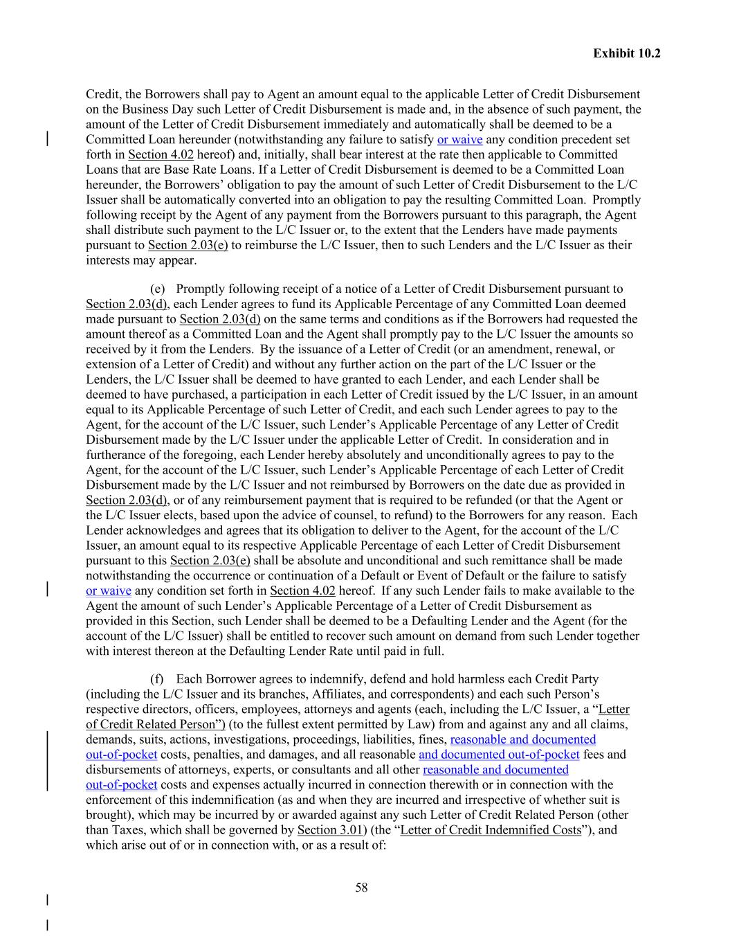 58 Exhibit 10.2 Credit, the Borrowers shall pay to Agent an amount equal to the applicable Letter of Credit Disbursement on the Business Day such Letter of Credit Disbursement is made and, in the absence of such payment, the amount of the Letter of Credit Disbursement immediately and automatically shall be deemed to be a Committed Loan hereunder (notwithstanding any failure to satisfy or waive any condition precedent set forth in Section 4.02 hereof) and, initially, shall bear interest at the rate then applicable to Committed Loans that are Base Rate Loans. If a Letter of Credit Disbursement is deemed to be a Committed Loan hereunder, the Borrowers’ obligation to pay the amount of such Letter of Credit Disbursement to the L/C Issuer shall be automatically converted into an obligation to pay the resulting Committed Loan. Promptly following receipt by the Agent of any payment from the Borrowers pursuant to this paragraph, the Agent shall distribute such payment to the L/C Issuer or, to the extent that the Lenders have made payments pursuant to Section 2.03(e) to reimburse the L/C Issuer, then to such Lenders and the L/C Issuer as their interests may appear. (e) Promptly following receipt of a notice of a Letter of Credit Disbursement pursuant to Section 2.03(d), each Lender agrees to fund its Applicable Percentage of any Committed Loan deemed made pursuant to Section 2.03(d) on the same terms and conditions as if the Borrowers had requested the amount thereof as a Committed Loan and the Agent shall promptly pay to the L/C Issuer the amounts so received by it from the Lenders. By the issuance of a Letter of Credit (or an amendment, renewal, or extension of a Letter of Credit) and without any further action on the part of the L/C Issuer or the Lenders, the L/C Issuer shall be deemed to have granted to each Lender, and each Lender shall be deemed to have purchased, a participation in each Letter of Credit issued by the L/C Issuer, in an amount equal to its Applicable Percentage of such Letter of Credit, and each such Lender agrees to pay to the Agent, for the account of the L/C Issuer, such Lender’s Applicable Percentage of any Letter of Credit Disbursement made by the L/C Issuer under the applicable Letter of Credit. In consideration and in furtherance of the foregoing, each Lender hereby absolutely and unconditionally agrees to pay to the Agent, for the account of the L/C Issuer, such Lender’s Applicable Percentage of each Letter of Credit Disbursement made by the L/C Issuer and not reimbursed by Borrowers on the date due as provided in Section 2.03(d), or of any reimbursement payment that is required to be refunded (or that the Agent or the L/C Issuer elects, based upon the advice of counsel, to refund) to the Borrowers for any reason. Each Lender acknowledges and agrees that its obligation to deliver to the Agent, for the account of the L/C Issuer, an amount equal to its respective Applicable Percentage of each Letter of Credit Disbursement pursuant to this Section 2.03(e) shall be absolute and unconditional and such remittance shall be made notwithstanding the occurrence or continuation of a Default or Event of Default or the failure to satisfy or waive any condition set forth in Section 4.02 hereof. If any such Lender fails to make available to the Agent the amount of such Lender’s Applicable Percentage of a Letter of Credit Disbursement as provided in this Section, such Lender shall be deemed to be a Defaulting Lender and the Agent (for the account of the L/C Issuer) shall be entitled to recover such amount on demand from such Lender together with interest thereon at the Defaulting Lender Rate until paid in full. (f) Each Borrower agrees to indemnify, defend and hold harmless each Credit Party (including the L/C Issuer and its branches, Affiliates, and correspondents) and each such Person’s respective directors, officers, employees, attorneys and agents (each, including the L/C Issuer, a “Letter of Credit Related Person”) (to the fullest extent permitted by Law) from and against any and all claims, demands, suits, actions, investigations, proceedings, liabilities, fines, reasonable and documented out-of-pocket costs, penalties, and damages, and all reasonable and documented out-of-pocket fees and disbursements of attorneys, experts, or consultants and all other reasonable and documented out-of-pocket costs and expenses actually incurred in connection therewith or in connection with the enforcement of this indemnification (as and when they are incurred and irrespective of whether suit is brought), which may be incurred by or awarded against any such Letter of Credit Related Person (other than Taxes, which shall be governed by Section 3.01) (the “Letter of Credit Indemnified Costs”), and which arise out of or in connection with, or as a result of: