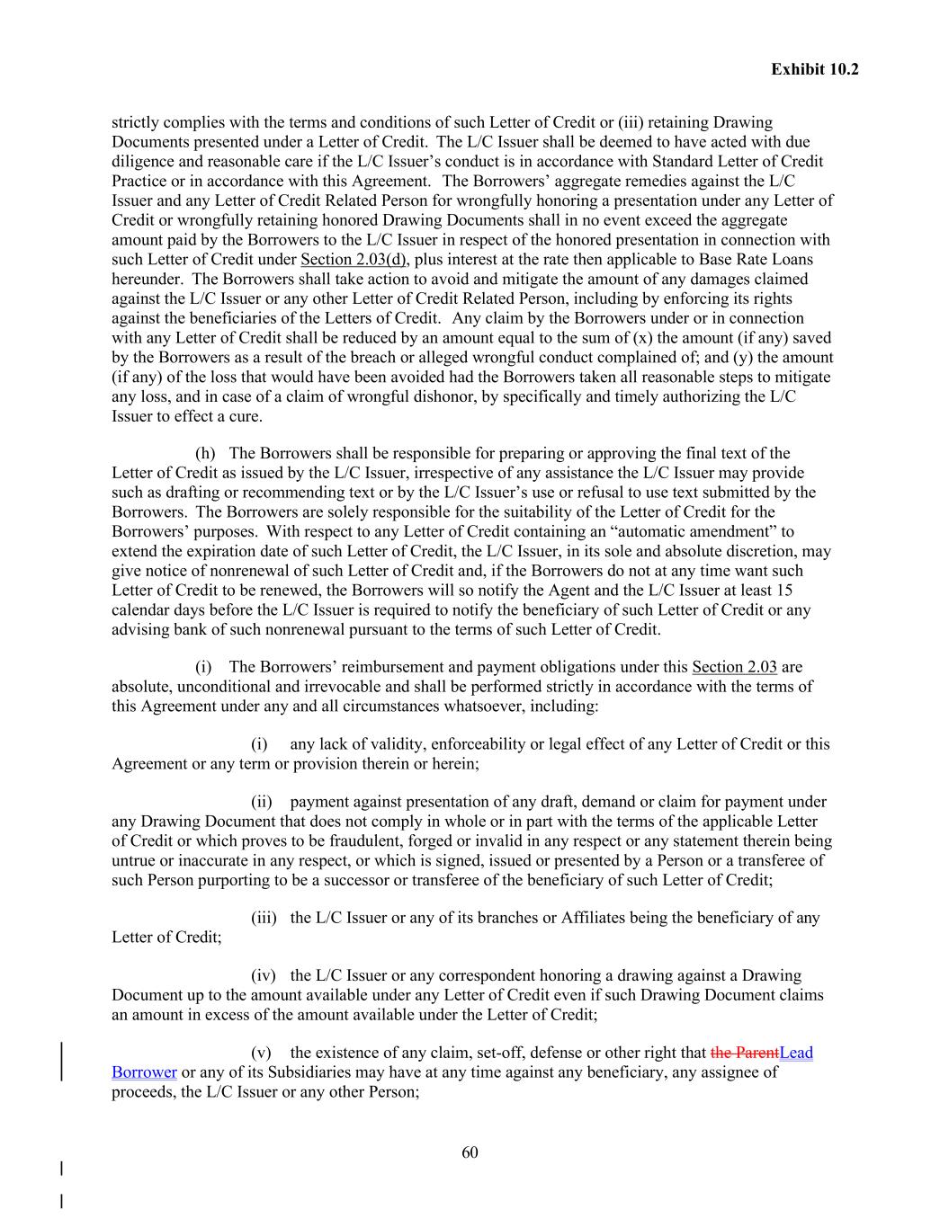 60 Exhibit 10.2 strictly complies with the terms and conditions of such Letter of Credit or (iii) retaining Drawing Documents presented under a Letter of Credit. The L/C Issuer shall be deemed to have acted with due diligence and reasonable care if the L/C Issuer’s conduct is in accordance with Standard Letter of Credit Practice or in accordance with this Agreement. The Borrowers’ aggregate remedies against the L/C Issuer and any Letter of Credit Related Person for wrongfully honoring a presentation under any Letter of Credit or wrongfully retaining honored Drawing Documents shall in no event exceed the aggregate amount paid by the Borrowers to the L/C Issuer in respect of the honored presentation in connection with such Letter of Credit under Section 2.03(d), plus interest at the rate then applicable to Base Rate Loans hereunder. The Borrowers shall take action to avoid and mitigate the amount of any damages claimed against the L/C Issuer or any other Letter of Credit Related Person, including by enforcing its rights against the beneficiaries of the Letters of Credit. Any claim by the Borrowers under or in connection with any Letter of Credit shall be reduced by an amount equal to the sum of (x) the amount (if any) saved by the Borrowers as a result of the breach or alleged wrongful conduct complained of; and (y) the amount (if any) of the loss that would have been avoided had the Borrowers taken all reasonable steps to mitigate any loss, and in case of a claim of wrongful dishonor, by specifically and timely authorizing the L/C Issuer to effect a cure. (h) The Borrowers shall be responsible for preparing or approving the final text of the Letter of Credit as issued by the L/C Issuer, irrespective of any assistance the L/C Issuer may provide such as drafting or recommending text or by the L/C Issuer’s use or refusal to use text submitted by the Borrowers. The Borrowers are solely responsible for the suitability of the Letter of Credit for the Borrowers’ purposes. With respect to any Letter of Credit containing an “automatic amendment” to extend the expiration date of such Letter of Credit, the L/C Issuer, in its sole and absolute discretion, may give notice of nonrenewal of such Letter of Credit and, if the Borrowers do not at any time want such Letter of Credit to be renewed, the Borrowers will so notify the Agent and the L/C Issuer at least 15 calendar days before the L/C Issuer is required to notify the beneficiary of such Letter of Credit or any advising bank of such nonrenewal pursuant to the terms of such Letter of Credit. (i) The Borrowers’ reimbursement and payment obligations under this Section 2.03 are absolute, unconditional and irrevocable and shall be performed strictly in accordance with the terms of this Agreement under any and all circumstances whatsoever, including: (i) any lack of validity, enforceability or legal effect of any Letter of Credit or this Agreement or any term or provision therein or herein; (ii) payment against presentation of any draft, demand or claim for payment under any Drawing Document that does not comply in whole or in part with the terms of the applicable Letter of Credit or which proves to be fraudulent, forged or invalid in any respect or any statement therein being untrue or inaccurate in any respect, or which is signed, issued or presented by a Person or a transferee of such Person purporting to be a successor or transferee of the beneficiary of such Letter of Credit; (iii) the L/C Issuer or any of its branches or Affiliates being the beneficiary of any Letter of Credit; (iv) the L/C Issuer or any correspondent honoring a drawing against a Drawing Document up to the amount available under any Letter of Credit even if such Drawing Document claims an amount in excess of the amount available under the Letter of Credit; (v) the existence of any claim, set-off, defense or other right that the ParentLead Borrower or any of its Subsidiaries may have at any time against any beneficiary, any assignee of proceeds, the L/C Issuer or any other Person;