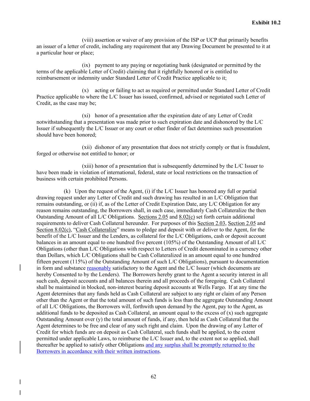 62 Exhibit 10.2 (viii) assertion or waiver of any provision of the ISP or UCP that primarily benefits an issuer of a letter of credit, including any requirement that any Drawing Document be presented to it at a particular hour or place; (ix) payment to any paying or negotiating bank (designated or permitted by the terms of the applicable Letter of Credit) claiming that it rightfully honored or is entitled to reimbursement or indemnity under Standard Letter of Credit Practice applicable to it; (x) acting or failing to act as required or permitted under Standard Letter of Credit Practice applicable to where the L/C Issuer has issued, confirmed, advised or negotiated such Letter of Credit, as the case may be; (xi) honor of a presentation after the expiration date of any Letter of Credit notwithstanding that a presentation was made prior to such expiration date and dishonored by the L/C Issuer if subsequently the L/C Issuer or any court or other finder of fact determines such presentation should have been honored; (xii) dishonor of any presentation that does not strictly comply or that is fraudulent, forged or otherwise not entitled to honor; or (xiii) honor of a presentation that is subsequently determined by the L/C Issuer to have been made in violation of international, federal, state or local restrictions on the transaction of business with certain prohibited Persons. (k) Upon the request of the Agent, (i) if the L/C Issuer has honored any full or partial drawing request under any Letter of Credit and such drawing has resulted in an L/C Obligation that remains outstanding, or (ii) if, as of the Letter of Credit Expiration Date, any L/C Obligation for any reason remains outstanding, the Borrowers shall, in each case, immediately Cash Collateralize the then Outstanding Amount of all L/C Obligations. Sections 2.05 and 8.02(c) set forth certain additional requirements to deliver Cash Collateral hereunder. For purposes of this Section 2.03, Section 2.05 and Section 8.02(c), “Cash Collateralize” means to pledge and deposit with or deliver to the Agent, for the benefit of the L/C Issuer and the Lenders, as collateral for the L/C Obligations, cash or deposit account balances in an amount equal to one hundred five percent (105%) of the Outstanding Amount of all L/C Obligations (other than L/C Obligations with respect to Letters of Credit denominated in a currency other than Dollars, which L/C Obligations shall be Cash Collateralized in an amount equal to one hundred fifteen percent (115%) of the Outstanding Amount of such L/C Obligations), pursuant to documentation in form and substance reasonably satisfactory to the Agent and the L/C Issuer (which documents are hereby Consented to by the Lenders). The Borrowers hereby grant to the Agent a security interest in all such cash, deposit accounts and all balances therein and all proceeds of the foregoing. Cash Collateral shall be maintained in blocked, non-interest bearing deposit accounts at Wells Fargo. If at any time the Agent determines that any funds held as Cash Collateral are subject to any right or claim of any Person other than the Agent or that the total amount of such funds is less than the aggregate Outstanding Amount of all L/C Obligations, the Borrowers will, forthwith upon demand by the Agent, pay to the Agent, as additional funds to be deposited as Cash Collateral, an amount equal to the excess of (x) such aggregate Outstanding Amount over (y) the total amount of funds, if any, then held as Cash Collateral that the Agent determines to be free and clear of any such right and claim. Upon the drawing of any Letter of Credit for which funds are on deposit as Cash Collateral, such funds shall be applied, to the extent permitted under applicable Laws, to reimburse the L/C Issuer and, to the extent not so applied, shall thereafter be applied to satisfy other Obligations and any surplus shall be promptly returned to the Borrowers in accordance with their written instructions.