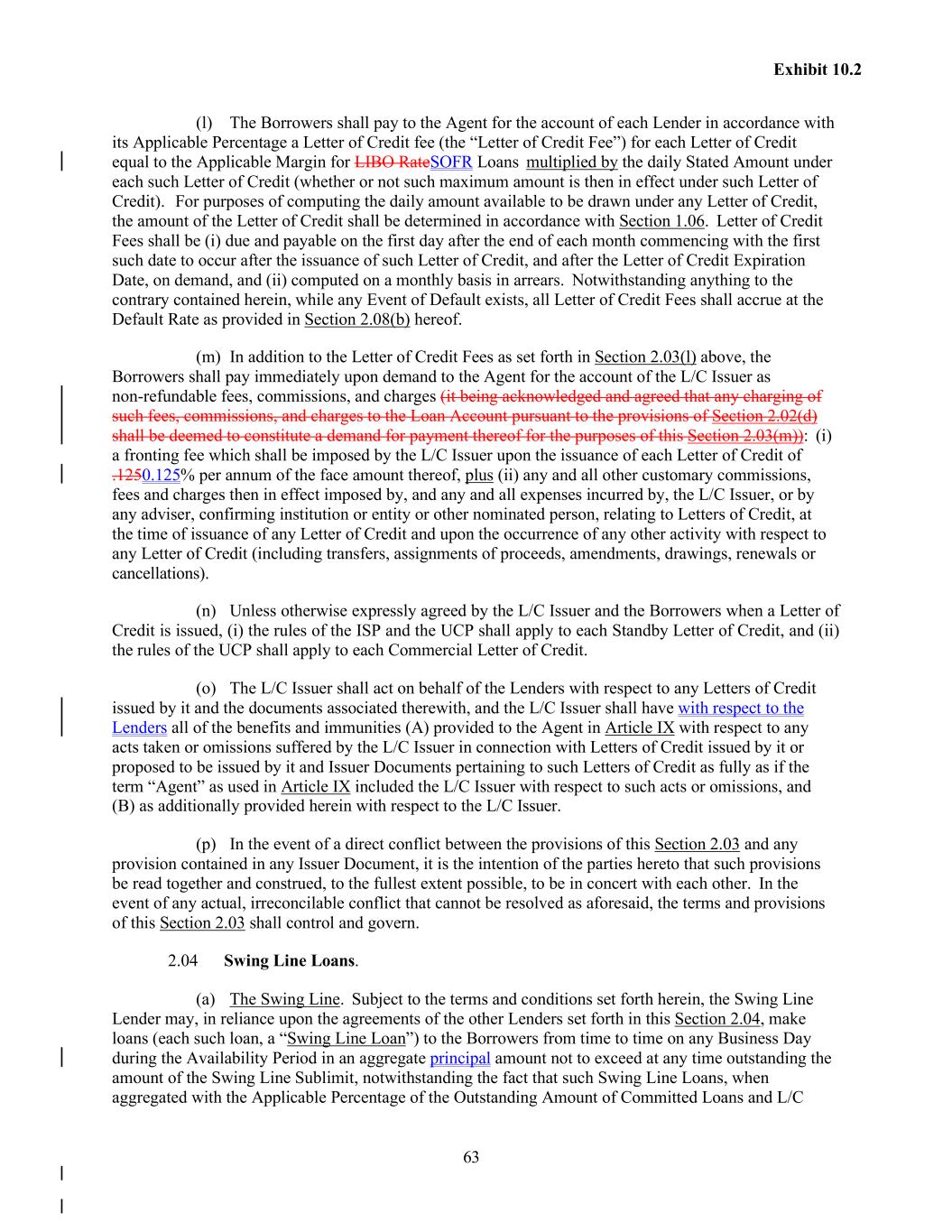 63 Exhibit 10.2 (l) The Borrowers shall pay to the Agent for the account of each Lender in accordance with its Applicable Percentage a Letter of Credit fee (the “Letter of Credit Fee”) for each Letter of Credit equal to the Applicable Margin for LIBO RateSOFR Loans multiplied by the daily Stated Amount under each such Letter of Credit (whether or not such maximum amount is then in effect under such Letter of Credit). For purposes of computing the daily amount available to be drawn under any Letter of Credit, the amount of the Letter of Credit shall be determined in accordance with Section 1.06. Letter of Credit Fees shall be (i) due and payable on the first day after the end of each month commencing with the first such date to occur after the issuance of such Letter of Credit, and after the Letter of Credit Expiration Date, on demand, and (ii) computed on a monthly basis in arrears. Notwithstanding anything to the contrary contained herein, while any Event of Default exists, all Letter of Credit Fees shall accrue at the Default Rate as provided in Section 2.08(b) hereof. (m) In addition to the Letter of Credit Fees as set forth in Section 2.03(l) above, the Borrowers shall pay immediately upon demand to the Agent for the account of the L/C Issuer as non-refundable fees, commissions, and charges (it being acknowledged and agreed that any charging of such fees, commissions, and charges to the Loan Account pursuant to the provisions of Section 2.02(d) shall be deemed to constitute a demand for payment thereof for the purposes of this Section 2.03(m)): (i) a fronting fee which shall be imposed by the L/C Issuer upon the issuance of each Letter of Credit of .1250.125% per annum of the face amount thereof, plus (ii) any and all other customary commissions, fees and charges then in effect imposed by, and any and all expenses incurred by, the L/C Issuer, or by any adviser, confirming institution or entity or other nominated person, relating to Letters of Credit, at the time of issuance of any Letter of Credit and upon the occurrence of any other activity with respect to any Letter of Credit (including transfers, assignments of proceeds, amendments, drawings, renewals or cancellations). (n) Unless otherwise expressly agreed by the L/C Issuer and the Borrowers when a Letter of Credit is issued, (i) the rules of the ISP and the UCP shall apply to each Standby Letter of Credit, and (ii) the rules of the UCP shall apply to each Commercial Letter of Credit. (o) The L/C Issuer shall act on behalf of the Lenders with respect to any Letters of Credit issued by it and the documents associated therewith, and the L/C Issuer shall have with respect to the Lenders all of the benefits and immunities (A) provided to the Agent in Article IX with respect to any acts taken or omissions suffered by the L/C Issuer in connection with Letters of Credit issued by it or proposed to be issued by it and Issuer Documents pertaining to such Letters of Credit as fully as if the term “Agent” as used in Article IX included the L/C Issuer with respect to such acts or omissions, and (B) as additionally provided herein with respect to the L/C Issuer. (p) In the event of a direct conflict between the provisions of this Section 2.03 and any provision contained in any Issuer Document, it is the intention of the parties hereto that such provisions be read together and construed, to the fullest extent possible, to be in concert with each other. In the event of any actual, irreconcilable conflict that cannot be resolved as aforesaid, the terms and provisions of this Section 2.03 shall control and govern. 2.04 Swing Line Loans. (a) The Swing Line. Subject to the terms and conditions set forth herein, the Swing Line Lender may, in reliance upon the agreements of the other Lenders set forth in this Section 2.04, make loans (each such loan, a “Swing Line Loan”) to the Borrowers from time to time on any Business Day during the Availability Period in an aggregate principal amount not to exceed at any time outstanding the amount of the Swing Line Sublimit, notwithstanding the fact that such Swing Line Loans, when aggregated with the Applicable Percentage of the Outstanding Amount of Committed Loans and L/C