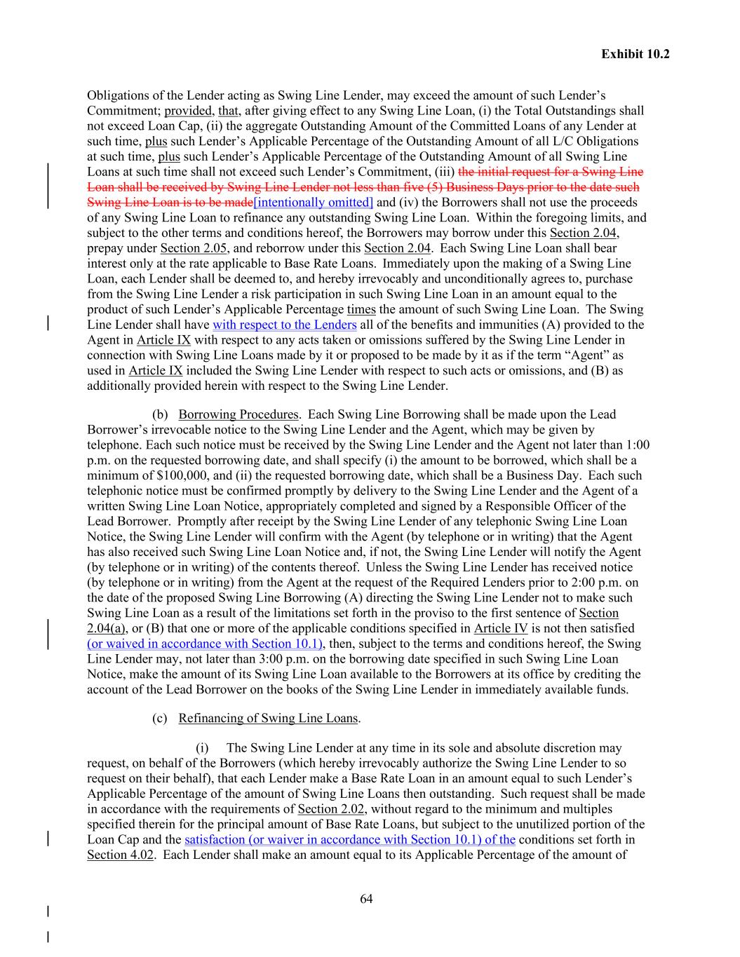 64 Exhibit 10.2 Obligations of the Lender acting as Swing Line Lender, may exceed the amount of such Lender’s Commitment; provided, that, after giving effect to any Swing Line Loan, (i) the Total Outstandings shall not exceed Loan Cap, (ii) the aggregate Outstanding Amount of the Committed Loans of any Lender at such time, plus such Lender’s Applicable Percentage of the Outstanding Amount of all L/C Obligations at such time, plus such Lender’s Applicable Percentage of the Outstanding Amount of all Swing Line Loans at such time shall not exceed such Lender’s Commitment, (iii) the initial request for a Swing Line Loan shall be received by Swing Line Lender not less than five (5) Business Days prior to the date such Swing Line Loan is to be made[intentionally omitted] and (iv) the Borrowers shall not use the proceeds of any Swing Line Loan to refinance any outstanding Swing Line Loan. Within the foregoing limits, and subject to the other terms and conditions hereof, the Borrowers may borrow under this Section 2.04, prepay under Section 2.05, and reborrow under this Section 2.04. Each Swing Line Loan shall bear interest only at the rate applicable to Base Rate Loans. Immediately upon the making of a Swing Line Loan, each Lender shall be deemed to, and hereby irrevocably and unconditionally agrees to, purchase from the Swing Line Lender a risk participation in such Swing Line Loan in an amount equal to the product of such Lender’s Applicable Percentage times the amount of such Swing Line Loan. The Swing Line Lender shall have with respect to the Lenders all of the benefits and immunities (A) provided to the Agent in Article IX with respect to any acts taken or omissions suffered by the Swing Line Lender in connection with Swing Line Loans made by it or proposed to be made by it as if the term “Agent” as used in Article IX included the Swing Line Lender with respect to such acts or omissions, and (B) as additionally provided herein with respect to the Swing Line Lender. (b) Borrowing Procedures. Each Swing Line Borrowing shall be made upon the Lead Borrower’s irrevocable notice to the Swing Line Lender and the Agent, which may be given by telephone. Each such notice must be received by the Swing Line Lender and the Agent not later than 1:00 p.m. on the requested borrowing date, and shall specify (i) the amount to be borrowed, which shall be a minimum of $100,000, and (ii) the requested borrowing date, which shall be a Business Day. Each such telephonic notice must be confirmed promptly by delivery to the Swing Line Lender and the Agent of a written Swing Line Loan Notice, appropriately completed and signed by a Responsible Officer of the Lead Borrower. Promptly after receipt by the Swing Line Lender of any telephonic Swing Line Loan Notice, the Swing Line Lender will confirm with the Agent (by telephone or in writing) that the Agent has also received such Swing Line Loan Notice and, if not, the Swing Line Lender will notify the Agent (by telephone or in writing) of the contents thereof. Unless the Swing Line Lender has received notice (by telephone or in writing) from the Agent at the request of the Required Lenders prior to 2:00 p.m. on the date of the proposed Swing Line Borrowing (A) directing the Swing Line Lender not to make such Swing Line Loan as a result of the limitations set forth in the proviso to the first sentence of Section 2.04(a), or (B) that one or more of the applicable conditions specified in Article IV is not then satisfied (or waived in accordance with Section 10.1), then, subject to the terms and conditions hereof, the Swing Line Lender may, not later than 3:00 p.m. on the borrowing date specified in such Swing Line Loan Notice, make the amount of its Swing Line Loan available to the Borrowers at its office by crediting the account of the Lead Borrower on the books of the Swing Line Lender in immediately available funds. (c) Refinancing of Swing Line Loans. (i) The Swing Line Lender at any time in its sole and absolute discretion may request, on behalf of the Borrowers (which hereby irrevocably authorize the Swing Line Lender to so request on their behalf), that each Lender make a Base Rate Loan in an amount equal to such Lender’s Applicable Percentage of the amount of Swing Line Loans then outstanding. Such request shall be made in accordance with the requirements of Section 2.02, without regard to the minimum and multiples specified therein for the principal amount of Base Rate Loans, but subject to the unutilized portion of the Loan Cap and the satisfaction (or waiver in accordance with Section 10.1) of the conditions set forth in Section 4.02. Each Lender shall make an amount equal to its Applicable Percentage of the amount of