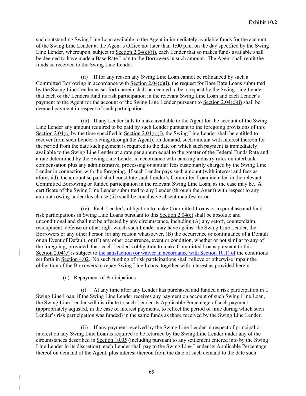 65 Exhibit 10.2 such outstanding Swing Line Loan available to the Agent in immediately available funds for the account of the Swing Line Lender at the Agent’s Office not later than 1:00 p.m. on the day specified by the Swing Line Lender, whereupon, subject to Section 2.04(c)(ii), each Lender that so makes funds available shall be deemed to have made a Base Rate Loan to the Borrowers in such amount. The Agent shall remit the funds so received to the Swing Line Lender. (ii) If for any reason any Swing Line Loan cannot be refinanced by such a Committed Borrowing in accordance with Section 2.04(c)(i), the request for Base Rate Loans submitted by the Swing Line Lender as set forth herein shall be deemed to be a request by the Swing Line Lender that each of the Lenders fund its risk participation in the relevant Swing Line Loan and each Lender’s payment to the Agent for the account of the Swing Line Lender pursuant to Section 2.04(c)(i) shall be deemed payment in respect of such participation. (iii) If any Lender fails to make available to the Agent for the account of the Swing Line Lender any amount required to be paid by such Lender pursuant to the foregoing provisions of this Section 2.04(c) by the time specified in Section 2.04(c)(i), the Swing Line Lender shall be entitled to recover from such Lender (acting through the Agent), on demand, such amount with interest thereon for the period from the date such payment is required to the date on which such payment is immediately available to the Swing Line Lender at a rate per annum equal to the greater of the Federal Funds Rate and a rate determined by the Swing Line Lender in accordance with banking industry rules on interbank compensation plus any administrative, processing or similar fees customarily charged by the Swing Line Lender in connection with the foregoing. If such Lender pays such amount (with interest and fees as aforesaid), the amount so paid shall constitute such Lender’s Committed Loan included in the relevant Committed Borrowing or funded participation in the relevant Swing Line Loan, as the case may be. A certificate of the Swing Line Lender submitted to any Lender (through the Agent) with respect to any amounts owing under this clause (iii) shall be conclusive absent manifest error. (iv) Each Lender’s obligation to make Committed Loans or to purchase and fund risk participations in Swing Line Loans pursuant to this Section 2.04(c) shall be absolute and unconditional and shall not be affected by any circumstance, including (A) any setoff, counterclaim, recoupment, defense or other right which such Lender may have against the Swing Line Lender, the Borrowers or any other Person for any reason whatsoever, (B) the occurrence or continuance of a Default or an Event of Default, or (C) any other occurrence, event or condition, whether or not similar to any of the foregoing; provided, that, each Lender’s obligation to make Committed Loans pursuant to this Section 2.04(c) is subject to the satisfaction (or waiver in accordance with Section 10.1) of the conditions set forth in Section 4.02. No such funding of risk participations shall relieve or otherwise impair the obligation of the Borrowers to repay Swing Line Loans, together with interest as provided herein. (d) Repayment of Participations. (i) At any time after any Lender has purchased and funded a risk participation in a Swing Line Loan, if the Swing Line Lender receives any payment on account of such Swing Line Loan, the Swing Line Lender will distribute to such Lender its Applicable Percentage of such payment (appropriately adjusted, in the case of interest payments, to reflect the period of time during which such Lender’s risk participation was funded) in the same funds as those received by the Swing Line Lender. (ii) If any payment received by the Swing Line Lender in respect of principal or interest on any Swing Line Loan is required to be returned by the Swing Line Lender under any of the circumstances described in Section 10.05 (including pursuant to any settlement entered into by the Swing Line Lender in its discretion), each Lender shall pay to the Swing Line Lender its Applicable Percentage thereof on demand of the Agent, plus interest thereon from the date of such demand to the date such