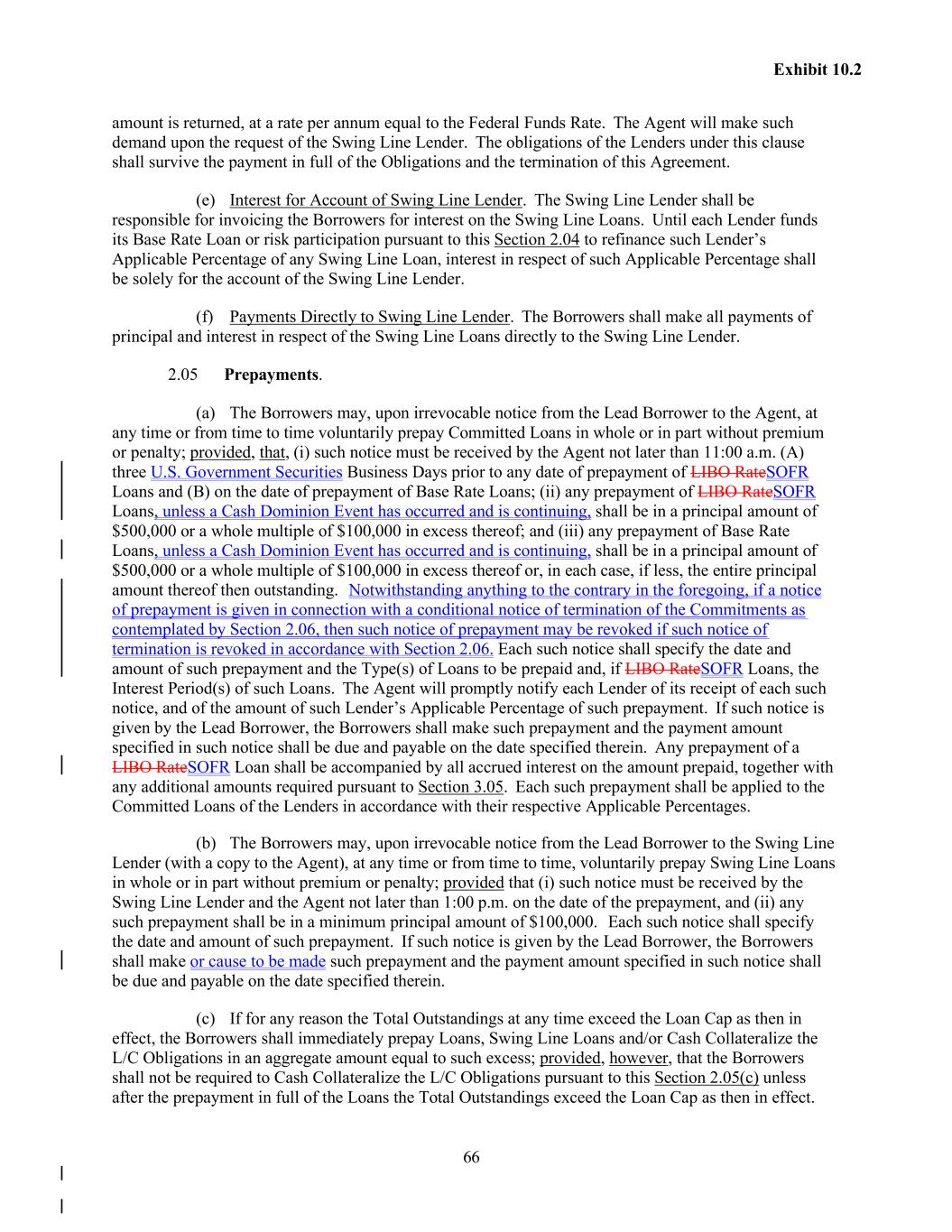 66 Exhibit 10.2 amount is returned, at a rate per annum equal to the Federal Funds Rate. The Agent will make such demand upon the request of the Swing Line Lender. The obligations of the Lenders under this clause shall survive the payment in full of the Obligations and the termination of this Agreement. (e) Interest for Account of Swing Line Lender. The Swing Line Lender shall be responsible for invoicing the Borrowers for interest on the Swing Line Loans. Until each Lender funds its Base Rate Loan or risk participation pursuant to this Section 2.04 to refinance such Lender’s Applicable Percentage of any Swing Line Loan, interest in respect of such Applicable Percentage shall be solely for the account of the Swing Line Lender. (f) Payments Directly to Swing Line Lender. The Borrowers shall make all payments of principal and interest in respect of the Swing Line Loans directly to the Swing Line Lender. 2.05 Prepayments. (a) The Borrowers may, upon irrevocable notice from the Lead Borrower to the Agent, at any time or from time to time voluntarily prepay Committed Loans in whole or in part without premium or penalty; provided, that, (i) such notice must be received by the Agent not later than 11:00 a.m. (A) three U.S. Government Securities Business Days prior to any date of prepayment of LIBO RateSOFR Loans and (B) on the date of prepayment of Base Rate Loans; (ii) any prepayment of LIBO RateSOFR Loans, unless a Cash Dominion Event has occurred and is continuing, shall be in a principal amount of $500,000 or a whole multiple of $100,000 in excess thereof; and (iii) any prepayment of Base Rate Loans, unless a Cash Dominion Event has occurred and is continuing, shall be in a principal amount of $500,000 or a whole multiple of $100,000 in excess thereof or, in each case, if less, the entire principal amount thereof then outstanding. Notwithstanding anything to the contrary in the foregoing, if a notice of prepayment is given in connection with a conditional notice of termination of the Commitments as contemplated by Section 2.06, then such notice of prepayment may be revoked if such notice of termination is revoked in accordance with Section 2.06. Each such notice shall specify the date and amount of such prepayment and the Type(s) of Loans to be prepaid and, if LIBO RateSOFR Loans, the Interest Period(s) of such Loans. The Agent will promptly notify each Lender of its receipt of each such notice, and of the amount of such Lender’s Applicable Percentage of such prepayment. If such notice is given by the Lead Borrower, the Borrowers shall make such prepayment and the payment amount specified in such notice shall be due and payable on the date specified therein. Any prepayment of a LIBO RateSOFR Loan shall be accompanied by all accrued interest on the amount prepaid, together with any additional amounts required pursuant to Section 3.05. Each such prepayment shall be applied to the Committed Loans of the Lenders in accordance with their respective Applicable Percentages. (b) The Borrowers may, upon irrevocable notice from the Lead Borrower to the Swing Line Lender (with a copy to the Agent), at any time or from time to time, voluntarily prepay Swing Line Loans in whole or in part without premium or penalty; provided that (i) such notice must be received by the Swing Line Lender and the Agent not later than 1:00 p.m. on the date of the prepayment, and (ii) any such prepayment shall be in a minimum principal amount of $100,000. Each such notice shall specify the date and amount of such prepayment. If such notice is given by the Lead Borrower, the Borrowers shall make or cause to be made such prepayment and the payment amount specified in such notice shall be due and payable on the date specified therein. (c) If for any reason the Total Outstandings at any time exceed the Loan Cap as then in effect, the Borrowers shall immediately prepay Loans, Swing Line Loans and/or Cash Collateralize the L/C Obligations in an aggregate amount equal to such excess; provided, however, that the Borrowers shall not be required to Cash Collateralize the L/C Obligations pursuant to this Section 2.05(c) unless after the prepayment in full of the Loans the Total Outstandings exceed the Loan Cap as then in effect.