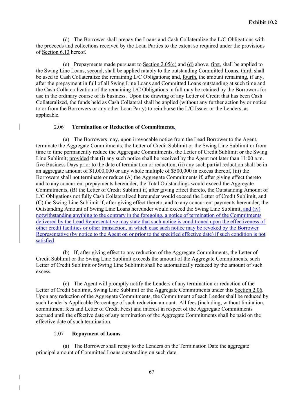 67 Exhibit 10.2 (d) The Borrower shall prepay the Loans and Cash Collateralize the L/C Obligations with the proceeds and collections received by the Loan Parties to the extent so required under the provisions of Section 6.13 hereof. (e) Prepayments made pursuant to Section 2.05(c) and (d) above, first, shall be applied to the Swing Line Loans, second, shall be applied ratably to the outstanding Committed Loans, third, shall be used to Cash Collateralize the remaining L/C Obligations; and, fourth, the amount remaining, if any, after the prepayment in full of all Swing Line Loans and Committed Loans outstanding at such time and the Cash Collateralization of the remaining L/C Obligations in full may be retained by the Borrowers for use in the ordinary course of its business. Upon the drawing of any Letter of Credit that has been Cash Collateralized, the funds held as Cash Collateral shall be applied (without any further action by or notice to or from the Borrowers or any other Loan Party) to reimburse the L/C Issuer or the Lenders, as applicable. 2.06 Termination or Reduction of Commitments. (a) The Borrowers may, upon irrevocable notice from the Lead Borrower to the Agent, terminate the Aggregate Commitments, the Letter of Credit Sublimit or the Swing Line Sublimit or from time to time permanently reduce the Aggregate Commitments, the Letter of Credit Sublimit or the Swing Line Sublimit; provided that (i) any such notice shall be received by the Agent not later than 11:00 a.m. five Business Days prior to the date of termination or reduction, (ii) any such partial reduction shall be in an aggregate amount of $1,000,000 or any whole multiple of $500,000 in excess thereof, (iii) the Borrowers shall not terminate or reduce (A) the Aggregate Commitments if, after giving effect thereto and to any concurrent prepayments hereunder, the Total Outstandings would exceed the Aggregate Commitments, (B) the Letter of Credit Sublimit if, after giving effect thereto, the Outstanding Amount of L/C Obligations not fully Cash Collateralized hereunder would exceed the Letter of Credit Sublimit, and (C) the Swing Line Sublimit if, after giving effect thereto, and to any concurrent payments hereunder, the Outstanding Amount of Swing Line Loans hereunder would exceed the Swing Line Sublimit, and (iv) notwithstanding anything to the contrary in the foregoing, a notice of termination of the Commitments delivered by the Lead Representative may state that such notice is conditioned upon the effectiveness of other credit facilities or other transaction, in which case such notice may be revoked by the Borrower Representative (by notice to the Agent on or prior to the specified effective date) if such condition is not satisfied. (b) If, after giving effect to any reduction of the Aggregate Commitments, the Letter of Credit Sublimit or the Swing Line Sublimit exceeds the amount of the Aggregate Commitments, such Letter of Credit Sublimit or Swing Line Sublimit shall be automatically reduced by the amount of such excess. (c) The Agent will promptly notify the Lenders of any termination or reduction of the Letter of Credit Sublimit, Swing Line Sublimit or the Aggregate Commitments under this Section 2.06. Upon any reduction of the Aggregate Commitments, the Commitment of each Lender shall be reduced by such Lender’s Applicable Percentage of such reduction amount. All fees (including, without limitation, commitment fees and Letter of Credit Fees) and interest in respect of the Aggregate Commitments accrued until the effective date of any termination of the Aggregate Commitments shall be paid on the effective date of such termination. 2.07 Repayment of Loans. (a) The Borrower shall repay to the Lenders on the Termination Date the aggregate principal amount of Committed Loans outstanding on such date.