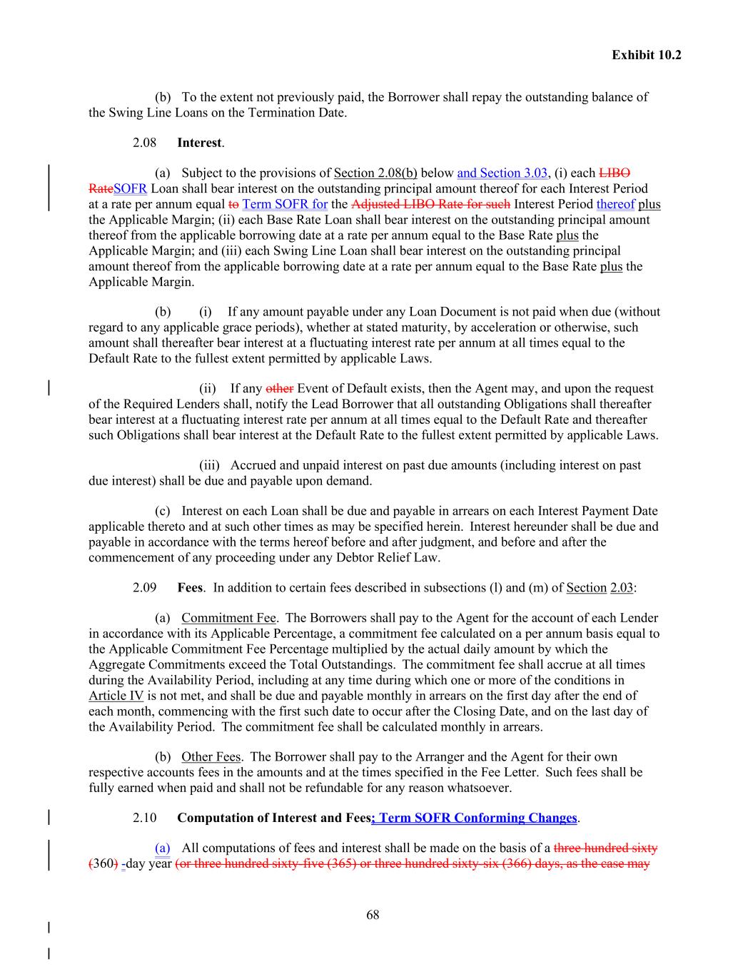 68 Exhibit 10.2 (b) To the extent not previously paid, the Borrower shall repay the outstanding balance of the Swing Line Loans on the Termination Date. 2.08 Interest. (a) Subject to the provisions of Section 2.08(b) below and Section 3.03, (i) each LIBO RateSOFR Loan shall bear interest on the outstanding principal amount thereof for each Interest Period at a rate per annum equal to Term SOFR for the Adjusted LIBO Rate for such Interest Period thereof plus the Applicable Margin; (ii) each Base Rate Loan shall bear interest on the outstanding principal amount thereof from the applicable borrowing date at a rate per annum equal to the Base Rate plus the Applicable Margin; and (iii) each Swing Line Loan shall bear interest on the outstanding principal amount thereof from the applicable borrowing date at a rate per annum equal to the Base Rate plus the Applicable Margin. (b) (i) If any amount payable under any Loan Document is not paid when due (without regard to any applicable grace periods), whether at stated maturity, by acceleration or otherwise, such amount shall thereafter bear interest at a fluctuating interest rate per annum at all times equal to the Default Rate to the fullest extent permitted by applicable Laws. (ii) If any other Event of Default exists, then the Agent may, and upon the request of the Required Lenders shall, notify the Lead Borrower that all outstanding Obligations shall thereafter bear interest at a fluctuating interest rate per annum at all times equal to the Default Rate and thereafter such Obligations shall bear interest at the Default Rate to the fullest extent permitted by applicable Laws. (iii) Accrued and unpaid interest on past due amounts (including interest on past due interest) shall be due and payable upon demand. (c) Interest on each Loan shall be due and payable in arrears on each Interest Payment Date applicable thereto and at such other times as may be specified herein. Interest hereunder shall be due and payable in accordance with the terms hereof before and after judgment, and before and after the commencement of any proceeding under any Debtor Relief Law. 2.09 Fees. In addition to certain fees described in subsections (l) and (m) of Section 2.03: (a) Commitment Fee. The Borrowers shall pay to the Agent for the account of each Lender in accordance with its Applicable Percentage, a commitment fee calculated on a per annum basis equal to the Applicable Commitment Fee Percentage multiplied by the actual daily amount by which the Aggregate Commitments exceed the Total Outstandings. The commitment fee shall accrue at all times during the Availability Period, including at any time during which one or more of the conditions in Article IV is not met, and shall be due and payable monthly in arrears on the first day after the end of each month, commencing with the first such date to occur after the Closing Date, and on the last day of the Availability Period. The commitment fee shall be calculated monthly in arrears. (b) Other Fees. The Borrower shall pay to the Arranger and the Agent for their own respective accounts fees in the amounts and at the times specified in the Fee Letter. Such fees shall be fully earned when paid and shall not be refundable for any reason whatsoever. 2.10 Computation of Interest and Fees; Term SOFR Conforming Changes. (a) All computations of fees and interest shall be made on the basis of a three hundred sixty (360) -day year (or three hundred sixty-five (365) or three hundred sixty-six (366) days, as the case may