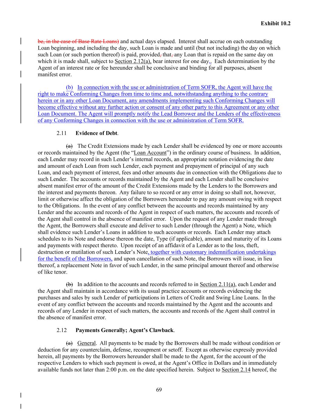 69 Exhibit 10.2 be, in the case of Base Rate Loans) and actual days elapsed. Interest shall accrue on each outstanding Loan beginning, and including the day, such Loan is made and until (but not including) the day on which such Loan (or such portion thereof) is paid, provided, that, any Loan that is repaid on the same day on which it is made shall, subject to Section 2.12(a), bear interest for one day,. Each determination by the Agent of an interest rate or fee hereunder shall be conclusive and binding for all purposes, absent manifest error. (b) In connection with the use or administration of Term SOFR, the Agent will have the right to make Conforming Changes from time to time and, notwithstanding anything to the contrary herein or in any other Loan Document, any amendments implementing such Conforming Changes will become effective without any further action or consent of any other party to this Agreement or any other Loan Document. The Agent will promptly notify the Lead Borrower and the Lenders of the effectiveness of any Conforming Changes in connection with the use or administration of Term SOFR. 2.11 Evidence of Debt. (a) The Credit Extensions made by each Lender shall be evidenced by one or more accounts or records maintained by the Agent (the “Loan Account”) in the ordinary course of business. In addition, each Lender may record in such Lender’s internal records, an appropriate notation evidencing the date and amount of each Loan from such Lender, each payment and prepayment of principal of any such Loan, and each payment of interest, fees and other amounts due in connection with the Obligations due to such Lender. The accounts or records maintained by the Agent and each Lender shall be conclusive absent manifest error of the amount of the Credit Extensions made by the Lenders to the Borrowers and the interest and payments thereon. Any failure to so record or any error in doing so shall not, however, limit or otherwise affect the obligation of the Borrowers hereunder to pay any amount owing with respect to the Obligations. In the event of any conflict between the accounts and records maintained by any Lender and the accounts and records of the Agent in respect of such matters, the accounts and records of the Agent shall control in the absence of manifest error. Upon the request of any Lender made through the Agent, the Borrowers shall execute and deliver to such Lender (through the Agent) a Note, which shall evidence such Lender’s Loans in addition to such accounts or records. Each Lender may attach schedules to its Note and endorse thereon the date, Type (if applicable), amount and maturity of its Loans and payments with respect thereto. Upon receipt of an affidavit of a Lender as to the loss, theft, destruction or mutilation of such Lender’s Note, together with customary indemnification undertakings for the benefit of the Borrowers, and upon cancellation of such Note, the Borrowers will issue, in lieu thereof, a replacement Note in favor of such Lender, in the same principal amount thereof and otherwise of like tenor. (b) In addition to the accounts and records referred to in Section 2.11(a), each Lender and the Agent shall maintain in accordance with its usual practice accounts or records evidencing the purchases and sales by such Lender of participations in Letters of Credit and Swing Line Loans. In the event of any conflict between the accounts and records maintained by the Agent and the accounts and records of any Lender in respect of such matters, the accounts and records of the Agent shall control in the absence of manifest error. 2.12 Payments Generally; Agent’s Clawback. (a) General. All payments to be made by the Borrowers shall be made without condition or deduction for any counterclaim, defense, recoupment or setoff. Except as otherwise expressly provided herein, all payments by the Borrowers hereunder shall be made to the Agent, for the account of the respective Lenders to which such payment is owed, at the Agent’s Office in Dollars and in immediately available funds not later than 2:00 p.m. on the date specified herein. Subject to Section 2.14 hereof, the
