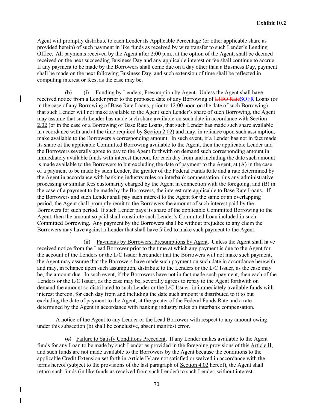 70 Exhibit 10.2 Agent will promptly distribute to each Lender its Applicable Percentage (or other applicable share as provided herein) of such payment in like funds as received by wire transfer to such Lender’s Lending Office. All payments received by the Agent after 2:00 p.m., at the option of the Agent, shall be deemed received on the next succeeding Business Day and any applicable interest or fee shall continue to accrue. If any payment to be made by the Borrowers shall come due on a day other than a Business Day, payment shall be made on the next following Business Day, and such extension of time shall be reflected in computing interest or fees, as the case may be. (b) (i) Funding by Lenders; Presumption by Agent. Unless the Agent shall have received notice from a Lender prior to the proposed date of any Borrowing of LIBO RateSOFR Loans (or in the case of any Borrowing of Base Rate Loans, prior to 12:00 noon on the date of such Borrowing) that such Lender will not make available to the Agent such Lender’s share of such Borrowing, the Agent may assume that such Lender has made such share available on such date in accordance with Section 2.02 (or in the case of a Borrowing of Base Rate Loans, that such Lender has made such share available in accordance with and at the time required by Section 2.02) and may, in reliance upon such assumption, make available to the Borrowers a corresponding amount. In such event, if a Lender has not in fact made its share of the applicable Committed Borrowing available to the Agent, then the applicable Lender and the Borrowers severally agree to pay to the Agent forthwith on demand such corresponding amount in immediately available funds with interest thereon, for each day from and including the date such amount is made available to the Borrowers to but excluding the date of payment to the Agent, at (A) in the case of a payment to be made by such Lender, the greater of the Federal Funds Rate and a rate determined by the Agent in accordance with banking industry rules on interbank compensation plus any administrative processing or similar fees customarily charged by the Agent in connection with the foregoing, and (B) in the case of a payment to be made by the Borrowers, the interest rate applicable to Base Rate Loans. If the Borrowers and such Lender shall pay such interest to the Agent for the same or an overlapping period, the Agent shall promptly remit to the Borrowers the amount of such interest paid by the Borrowers for such period. If such Lender pays its share of the applicable Committed Borrowing to the Agent, then the amount so paid shall constitute such Lender’s Committed Loan included in such Committed Borrowing. Any payment by the Borrowers shall be without prejudice to any claim the Borrowers may have against a Lender that shall have failed to make such payment to the Agent. (ii) Payments by Borrowers; Presumptions by Agent. Unless the Agent shall have received notice from the Lead Borrower prior to the time at which any payment is due to the Agent for the account of the Lenders or the L/C Issuer hereunder that the Borrowers will not make such payment, the Agent may assume that the Borrowers have made such payment on such date in accordance herewith and may, in reliance upon such assumption, distribute to the Lenders or the L/C Issuer, as the case may be, the amount due. In such event, if the Borrowers have not in fact made such payment, then each of the Lenders or the L/C Issuer, as the case may be, severally agrees to repay to the Agent forthwith on demand the amount so distributed to such Lender or the L/C Issuer, in immediately available funds with interest thereon, for each day from and including the date such amount is distributed to it to but excluding the date of payment to the Agent, at the greater of the Federal Funds Rate and a rate determined by the Agent in accordance with banking industry rules on interbank compensation. A notice of the Agent to any Lender or the Lead Borrower with respect to any amount owing under this subsection (b) shall be conclusive, absent manifest error. (c) Failure to Satisfy Conditions Precedent. If any Lender makes available to the Agent funds for any Loan to be made by such Lender as provided in the foregoing provisions of this Article II, and such funds are not made available to the Borrowers by the Agent because the conditions to the applicable Credit Extension set forth in Article IV are not satisfied or waived in accordance with the terms hereof (subject to the provisions of the last paragraph of Section 4.02 hereof), the Agent shall return such funds (in like funds as received from such Lender) to such Lender, without interest.