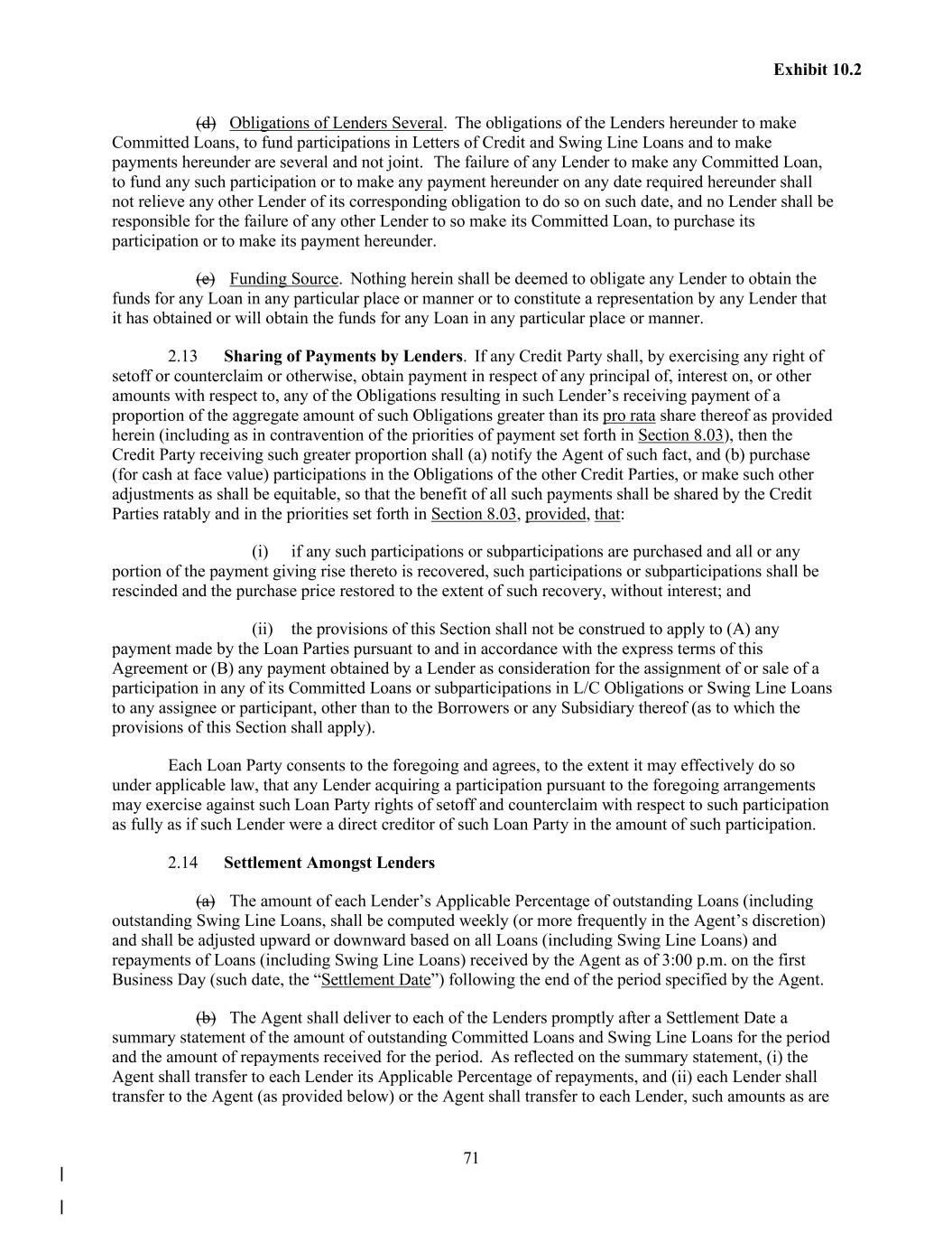 71 Exhibit 10.2 (d) Obligations of Lenders Several. The obligations of the Lenders hereunder to make Committed Loans, to fund participations in Letters of Credit and Swing Line Loans and to make payments hereunder are several and not joint. The failure of any Lender to make any Committed Loan, to fund any such participation or to make any payment hereunder on any date required hereunder shall not relieve any other Lender of its corresponding obligation to do so on such date, and no Lender shall be responsible for the failure of any other Lender to so make its Committed Loan, to purchase its participation or to make its payment hereunder. (e) Funding Source. Nothing herein shall be deemed to obligate any Lender to obtain the funds for any Loan in any particular place or manner or to constitute a representation by any Lender that it has obtained or will obtain the funds for any Loan in any particular place or manner. 2.13 Sharing of Payments by Lenders. If any Credit Party shall, by exercising any right of setoff or counterclaim or otherwise, obtain payment in respect of any principal of, interest on, or other amounts with respect to, any of the Obligations resulting in such Lender’s receiving payment of a proportion of the aggregate amount of such Obligations greater than its pro rata share thereof as provided herein (including as in contravention of the priorities of payment set forth in Section 8.03), then the Credit Party receiving such greater proportion shall (a) notify the Agent of such fact, and (b) purchase (for cash at face value) participations in the Obligations of the other Credit Parties, or make such other adjustments as shall be equitable, so that the benefit of all such payments shall be shared by the Credit Parties ratably and in the priorities set forth in Section 8.03, provided, that: (i) if any such participations or subparticipations are purchased and all or any portion of the payment giving rise thereto is recovered, such participations or subparticipations shall be rescinded and the purchase price restored to the extent of such recovery, without interest; and (ii) the provisions of this Section shall not be construed to apply to (A) any payment made by the Loan Parties pursuant to and in accordance with the express terms of this Agreement or (B) any payment obtained by a Lender as consideration for the assignment of or sale of a participation in any of its Committed Loans or subparticipations in L/C Obligations or Swing Line Loans to any assignee or participant, other than to the Borrowers or any Subsidiary thereof (as to which the provisions of this Section shall apply). Each Loan Party consents to the foregoing and agrees, to the extent it may effectively do so under applicable law, that any Lender acquiring a participation pursuant to the foregoing arrangements may exercise against such Loan Party rights of setoff and counterclaim with respect to such participation as fully as if such Lender were a direct creditor of such Loan Party in the amount of such participation. 2.14 Settlement Amongst Lenders (a) The amount of each Lender’s Applicable Percentage of outstanding Loans (including outstanding Swing Line Loans, shall be computed weekly (or more frequently in the Agent’s discretion) and shall be adjusted upward or downward based on all Loans (including Swing Line Loans) and repayments of Loans (including Swing Line Loans) received by the Agent as of 3:00 p.m. on the first Business Day (such date, the “Settlement Date”) following the end of the period specified by the Agent. (b) The Agent shall deliver to each of the Lenders promptly after a Settlement Date a summary statement of the amount of outstanding Committed Loans and Swing Line Loans for the period and the amount of repayments received for the period. As reflected on the summary statement, (i) the Agent shall transfer to each Lender its Applicable Percentage of repayments, and (ii) each Lender shall transfer to the Agent (as provided below) or the Agent shall transfer to each Lender, such amounts as are