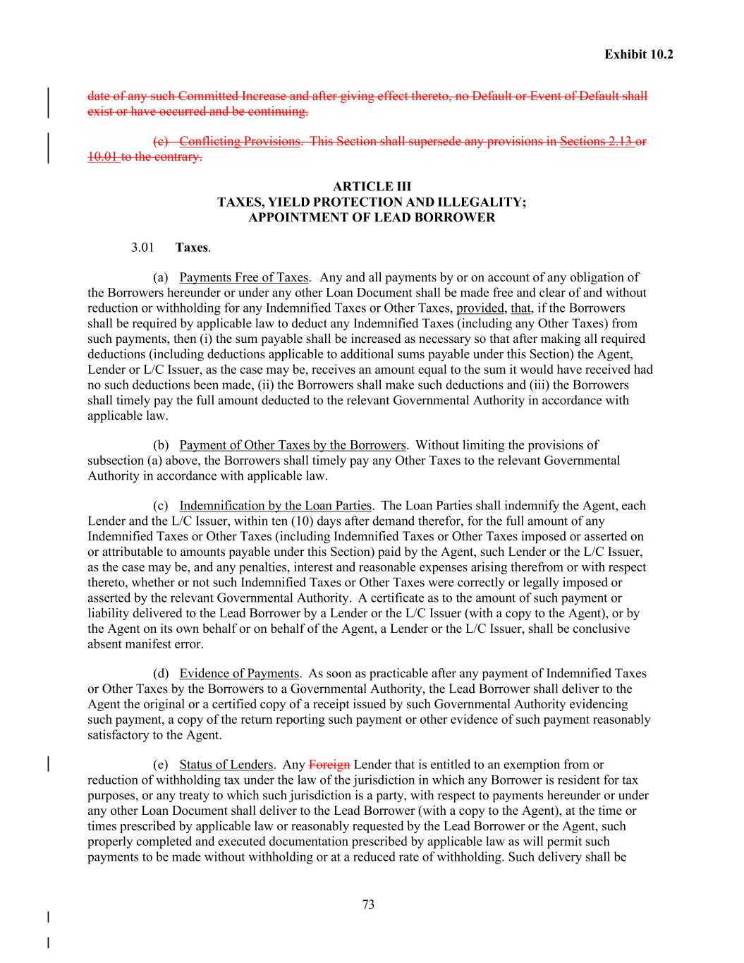 73 Exhibit 10.2 date of any such Committed Increase and after giving effect thereto, no Default or Event of Default shall exist or have occurred and be continuing. (c) Conflicting Provisions. This Section shall supersede any provisions in Sections 2.13 or 10.01 to the contrary. ARTICLE III TAXES, YIELD PROTECTION AND ILLEGALITY; APPOINTMENT OF LEAD BORROWER 3.01 Taxes. (a) Payments Free of Taxes. Any and all payments by or on account of any obligation of the Borrowers hereunder or under any other Loan Document shall be made free and clear of and without reduction or withholding for any Indemnified Taxes or Other Taxes, provided, that, if the Borrowers shall be required by applicable law to deduct any Indemnified Taxes (including any Other Taxes) from such payments, then (i) the sum payable shall be increased as necessary so that after making all required deductions (including deductions applicable to additional sums payable under this Section) the Agent, Lender or L/C Issuer, as the case may be, receives an amount equal to the sum it would have received had no such deductions been made, (ii) the Borrowers shall make such deductions and (iii) the Borrowers shall timely pay the full amount deducted to the relevant Governmental Authority in accordance with applicable law. (b) Payment of Other Taxes by the Borrowers. Without limiting the provisions of subsection (a) above, the Borrowers shall timely pay any Other Taxes to the relevant Governmental Authority in accordance with applicable law. (c) Indemnification by the Loan Parties. The Loan Parties shall indemnify the Agent, each Lender and the L/C Issuer, within ten (10) days after demand therefor, for the full amount of any Indemnified Taxes or Other Taxes (including Indemnified Taxes or Other Taxes imposed or asserted on or attributable to amounts payable under this Section) paid by the Agent, such Lender or the L/C Issuer, as the case may be, and any penalties, interest and reasonable expenses arising therefrom or with respect thereto, whether or not such Indemnified Taxes or Other Taxes were correctly or legally imposed or asserted by the relevant Governmental Authority. A certificate as to the amount of such payment or liability delivered to the Lead Borrower by a Lender or the L/C Issuer (with a copy to the Agent), or by the Agent on its own behalf or on behalf of the Agent, a Lender or the L/C Issuer, shall be conclusive absent manifest error. (d) Evidence of Payments. As soon as practicable after any payment of Indemnified Taxes or Other Taxes by the Borrowers to a Governmental Authority, the Lead Borrower shall deliver to the Agent the original or a certified copy of a receipt issued by such Governmental Authority evidencing such payment, a copy of the return reporting such payment or other evidence of such payment reasonably satisfactory to the Agent. (e) Status of Lenders. Any Foreign Lender that is entitled to an exemption from or reduction of withholding tax under the law of the jurisdiction in which any Borrower is resident for tax purposes, or any treaty to which such jurisdiction is a party, with respect to payments hereunder or under any other Loan Document shall deliver to the Lead Borrower (with a copy to the Agent), at the time or times prescribed by applicable law or reasonably requested by the Lead Borrower or the Agent, such properly completed and executed documentation prescribed by applicable law as will permit such payments to be made without withholding or at a reduced rate of withholding. Such delivery shall be