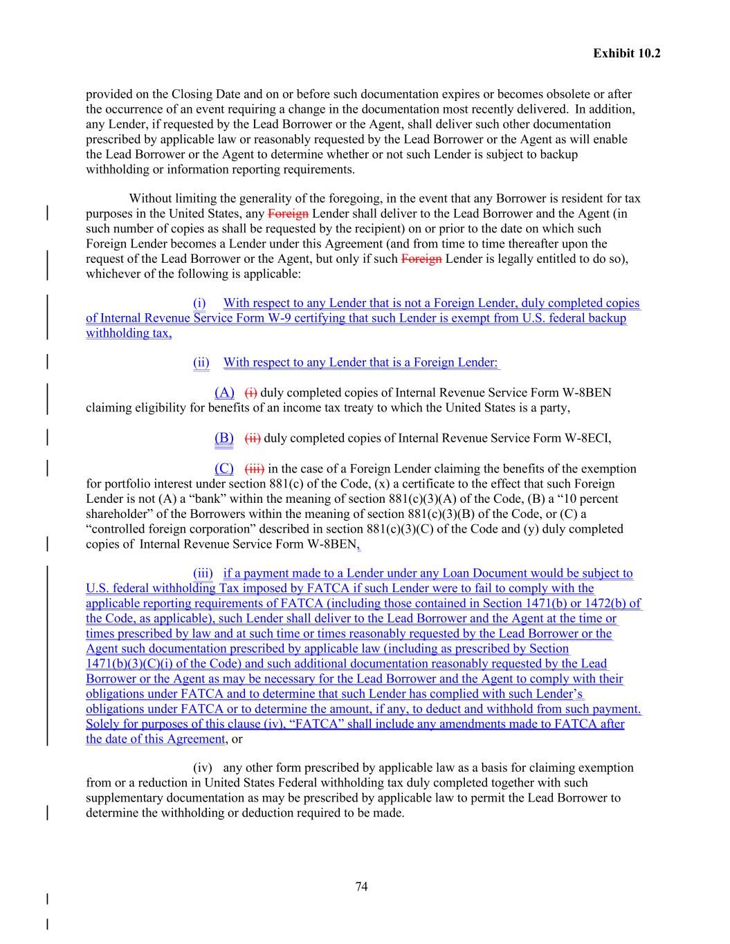 74 Exhibit 10.2 provided on the Closing Date and on or before such documentation expires or becomes obsolete or after the occurrence of an event requiring a change in the documentation most recently delivered. In addition, any Lender, if requested by the Lead Borrower or the Agent, shall deliver such other documentation prescribed by applicable law or reasonably requested by the Lead Borrower or the Agent as will enable the Lead Borrower or the Agent to determine whether or not such Lender is subject to backup withholding or information reporting requirements. Without limiting the generality of the foregoing, in the event that any Borrower is resident for tax purposes in the United States, any Foreign Lender shall deliver to the Lead Borrower and the Agent (in such number of copies as shall be requested by the recipient) on or prior to the date on which such Foreign Lender becomes a Lender under this Agreement (and from time to time thereafter upon the request of the Lead Borrower or the Agent, but only if such Foreign Lender is legally entitled to do so), whichever of the following is applicable: (i) With respect to any Lender that is not a Foreign Lender, duly completed copies of Internal Revenue Service Form W-9 certifying that such Lender is exempt from U.S. federal backup withholding tax, (ii) With respect to any Lender that is a Foreign Lender: (A) (i) duly completed copies of Internal Revenue Service Form W-8BEN claiming eligibility for benefits of an income tax treaty to which the United States is a party, (B) (ii) duly completed copies of Internal Revenue Service Form W-8ECI, (C) (iii) in the case of a Foreign Lender claiming the benefits of the exemption for portfolio interest under section 881(c) of the Code, (x) a certificate to the effect that such Foreign Lender is not (A) a “bank” within the meaning of section 881(c)(3)(A) of the Code, (B) a “10 percent shareholder” of the Borrowers within the meaning of section 881(c)(3)(B) of the Code, or (C) a “controlled foreign corporation” described in section 881(c)(3)(C) of the Code and (y) duly completed copies of Internal Revenue Service Form W-8BEN, (iii) if a payment made to a Lender under any Loan Document would be subject to U.S. federal withholding Tax imposed by FATCA if such Lender were to fail to comply with the applicable reporting requirements of FATCA (including those contained in Section 1471(b) or 1472(b) of the Code, as applicable), such Lender shall deliver to the Lead Borrower and the Agent at the time or times prescribed by law and at such time or times reasonably requested by the Lead Borrower or the Agent such documentation prescribed by applicable law (including as prescribed by Section 1471(b)(3)(C)(i) of the Code) and such additional documentation reasonably requested by the Lead Borrower or the Agent as may be necessary for the Lead Borrower and the Agent to comply with their obligations under FATCA and to determine that such Lender has complied with such Lender’s obligations under FATCA or to determine the amount, if any, to deduct and withhold from such payment. Solely for purposes of this clause (iv), “FATCA” shall include any amendments made to FATCA after the date of this Agreement, or (iv) any other form prescribed by applicable law as a basis for claiming exemption from or a reduction in United States Federal withholding tax duly completed together with such supplementary documentation as may be prescribed by applicable law to permit the Lead Borrower to determine the withholding or deduction required to be made.
