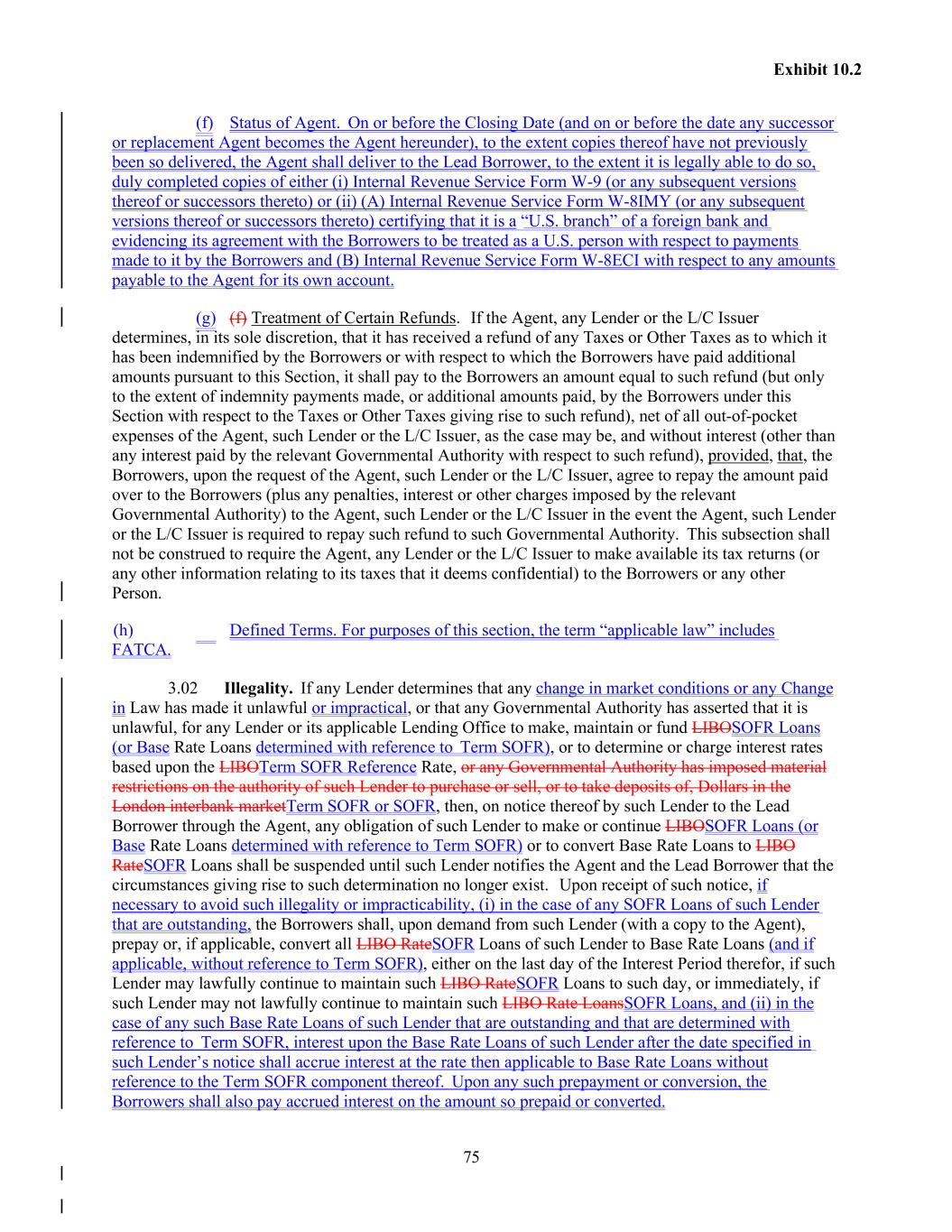 75 Exhibit 10.2 (f) Status of Agent. On or before the Closing Date (and on or before the date any successor or replacement Agent becomes the Agent hereunder), to the extent copies thereof have not previously been so delivered, the Agent shall deliver to the Lead Borrower, to the extent it is legally able to do so, duly completed copies of either (i) Internal Revenue Service Form W-9 (or any subsequent versions thereof or successors thereto) or (ii) (A) Internal Revenue Service Form W-8IMY (or any subsequent versions thereof or successors thereto) certifying that it is a “U.S. branch” of a foreign bank and evidencing its agreement with the Borrowers to be treated as a U.S. person with respect to payments made to it by the Borrowers and (B) Internal Revenue Service Form W-8ECI with respect to any amounts payable to the Agent for its own account. (g) (f) Treatment of Certain Refunds. If the Agent, any Lender or the L/C Issuer determines, in its sole discretion, that it has received a refund of any Taxes or Other Taxes as to which it has been indemnified by the Borrowers or with respect to which the Borrowers have paid additional amounts pursuant to this Section, it shall pay to the Borrowers an amount equal to such refund (but only to the extent of indemnity payments made, or additional amounts paid, by the Borrowers under this Section with respect to the Taxes or Other Taxes giving rise to such refund), net of all out-of-pocket expenses of the Agent, such Lender or the L/C Issuer, as the case may be, and without interest (other than any interest paid by the relevant Governmental Authority with respect to such refund), provided, that, the Borrowers, upon the request of the Agent, such Lender or the L/C Issuer, agree to repay the amount paid over to the Borrowers (plus any penalties, interest or other charges imposed by the relevant Governmental Authority) to the Agent, such Lender or the L/C Issuer in the event the Agent, such Lender or the L/C Issuer is required to repay such refund to such Governmental Authority. This subsection shall not be construed to require the Agent, any Lender or the L/C Issuer to make available its tax returns (or any other information relating to its taxes that it deems confidential) to the Borrowers or any other Person. (h) Defined Terms. For purposes of this section, the term “applicable law” includes FATCA. 3.02 Illegality. If any Lender determines that any change in market conditions or any Change in Law has made it unlawful or impractical, or that any Governmental Authority has asserted that it is unlawful, for any Lender or its applicable Lending Office to make, maintain or fund LIBOSOFR Loans (or Base Rate Loans determined with reference to Term SOFR), or to determine or charge interest rates based upon the LIBOTerm SOFR Reference Rate, or any Governmental Authority has imposed material restrictions on the authority of such Lender to purchase or sell, or to take deposits of, Dollars in the London interbank marketTerm SOFR or SOFR, then, on notice thereof by such Lender to the Lead Borrower through the Agent, any obligation of such Lender to make or continue LIBOSOFR Loans (or Base Rate Loans determined with reference to Term SOFR) or to convert Base Rate Loans to LIBO RateSOFR Loans shall be suspended until such Lender notifies the Agent and the Lead Borrower that the circumstances giving rise to such determination no longer exist. Upon receipt of such notice, if necessary to avoid such illegality or impracticability, (i) in the case of any SOFR Loans of such Lender that are outstanding, the Borrowers shall, upon demand from such Lender (with a copy to the Agent), prepay or, if applicable, convert all LIBO RateSOFR Loans of such Lender to Base Rate Loans (and if applicable, without reference to Term SOFR), either on the last day of the Interest Period therefor, if such Lender may lawfully continue to maintain such LIBO RateSOFR Loans to such day, or immediately, if such Lender may not lawfully continue to maintain such LIBO Rate LoansSOFR Loans, and (ii) in the case of any such Base Rate Loans of such Lender that are outstanding and that are determined with reference to Term SOFR, interest upon the Base Rate Loans of such Lender after the date specified in such Lender’s notice shall accrue interest at the rate then applicable to Base Rate Loans without reference to the Term SOFR component thereof. Upon any such prepayment or conversion, the Borrowers shall also pay accrued interest on the amount so prepaid or converted.