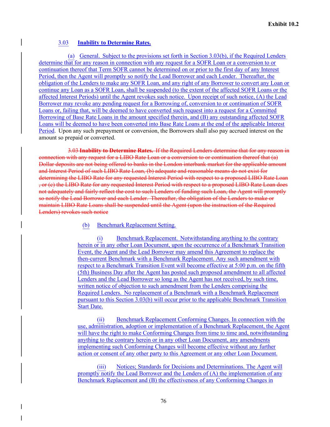 76 Exhibit 10.2 3.03 Inability to Determine Rates. (a) General. Subject to the provisions set forth in Section 3.03(b), if the Required Lenders determine that for any reason in connection with any request for a SOFR Loan or a conversion to or continuation thereof that Term SOFR cannot be determined on or prior to the first day of any Interest Period, then the Agent will promptly so notify the Lead Borrower and each Lender. Thereafter, the obligation of the Lenders to make any SOFR Loan, and any right of any Borrower to convert any Loan or continue any Loan as a SOFR Loan, shall be suspended (to the extent of the affected SOFR Loans or the affected Interest Periods) until the Agent revokes such notice. Upon receipt of such notice, (A) the Lead Borrower may revoke any pending request for a Borrowing of, conversion to or continuation of SOFR Loans or, failing that, will be deemed to have converted such request into a request for a Committed Borrowing of Base Rate Loans in the amount specified therein, and (B) any outstanding affected SOFR Loans will be deemed to have been converted into Base Rate Loans at the end of the applicable Interest Period. Upon any such prepayment or conversion, the Borrowers shall also pay accrued interest on the amount so prepaid or converted. 3.03 Inability to Determine Rates. If the Required Lenders determine that for any reason in connection with any request for a LIBO Rate Loan or a conversion to or continuation thereof that (a) Dollar deposits are not being offered to banks in the London interbank market for the applicable amount and Interest Period of such LIBO Rate Loan, (b) adequate and reasonable means do not exist for determining the LIBO Rate for any requested Interest Period with respect to a proposed LIBO Rate Loan , or (c) the LIBO Rate for any requested Interest Period with respect to a proposed LIBO Rate Loan does not adequately and fairly reflect the cost to such Lenders of funding such Loan, the Agent will promptly so notify the Lead Borrower and each Lender. Thereafter, the obligation of the Lenders to make or maintain LIBO Rate Loans shall be suspended until the Agent (upon the instruction of the Required Lenders) revokes such notice (b) Benchmark Replacement Setting. (i) Benchmark Replacement. Notwithstanding anything to the contrary herein or in any other Loan Document, upon the occurrence of a Benchmark Transition Event, the Agent and the Lead Borrower may amend this Agreement to replace the then-current Benchmark with a Benchmark Replacement. Any such amendment with respect to a Benchmark Transition Event will become effective at 5:00 p.m. on the fifth (5th) Business Day after the Agent has posted such proposed amendment to all affected Lenders and the Lead Borrower so long as the Agent has not received, by such time, written notice of objection to such amendment from the Lenders comprising the Required Lenders. No replacement of a Benchmark with a Benchmark Replacement pursuant to this Section 3.03(b) will occur prior to the applicable Benchmark Transition Start Date. (ii) Benchmark Replacement Conforming Changes. In connection with the use, administration, adoption or implementation of a Benchmark Replacement, the Agent will have the right to make Conforming Changes from time to time and, notwithstanding anything to the contrary herein or in any other Loan Document, any amendments implementing such Conforming Changes will become effective without any further action or consent of any other party to this Agreement or any other Loan Document. (iii) Notices; Standards for Decisions and Determinations. The Agent will promptly notify the Lead Borrower and the Lenders of (A) the implementation of any Benchmark Replacement and (B) the effectiveness of any Conforming Changes in