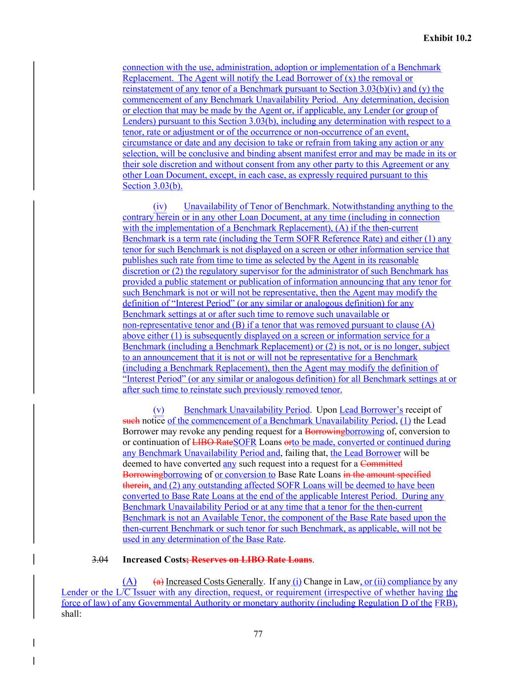 77 Exhibit 10.2 connection with the use, administration, adoption or implementation of a Benchmark Replacement. The Agent will notify the Lead Borrower of (x) the removal or reinstatement of any tenor of a Benchmark pursuant to Section 3.03(b)(iv) and (y) the commencement of any Benchmark Unavailability Period. Any determination, decision or election that may be made by the Agent or, if applicable, any Lender (or group of Lenders) pursuant to this Section 3.03(b), including any determination with respect to a tenor, rate or adjustment or of the occurrence or non-occurrence of an event, circumstance or date and any decision to take or refrain from taking any action or any selection, will be conclusive and binding absent manifest error and may be made in its or their sole discretion and without consent from any other party to this Agreement or any other Loan Document, except, in each case, as expressly required pursuant to this Section 3.03(b). (iv) Unavailability of Tenor of Benchmark. Notwithstanding anything to the contrary herein or in any other Loan Document, at any time (including in connection with the implementation of a Benchmark Replacement), (A) if the then-current Benchmark is a term rate (including the Term SOFR Reference Rate) and either (1) any tenor for such Benchmark is not displayed on a screen or other information service that publishes such rate from time to time as selected by the Agent in its reasonable discretion or (2) the regulatory supervisor for the administrator of such Benchmark has provided a public statement or publication of information announcing that any tenor for such Benchmark is not or will not be representative, then the Agent may modify the definition of “Interest Period” (or any similar or analogous definition) for any Benchmark settings at or after such time to remove such unavailable or non-representative tenor and (B) if a tenor that was removed pursuant to clause (A) above either (1) is subsequently displayed on a screen or information service for a Benchmark (including a Benchmark Replacement) or (2) is not, or is no longer, subject to an announcement that it is not or will not be representative for a Benchmark (including a Benchmark Replacement), then the Agent may modify the definition of “Interest Period” (or any similar or analogous definition) for all Benchmark settings at or after such time to reinstate such previously removed tenor. (v) Benchmark Unavailability Period. Upon Lead Borrower’s receipt of such notice of the commencement of a Benchmark Unavailability Period, (1) the Lead Borrower may revoke any pending request for a Borrowingborrowing of, conversion to or continuation of LIBO RateSOFR Loans orto be made, converted or continued during any Benchmark Unavailability Period and, failing that, the Lead Borrower will be deemed to have converted any such request into a request for a Committed Borrowingborrowing of or conversion to Base Rate Loans in the amount specified therein, and (2) any outstanding affected SOFR Loans will be deemed to have been converted to Base Rate Loans at the end of the applicable Interest Period. During any Benchmark Unavailability Period or at any time that a tenor for the then-current Benchmark is not an Available Tenor, the component of the Base Rate based upon the then-current Benchmark or such tenor for such Benchmark, as applicable, will not be used in any determination of the Base Rate. 3.04 Increased Costs; Reserves on LIBO Rate Loans. (A) (a) Increased Costs Generally. If any (i) Change in Law, or (ii) compliance by any Lender or the L/C Issuer with any direction, request, or requirement (irrespective of whether having the force of law) of any Governmental Authority or monetary authority (including Regulation D of the FRB), shall: