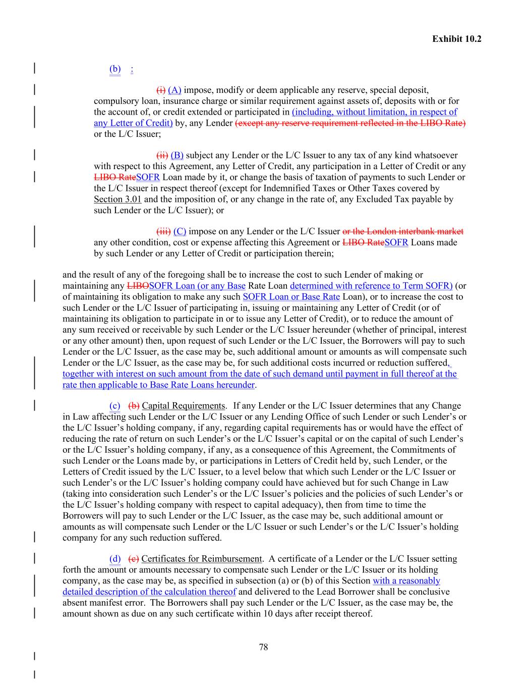 78 Exhibit 10.2 (b) : (i) (A) impose, modify or deem applicable any reserve, special deposit, compulsory loan, insurance charge or similar requirement against assets of, deposits with or for the account of, or credit extended or participated in (including, without limitation, in respect of any Letter of Credit) by, any Lender (except any reserve requirement reflected in the LIBO Rate) or the L/C Issuer; (ii) (B) subject any Lender or the L/C Issuer to any tax of any kind whatsoever with respect to this Agreement, any Letter of Credit, any participation in a Letter of Credit or any LIBO RateSOFR Loan made by it, or change the basis of taxation of payments to such Lender or the L/C Issuer in respect thereof (except for Indemnified Taxes or Other Taxes covered by Section 3.01 and the imposition of, or any change in the rate of, any Excluded Tax payable by such Lender or the L/C Issuer); or (iii) (C) impose on any Lender or the L/C Issuer or the London interbank market any other condition, cost or expense affecting this Agreement or LIBO RateSOFR Loans made by such Lender or any Letter of Credit or participation therein; and the result of any of the foregoing shall be to increase the cost to such Lender of making or maintaining any LIBOSOFR Loan (or any Base Rate Loan determined with reference to Term SOFR) (or of maintaining its obligation to make any such SOFR Loan or Base Rate Loan), or to increase the cost to such Lender or the L/C Issuer of participating in, issuing or maintaining any Letter of Credit (or of maintaining its obligation to participate in or to issue any Letter of Credit), or to reduce the amount of any sum received or receivable by such Lender or the L/C Issuer hereunder (whether of principal, interest or any other amount) then, upon request of such Lender or the L/C Issuer, the Borrowers will pay to such Lender or the L/C Issuer, as the case may be, such additional amount or amounts as will compensate such Lender or the L/C Issuer, as the case may be, for such additional costs incurred or reduction suffered, together with interest on such amount from the date of such demand until payment in full thereof at the rate then applicable to Base Rate Loans hereunder. (c) (b) Capital Requirements. If any Lender or the L/C Issuer determines that any Change in Law affecting such Lender or the L/C Issuer or any Lending Office of such Lender or such Lender’s or the L/C Issuer’s holding company, if any, regarding capital requirements has or would have the effect of reducing the rate of return on such Lender’s or the L/C Issuer’s capital or on the capital of such Lender’s or the L/C Issuer’s holding company, if any, as a consequence of this Agreement, the Commitments of such Lender or the Loans made by, or participations in Letters of Credit held by, such Lender, or the Letters of Credit issued by the L/C Issuer, to a level below that which such Lender or the L/C Issuer or such Lender’s or the L/C Issuer’s holding company could have achieved but for such Change in Law (taking into consideration such Lender’s or the L/C Issuer’s policies and the policies of such Lender’s or the L/C Issuer’s holding company with respect to capital adequacy), then from time to time the Borrowers will pay to such Lender or the L/C Issuer, as the case may be, such additional amount or amounts as will compensate such Lender or the L/C Issuer or such Lender’s or the L/C Issuer’s holding company for any such reduction suffered. (d) (c) Certificates for Reimbursement. A certificate of a Lender or the L/C Issuer setting forth the amount or amounts necessary to compensate such Lender or the L/C Issuer or its holding company, as the case may be, as specified in subsection (a) or (b) of this Section with a reasonably detailed description of the calculation thereof and delivered to the Lead Borrower shall be conclusive absent manifest error. The Borrowers shall pay such Lender or the L/C Issuer, as the case may be, the amount shown as due on any such certificate within 10 days after receipt thereof.
