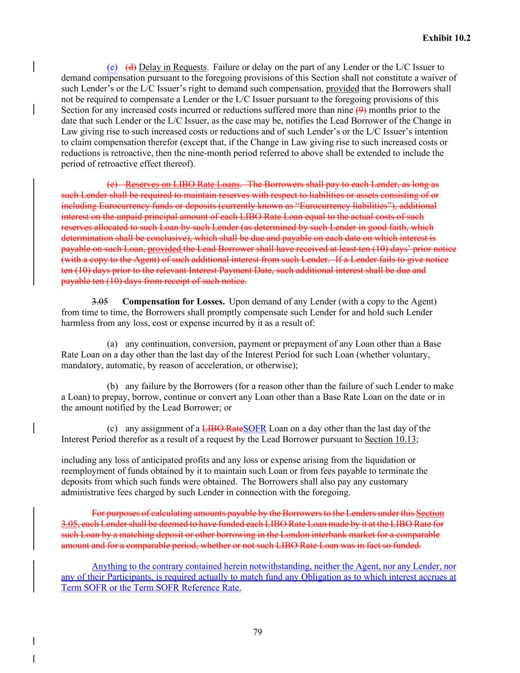 79 Exhibit 10.2 (e) (d) Delay in Requests. Failure or delay on the part of any Lender or the L/C Issuer to demand compensation pursuant to the foregoing provisions of this Section shall not constitute a waiver of such Lender’s or the L/C Issuer’s right to demand such compensation, provided that the Borrowers shall not be required to compensate a Lender or the L/C Issuer pursuant to the foregoing provisions of this Section for any increased costs incurred or reductions suffered more than nine (9) months prior to the date that such Lender or the L/C Issuer, as the case may be, notifies the Lead Borrower of the Change in Law giving rise to such increased costs or reductions and of such Lender’s or the L/C Issuer’s intention to claim compensation therefor (except that, if the Change in Law giving rise to such increased costs or reductions is retroactive, then the nine-month period referred to above shall be extended to include the period of retroactive effect thereof). (e) Reserves on LIBO Rate Loans. The Borrowers shall pay to each Lender, as long as such Lender shall be required to maintain reserves with respect to liabilities or assets consisting of or including Eurocurrency funds or deposits (currently known as “Eurocurrency liabilities”), additional interest on the unpaid principal amount of each LIBO Rate Loan equal to the actual costs of such reserves allocated to such Loan by such Lender (as determined by such Lender in good faith, which determination shall be conclusive), which shall be due and payable on each date on which interest is payable on such Loan, provided the Lead Borrower shall have received at least ten (10) days’ prior notice (with a copy to the Agent) of such additional interest from such Lender. If a Lender fails to give notice ten (10) days prior to the relevant Interest Payment Date, such additional interest shall be due and payable ten (10) days from receipt of such notice. 3.05 Compensation for Losses. Upon demand of any Lender (with a copy to the Agent) from time to time, the Borrowers shall promptly compensate such Lender for and hold such Lender harmless from any loss, cost or expense incurred by it as a result of: (a) any continuation, conversion, payment or prepayment of any Loan other than a Base Rate Loan on a day other than the last day of the Interest Period for such Loan (whether voluntary, mandatory, automatic, by reason of acceleration, or otherwise); (b) any failure by the Borrowers (for a reason other than the failure of such Lender to make a Loan) to prepay, borrow, continue or convert any Loan other than a Base Rate Loan on the date or in the amount notified by the Lead Borrower; or (c) any assignment of a LIBO RateSOFR Loan on a day other than the last day of the Interest Period therefor as a result of a request by the Lead Borrower pursuant to Section 10.13; including any loss of anticipated profits and any loss or expense arising from the liquidation or reemployment of funds obtained by it to maintain such Loan or from fees payable to terminate the deposits from which such funds were obtained. The Borrowers shall also pay any customary administrative fees charged by such Lender in connection with the foregoing. For purposes of calculating amounts payable by the Borrowers to the Lenders under this Section 3.05, each Lender shall be deemed to have funded each LIBO Rate Loan made by it at the LIBO Rate for such Loan by a matching deposit or other borrowing in the London interbank market for a comparable amount and for a comparable period, whether or not such LIBO Rate Loan was in fact so funded. Anything to the contrary contained herein notwithstanding, neither the Agent, nor any Lender, nor any of their Participants, is required actually to match fund any Obligation as to which interest accrues at Term SOFR or the Term SOFR Reference Rate.
