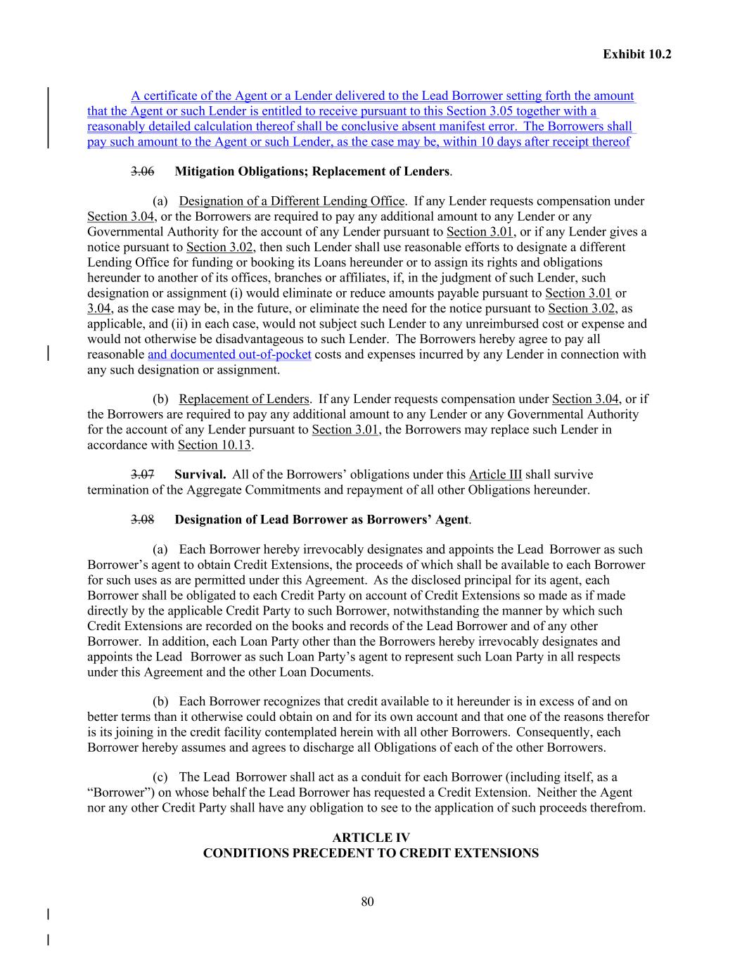 80 Exhibit 10.2 A certificate of the Agent or a Lender delivered to the Lead Borrower setting forth the amount that the Agent or such Lender is entitled to receive pursuant to this Section 3.05 together with a reasonably detailed calculation thereof shall be conclusive absent manifest error. The Borrowers shall pay such amount to the Agent or such Lender, as the case may be, within 10 days after receipt thereof 3.06 Mitigation Obligations; Replacement of Lenders. (a) Designation of a Different Lending Office. If any Lender requests compensation under Section 3.04, or the Borrowers are required to pay any additional amount to any Lender or any Governmental Authority for the account of any Lender pursuant to Section 3.01, or if any Lender gives a notice pursuant to Section 3.02, then such Lender shall use reasonable efforts to designate a different Lending Office for funding or booking its Loans hereunder or to assign its rights and obligations hereunder to another of its offices, branches or affiliates, if, in the judgment of such Lender, such designation or assignment (i) would eliminate or reduce amounts payable pursuant to Section 3.01 or 3.04, as the case may be, in the future, or eliminate the need for the notice pursuant to Section 3.02, as applicable, and (ii) in each case, would not subject such Lender to any unreimbursed cost or expense and would not otherwise be disadvantageous to such Lender. The Borrowers hereby agree to pay all reasonable and documented out-of-pocket costs and expenses incurred by any Lender in connection with any such designation or assignment. (b) Replacement of Lenders. If any Lender requests compensation under Section 3.04, or if the Borrowers are required to pay any additional amount to any Lender or any Governmental Authority for the account of any Lender pursuant to Section 3.01, the Borrowers may replace such Lender in accordance with Section 10.13. 3.07 Survival. All of the Borrowers’ obligations under this Article III shall survive termination of the Aggregate Commitments and repayment of all other Obligations hereunder. 3.08 Designation of Lead Borrower as Borrowers’ Agent. (a) Each Borrower hereby irrevocably designates and appoints the Lead Borrower as such Borrower’s agent to obtain Credit Extensions, the proceeds of which shall be available to each Borrower for such uses as are permitted under this Agreement. As the disclosed principal for its agent, each Borrower shall be obligated to each Credit Party on account of Credit Extensions so made as if made directly by the applicable Credit Party to such Borrower, notwithstanding the manner by which such Credit Extensions are recorded on the books and records of the Lead Borrower and of any other Borrower. In addition, each Loan Party other than the Borrowers hereby irrevocably designates and appoints the Lead Borrower as such Loan Party’s agent to represent such Loan Party in all respects under this Agreement and the other Loan Documents. (b) Each Borrower recognizes that credit available to it hereunder is in excess of and on better terms than it otherwise could obtain on and for its own account and that one of the reasons therefor is its joining in the credit facility contemplated herein with all other Borrowers. Consequently, each Borrower hereby assumes and agrees to discharge all Obligations of each of the other Borrowers. (c) The Lead Borrower shall act as a conduit for each Borrower (including itself, as a “Borrower”) on whose behalf the Lead Borrower has requested a Credit Extension. Neither the Agent nor any other Credit Party shall have any obligation to see to the application of such proceeds therefrom. ARTICLE IV CONDITIONS PRECEDENT TO CREDIT EXTENSIONS