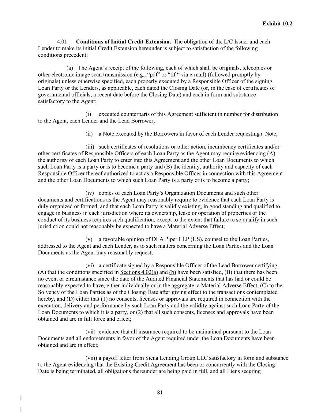 81 Exhibit 10.2 4.01 Conditions of Initial Credit Extension. The obligation of the L/C Issuer and each Lender to make its initial Credit Extension hereunder is subject to satisfaction of the following conditions precedent: (a) The Agent’s receipt of the following, each of which shall be originals, telecopies or other electronic image scan transmission (e.g., “pdf” or “tif “ via e-mail) (followed promptly by originals) unless otherwise specified, each properly executed by a Responsible Officer of the signing Loan Party or the Lenders, as applicable, each dated the Closing Date (or, in the case of certificates of governmental officials, a recent date before the Closing Date) and each in form and substance satisfactory to the Agent: (i) executed counterparts of this Agreement sufficient in number for distribution to the Agent, each Lender and the Lead Borrower; (ii) a Note executed by the Borrowers in favor of each Lender requesting a Note; (iii) such certificates of resolutions or other action, incumbency certificates and/or other certificates of Responsible Officers of each Loan Party as the Agent may require evidencing (A) the authority of each Loan Party to enter into this Agreement and the other Loan Documents to which such Loan Party is a party or is to become a party and (B) the identity, authority and capacity of each Responsible Officer thereof authorized to act as a Responsible Officer in connection with this Agreement and the other Loan Documents to which such Loan Party is a party or is to become a party; (iv) copies of each Loan Party’s Organization Documents and such other documents and certifications as the Agent may reasonably require to evidence that each Loan Party is duly organized or formed, and that each Loan Party is validly existing, in good standing and qualified to engage in business in each jurisdiction where its ownership, lease or operation of properties or the conduct of its business requires such qualification, except to the extent that failure to so qualify in such jurisdiction could not reasonably be expected to have a Material Adverse Effect; (v) a favorable opinion of DLA Piper LLP (US), counsel to the Loan Parties, addressed to the Agent and each Lender, as to such matters concerning the Loan Parties and the Loan Documents as the Agent may reasonably request; (vi) a certificate signed by a Responsible Officer of the Lead Borrower certifying (A) that the conditions specified in Sections 4.02(a) and (b) have been satisfied, (B) that there has been no event or circumstance since the date of the Audited Financial Statements that has had or could be reasonably expected to have, either individually or in the aggregate, a Material Adverse Effect, (C) to the Solvency of the Loan Parties as of the Closing Date after giving effect to the transactions contemplated hereby, and (D) either that (1) no consents, licenses or approvals are required in connection with the execution, delivery and performance by such Loan Party and the validity against such Loan Party of the Loan Documents to which it is a party, or (2) that all such consents, licenses and approvals have been obtained and are in full force and effect; (vii) evidence that all insurance required to be maintained pursuant to the Loan Documents and all endorsements in favor of the Agent required under the Loan Documents have been obtained and are in effect; (viii) a payoff letter from Siena Lending Group LLC satisfactory in form and substance to the Agent evidencing that the Existing Credit Agreement has been or concurrently with the Closing Date is being terminated, all obligations thereunder are being paid in full, and all Liens securing