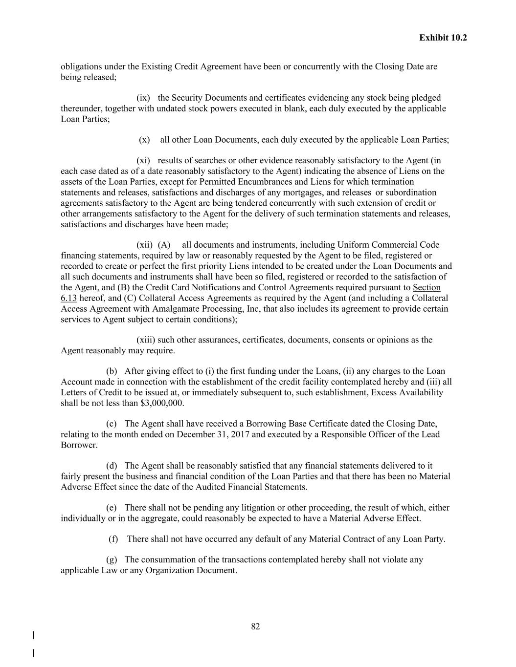 82 Exhibit 10.2 obligations under the Existing Credit Agreement have been or concurrently with the Closing Date are being released; (ix) the Security Documents and certificates evidencing any stock being pledged thereunder, together with undated stock powers executed in blank, each duly executed by the applicable Loan Parties; (x) all other Loan Documents, each duly executed by the applicable Loan Parties; (xi) results of searches or other evidence reasonably satisfactory to the Agent (in each case dated as of a date reasonably satisfactory to the Agent) indicating the absence of Liens on the assets of the Loan Parties, except for Permitted Encumbrances and Liens for which termination statements and releases, satisfactions and discharges of any mortgages, and releases or subordination agreements satisfactory to the Agent are being tendered concurrently with such extension of credit or other arrangements satisfactory to the Agent for the delivery of such termination statements and releases, satisfactions and discharges have been made; (xii) (A) all documents and instruments, including Uniform Commercial Code financing statements, required by law or reasonably requested by the Agent to be filed, registered or recorded to create or perfect the first priority Liens intended to be created under the Loan Documents and all such documents and instruments shall have been so filed, registered or recorded to the satisfaction of the Agent, and (B) the Credit Card Notifications and Control Agreements required pursuant to Section 6.13 hereof, and (C) Collateral Access Agreements as required by the Agent (and including a Collateral Access Agreement with Amalgamate Processing, Inc, that also includes its agreement to provide certain services to Agent subject to certain conditions); (xiii) such other assurances, certificates, documents, consents or opinions as the Agent reasonably may require. (b) After giving effect to (i) the first funding under the Loans, (ii) any charges to the Loan Account made in connection with the establishment of the credit facility contemplated hereby and (iii) all Letters of Credit to be issued at, or immediately subsequent to, such establishment, Excess Availability shall be not less than $3,000,000. (c) The Agent shall have received a Borrowing Base Certificate dated the Closing Date, relating to the month ended on December 31, 2017 and executed by a Responsible Officer of the Lead Borrower. (d) The Agent shall be reasonably satisfied that any financial statements delivered to it fairly present the business and financial condition of the Loan Parties and that there has been no Material Adverse Effect since the date of the Audited Financial Statements. (e) There shall not be pending any litigation or other proceeding, the result of which, either individually or in the aggregate, could reasonably be expected to have a Material Adverse Effect. (f) There shall not have occurred any default of any Material Contract of any Loan Party. (g) The consummation of the transactions contemplated hereby shall not violate any applicable Law or any Organization Document.