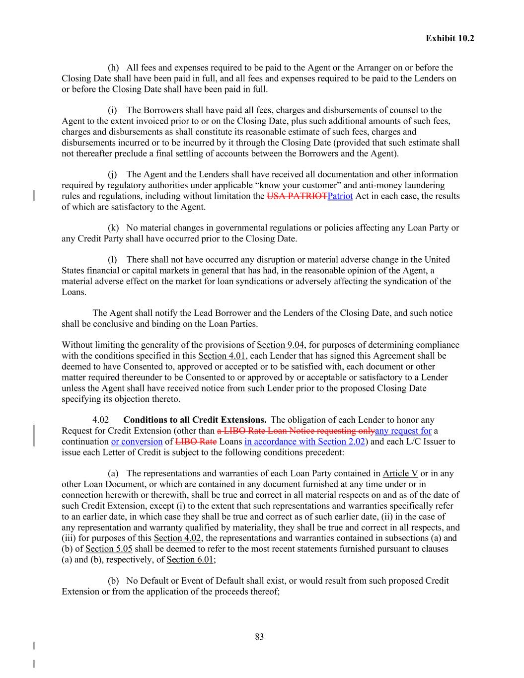 83 Exhibit 10.2 (h) All fees and expenses required to be paid to the Agent or the Arranger on or before the Closing Date shall have been paid in full, and all fees and expenses required to be paid to the Lenders on or before the Closing Date shall have been paid in full. (i) The Borrowers shall have paid all fees, charges and disbursements of counsel to the Agent to the extent invoiced prior to or on the Closing Date, plus such additional amounts of such fees, charges and disbursements as shall constitute its reasonable estimate of such fees, charges and disbursements incurred or to be incurred by it through the Closing Date (provided that such estimate shall not thereafter preclude a final settling of accounts between the Borrowers and the Agent). (j) The Agent and the Lenders shall have received all documentation and other information required by regulatory authorities under applicable “know your customer” and anti-money laundering rules and regulations, including without limitation the USA PATRIOTPatriot Act in each case, the results of which are satisfactory to the Agent. (k) No material changes in governmental regulations or policies affecting any Loan Party or any Credit Party shall have occurred prior to the Closing Date. (l) There shall not have occurred any disruption or material adverse change in the United States financial or capital markets in general that has had, in the reasonable opinion of the Agent, a material adverse effect on the market for loan syndications or adversely affecting the syndication of the Loans. The Agent shall notify the Lead Borrower and the Lenders of the Closing Date, and such notice shall be conclusive and binding on the Loan Parties. Without limiting the generality of the provisions of Section 9.04, for purposes of determining compliance with the conditions specified in this Section 4.01, each Lender that has signed this Agreement shall be deemed to have Consented to, approved or accepted or to be satisfied with, each document or other matter required thereunder to be Consented to or approved by or acceptable or satisfactory to a Lender unless the Agent shall have received notice from such Lender prior to the proposed Closing Date specifying its objection thereto. 4.02 Conditions to all Credit Extensions. The obligation of each Lender to honor any Request for Credit Extension (other than a LIBO Rate Loan Notice requesting onlyany request for a continuation or conversion of LIBO Rate Loans in accordance with Section 2.02) and each L/C Issuer to issue each Letter of Credit is subject to the following conditions precedent: (a) The representations and warranties of each Loan Party contained in Article V or in any other Loan Document, or which are contained in any document furnished at any time under or in connection herewith or therewith, shall be true and correct in all material respects on and as of the date of such Credit Extension, except (i) to the extent that such representations and warranties specifically refer to an earlier date, in which case they shall be true and correct as of such earlier date, (ii) in the case of any representation and warranty qualified by materiality, they shall be true and correct in all respects, and (iii) for purposes of this Section 4.02, the representations and warranties contained in subsections (a) and (b) of Section 5.05 shall be deemed to refer to the most recent statements furnished pursuant to clauses (a) and (b), respectively, of Section 6.01; (b) No Default or Event of Default shall exist, or would result from such proposed Credit Extension or from the application of the proceeds thereof;