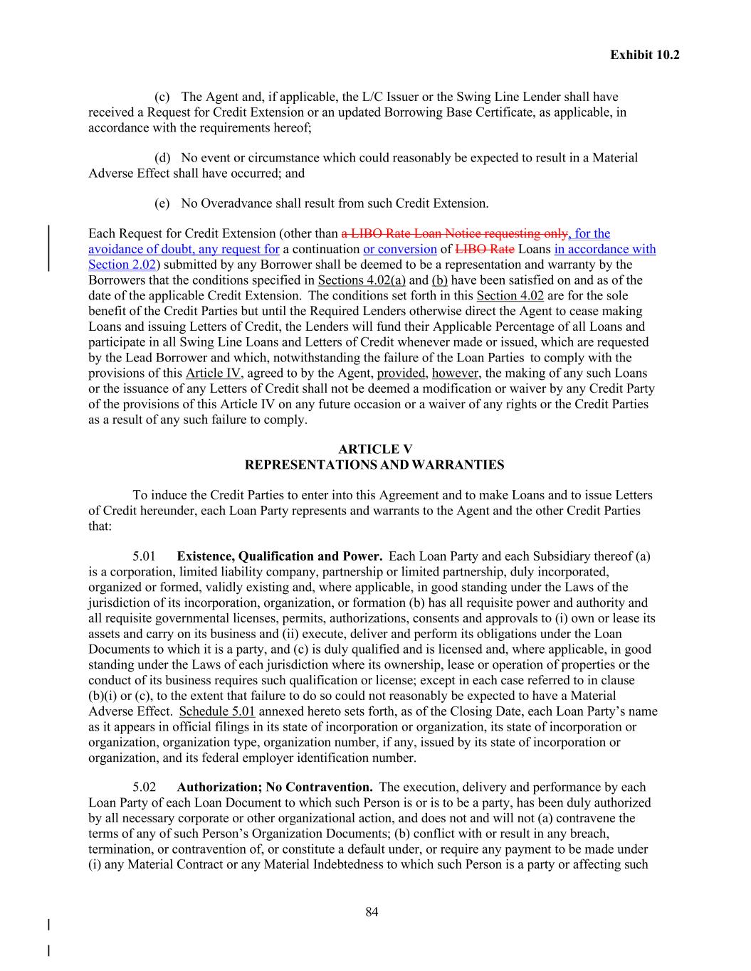 84 Exhibit 10.2 (c) The Agent and, if applicable, the L/C Issuer or the Swing Line Lender shall have received a Request for Credit Extension or an updated Borrowing Base Certificate, as applicable, in accordance with the requirements hereof; (d) No event or circumstance which could reasonably be expected to result in a Material Adverse Effect shall have occurred; and (e) No Overadvance shall result from such Credit Extension. Each Request for Credit Extension (other than a LIBO Rate Loan Notice requesting only, for the avoidance of doubt, any request for a continuation or conversion of LIBO Rate Loans in accordance with Section 2.02) submitted by any Borrower shall be deemed to be a representation and warranty by the Borrowers that the conditions specified in Sections 4.02(a) and (b) have been satisfied on and as of the date of the applicable Credit Extension. The conditions set forth in this Section 4.02 are for the sole benefit of the Credit Parties but until the Required Lenders otherwise direct the Agent to cease making Loans and issuing Letters of Credit, the Lenders will fund their Applicable Percentage of all Loans and participate in all Swing Line Loans and Letters of Credit whenever made or issued, which are requested by the Lead Borrower and which, notwithstanding the failure of the Loan Parties to comply with the provisions of this Article IV, agreed to by the Agent, provided, however, the making of any such Loans or the issuance of any Letters of Credit shall not be deemed a modification or waiver by any Credit Party of the provisions of this Article IV on any future occasion or a waiver of any rights or the Credit Parties as a result of any such failure to comply. ARTICLE V REPRESENTATIONS AND WARRANTIES To induce the Credit Parties to enter into this Agreement and to make Loans and to issue Letters of Credit hereunder, each Loan Party represents and warrants to the Agent and the other Credit Parties that: 5.01 Existence, Qualification and Power. Each Loan Party and each Subsidiary thereof (a) is a corporation, limited liability company, partnership or limited partnership, duly incorporated, organized or formed, validly existing and, where applicable, in good standing under the Laws of the jurisdiction of its incorporation, organization, or formation (b) has all requisite power and authority and all requisite governmental licenses, permits, authorizations, consents and approvals to (i) own or lease its assets and carry on its business and (ii) execute, deliver and perform its obligations under the Loan Documents to which it is a party, and (c) is duly qualified and is licensed and, where applicable, in good standing under the Laws of each jurisdiction where its ownership, lease or operation of properties or the conduct of its business requires such qualification or license; except in each case referred to in clause (b)(i) or (c), to the extent that failure to do so could not reasonably be expected to have a Material Adverse Effect. Schedule 5.01 annexed hereto sets forth, as of the Closing Date, each Loan Party’s name as it appears in official filings in its state of incorporation or organization, its state of incorporation or organization, organization type, organization number, if any, issued by its state of incorporation or organization, and its federal employer identification number. 5.02 Authorization; No Contravention. The execution, delivery and performance by each Loan Party of each Loan Document to which such Person is or is to be a party, has been duly authorized by all necessary corporate or other organizational action, and does not and will not (a) contravene the terms of any of such Person’s Organization Documents; (b) conflict with or result in any breach, termination, or contravention of, or constitute a default under, or require any payment to be made under (i) any Material Contract or any Material Indebtedness to which such Person is a party or affecting such