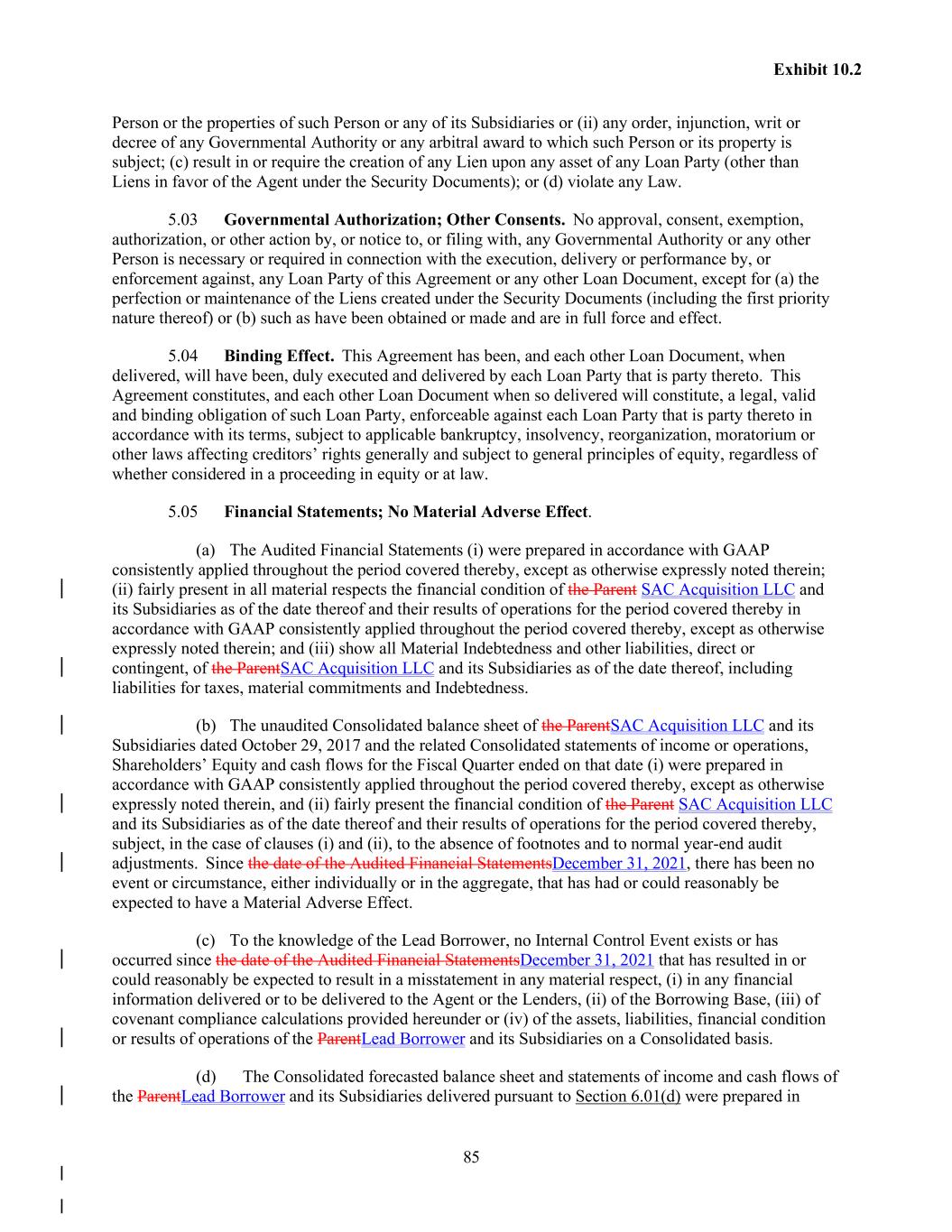 85 Exhibit 10.2 Person or the properties of such Person or any of its Subsidiaries or (ii) any order, injunction, writ or decree of any Governmental Authority or any arbitral award to which such Person or its property is subject; (c) result in or require the creation of any Lien upon any asset of any Loan Party (other than Liens in favor of the Agent under the Security Documents); or (d) violate any Law. 5.03 Governmental Authorization; Other Consents. No approval, consent, exemption, authorization, or other action by, or notice to, or filing with, any Governmental Authority or any other Person is necessary or required in connection with the execution, delivery or performance by, or enforcement against, any Loan Party of this Agreement or any other Loan Document, except for (a) the perfection or maintenance of the Liens created under the Security Documents (including the first priority nature thereof) or (b) such as have been obtained or made and are in full force and effect. 5.04 Binding Effect. This Agreement has been, and each other Loan Document, when delivered, will have been, duly executed and delivered by each Loan Party that is party thereto. This Agreement constitutes, and each other Loan Document when so delivered will constitute, a legal, valid and binding obligation of such Loan Party, enforceable against each Loan Party that is party thereto in accordance with its terms, subject to applicable bankruptcy, insolvency, reorganization, moratorium or other laws affecting creditors’ rights generally and subject to general principles of equity, regardless of whether considered in a proceeding in equity or at law. 5.05 Financial Statements; No Material Adverse Effect. (a) The Audited Financial Statements (i) were prepared in accordance with GAAP consistently applied throughout the period covered thereby, except as otherwise expressly noted therein; (ii) fairly present in all material respects the financial condition of the Parent SAC Acquisition LLC and its Subsidiaries as of the date thereof and their results of operations for the period covered thereby in accordance with GAAP consistently applied throughout the period covered thereby, except as otherwise expressly noted therein; and (iii) show all Material Indebtedness and other liabilities, direct or contingent, of the ParentSAC Acquisition LLC and its Subsidiaries as of the date thereof, including liabilities for taxes, material commitments and Indebtedness. (b) The unaudited Consolidated balance sheet of the ParentSAC Acquisition LLC and its Subsidiaries dated October 29, 2017 and the related Consolidated statements of income or operations, Shareholders’ Equity and cash flows for the Fiscal Quarter ended on that date (i) were prepared in accordance with GAAP consistently applied throughout the period covered thereby, except as otherwise expressly noted therein, and (ii) fairly present the financial condition of the Parent SAC Acquisition LLC and its Subsidiaries as of the date thereof and their results of operations for the period covered thereby, subject, in the case of clauses (i) and (ii), to the absence of footnotes and to normal year-end audit adjustments. Since the date of the Audited Financial StatementsDecember 31, 2021, there has been no event or circumstance, either individually or in the aggregate, that has had or could reasonably be expected to have a Material Adverse Effect. (c) To the knowledge of the Lead Borrower, no Internal Control Event exists or has occurred since the date of the Audited Financial StatementsDecember 31, 2021 that has resulted in or could reasonably be expected to result in a misstatement in any material respect, (i) in any financial information delivered or to be delivered to the Agent or the Lenders, (ii) of the Borrowing Base, (iii) of covenant compliance calculations provided hereunder or (iv) of the assets, liabilities, financial condition or results of operations of the ParentLead Borrower and its Subsidiaries on a Consolidated basis. (d) The Consolidated forecasted balance sheet and statements of income and cash flows of the ParentLead Borrower and its Subsidiaries delivered pursuant to Section 6.01(d) were prepared in