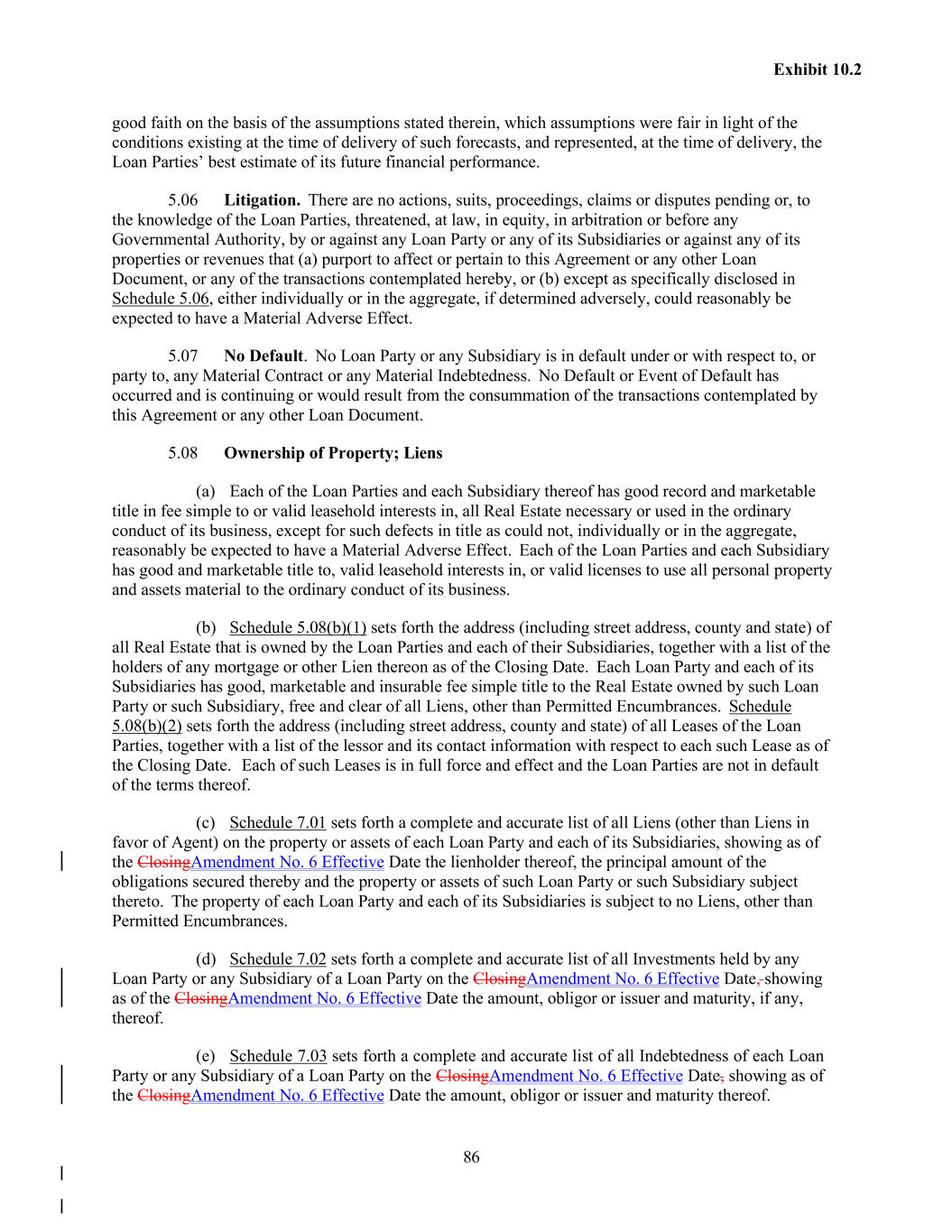 86 Exhibit 10.2 good faith on the basis of the assumptions stated therein, which assumptions were fair in light of the conditions existing at the time of delivery of such forecasts, and represented, at the time of delivery, the Loan Parties’ best estimate of its future financial performance. 5.06 Litigation. There are no actions, suits, proceedings, claims or disputes pending or, to the knowledge of the Loan Parties, threatened, at law, in equity, in arbitration or before any Governmental Authority, by or against any Loan Party or any of its Subsidiaries or against any of its properties or revenues that (a) purport to affect or pertain to this Agreement or any other Loan Document, or any of the transactions contemplated hereby, or (b) except as specifically disclosed in Schedule 5.06, either individually or in the aggregate, if determined adversely, could reasonably be expected to have a Material Adverse Effect. 5.07 No Default. No Loan Party or any Subsidiary is in default under or with respect to, or party to, any Material Contract or any Material Indebtedness. No Default or Event of Default has occurred and is continuing or would result from the consummation of the transactions contemplated by this Agreement or any other Loan Document. 5.08 Ownership of Property; Liens (a) Each of the Loan Parties and each Subsidiary thereof has good record and marketable title in fee simple to or valid leasehold interests in, all Real Estate necessary or used in the ordinary conduct of its business, except for such defects in title as could not, individually or in the aggregate, reasonably be expected to have a Material Adverse Effect. Each of the Loan Parties and each Subsidiary has good and marketable title to, valid leasehold interests in, or valid licenses to use all personal property and assets material to the ordinary conduct of its business. (b) Schedule 5.08(b)(1) sets forth the address (including street address, county and state) of all Real Estate that is owned by the Loan Parties and each of their Subsidiaries, together with a list of the holders of any mortgage or other Lien thereon as of the Closing Date. Each Loan Party and each of its Subsidiaries has good, marketable and insurable fee simple title to the Real Estate owned by such Loan Party or such Subsidiary, free and clear of all Liens, other than Permitted Encumbrances. Schedule 5.08(b)(2) sets forth the address (including street address, county and state) of all Leases of the Loan Parties, together with a list of the lessor and its contact information with respect to each such Lease as of the Closing Date. Each of such Leases is in full force and effect and the Loan Parties are not in default of the terms thereof. (c) Schedule 7.01 sets forth a complete and accurate list of all Liens (other than Liens in favor of Agent) on the property or assets of each Loan Party and each of its Subsidiaries, showing as of the ClosingAmendment No. 6 Effective Date the lienholder thereof, the principal amount of the obligations secured thereby and the property or assets of such Loan Party or such Subsidiary subject thereto. The property of each Loan Party and each of its Subsidiaries is subject to no Liens, other than Permitted Encumbrances. (d) Schedule 7.02 sets forth a complete and accurate list of all Investments held by any Loan Party or any Subsidiary of a Loan Party on the ClosingAmendment No. 6 Effective Date, showing as of the ClosingAmendment No. 6 Effective Date the amount, obligor or issuer and maturity, if any, thereof. (e) Schedule 7.03 sets forth a complete and accurate list of all Indebtedness of each Loan Party or any Subsidiary of a Loan Party on the ClosingAmendment No. 6 Effective Date, showing as of the ClosingAmendment No. 6 Effective Date the amount, obligor or issuer and maturity thereof.