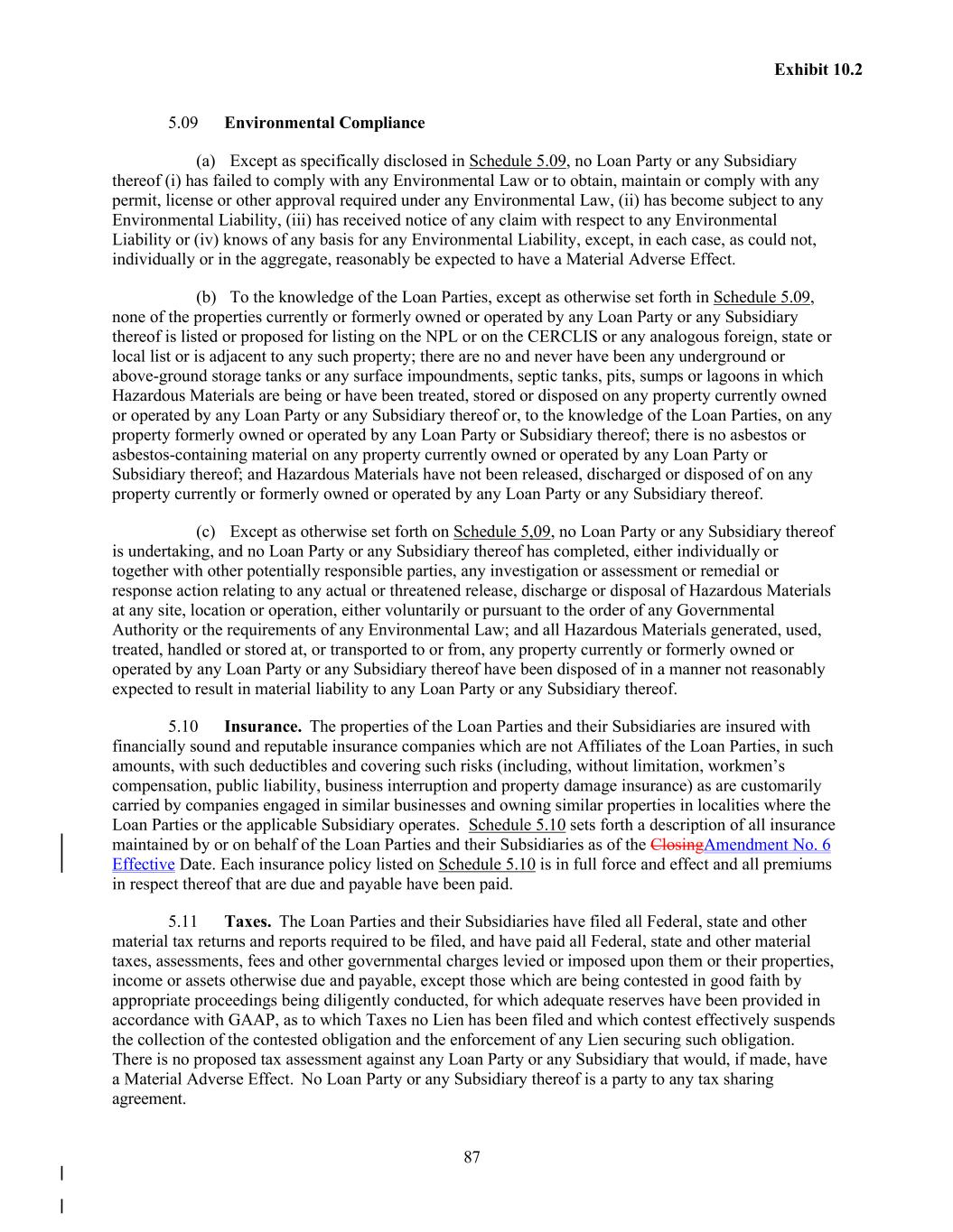87 Exhibit 10.2 5.09 Environmental Compliance (a) Except as specifically disclosed in Schedule 5.09, no Loan Party or any Subsidiary thereof (i) has failed to comply with any Environmental Law or to obtain, maintain or comply with any permit, license or other approval required under any Environmental Law, (ii) has become subject to any Environmental Liability, (iii) has received notice of any claim with respect to any Environmental Liability or (iv) knows of any basis for any Environmental Liability, except, in each case, as could not, individually or in the aggregate, reasonably be expected to have a Material Adverse Effect. (b) To the knowledge of the Loan Parties, except as otherwise set forth in Schedule 5.09, none of the properties currently or formerly owned or operated by any Loan Party or any Subsidiary thereof is listed or proposed for listing on the NPL or on the CERCLIS or any analogous foreign, state or local list or is adjacent to any such property; there are no and never have been any underground or above-ground storage tanks or any surface impoundments, septic tanks, pits, sumps or lagoons in which Hazardous Materials are being or have been treated, stored or disposed on any property currently owned or operated by any Loan Party or any Subsidiary thereof or, to the knowledge of the Loan Parties, on any property formerly owned or operated by any Loan Party or Subsidiary thereof; there is no asbestos or asbestos-containing material on any property currently owned or operated by any Loan Party or Subsidiary thereof; and Hazardous Materials have not been released, discharged or disposed of on any property currently or formerly owned or operated by any Loan Party or any Subsidiary thereof. (c) Except as otherwise set forth on Schedule 5,09, no Loan Party or any Subsidiary thereof is undertaking, and no Loan Party or any Subsidiary thereof has completed, either individually or together with other potentially responsible parties, any investigation or assessment or remedial or response action relating to any actual or threatened release, discharge or disposal of Hazardous Materials at any site, location or operation, either voluntarily or pursuant to the order of any Governmental Authority or the requirements of any Environmental Law; and all Hazardous Materials generated, used, treated, handled or stored at, or transported to or from, any property currently or formerly owned or operated by any Loan Party or any Subsidiary thereof have been disposed of in a manner not reasonably expected to result in material liability to any Loan Party or any Subsidiary thereof. 5.10 Insurance. The properties of the Loan Parties and their Subsidiaries are insured with financially sound and reputable insurance companies which are not Affiliates of the Loan Parties, in such amounts, with such deductibles and covering such risks (including, without limitation, workmen’s compensation, public liability, business interruption and property damage insurance) as are customarily carried by companies engaged in similar businesses and owning similar properties in localities where the Loan Parties or the applicable Subsidiary operates. Schedule 5.10 sets forth a description of all insurance maintained by or on behalf of the Loan Parties and their Subsidiaries as of the ClosingAmendment No. 6 Effective Date. Each insurance policy listed on Schedule 5.10 is in full force and effect and all premiums in respect thereof that are due and payable have been paid. 5.11 Taxes. The Loan Parties and their Subsidiaries have filed all Federal, state and other material tax returns and reports required to be filed, and have paid all Federal, state and other material taxes, assessments, fees and other governmental charges levied or imposed upon them or their properties, income or assets otherwise due and payable, except those which are being contested in good faith by appropriate proceedings being diligently conducted, for which adequate reserves have been provided in accordance with GAAP, as to which Taxes no Lien has been filed and which contest effectively suspends the collection of the contested obligation and the enforcement of any Lien securing such obligation. There is no proposed tax assessment against any Loan Party or any Subsidiary that would, if made, have a Material Adverse Effect. No Loan Party or any Subsidiary thereof is a party to any tax sharing agreement.