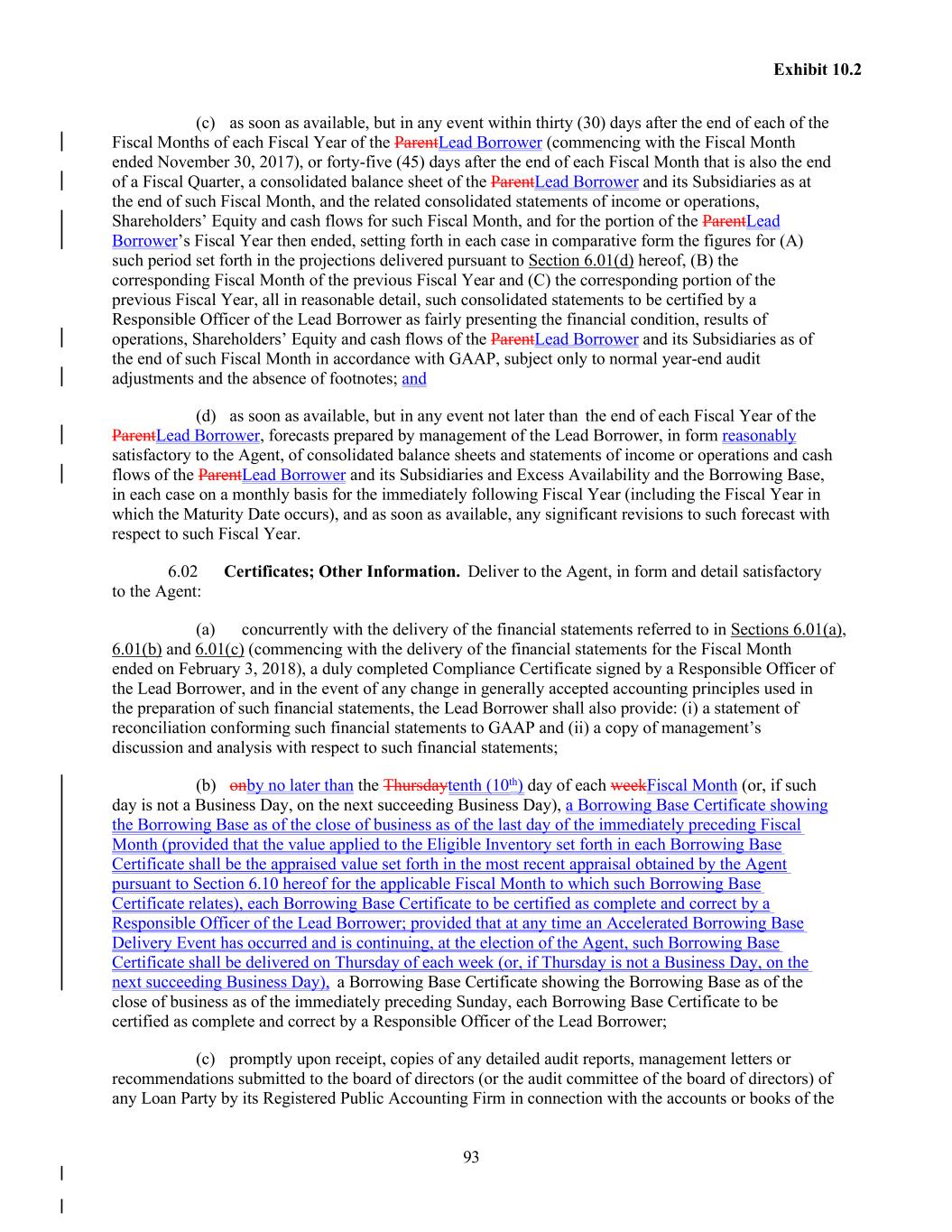93 Exhibit 10.2 (c) as soon as available, but in any event within thirty (30) days after the end of each of the Fiscal Months of each Fiscal Year of the ParentLead Borrower (commencing with the Fiscal Month ended November 30, 2017), or forty-five (45) days after the end of each Fiscal Month that is also the end of a Fiscal Quarter, a consolidated balance sheet of the ParentLead Borrower and its Subsidiaries as at the end of such Fiscal Month, and the related consolidated statements of income or operations, Shareholders’ Equity and cash flows for such Fiscal Month, and for the portion of the ParentLead Borrower’s Fiscal Year then ended, setting forth in each case in comparative form the figures for (A) such period set forth in the projections delivered pursuant to Section 6.01(d) hereof, (B) the corresponding Fiscal Month of the previous Fiscal Year and (C) the corresponding portion of the previous Fiscal Year, all in reasonable detail, such consolidated statements to be certified by a Responsible Officer of the Lead Borrower as fairly presenting the financial condition, results of operations, Shareholders’ Equity and cash flows of the ParentLead Borrower and its Subsidiaries as of the end of such Fiscal Month in accordance with GAAP, subject only to normal year-end audit adjustments and the absence of footnotes; and (d) as soon as available, but in any event not later than the end of each Fiscal Year of the ParentLead Borrower, forecasts prepared by management of the Lead Borrower, in form reasonably satisfactory to the Agent, of consolidated balance sheets and statements of income or operations and cash flows of the ParentLead Borrower and its Subsidiaries and Excess Availability and the Borrowing Base, in each case on a monthly basis for the immediately following Fiscal Year (including the Fiscal Year in which the Maturity Date occurs), and as soon as available, any significant revisions to such forecast with respect to such Fiscal Year. 6.02 Certificates; Other Information. Deliver to the Agent, in form and detail satisfactory to the Agent: (a) concurrently with the delivery of the financial statements referred to in Sections 6.01(a), 6.01(b) and 6.01(c) (commencing with the delivery of the financial statements for the Fiscal Month ended on February 3, 2018), a duly completed Compliance Certificate signed by a Responsible Officer of the Lead Borrower, and in the event of any change in generally accepted accounting principles used in the preparation of such financial statements, the Lead Borrower shall also provide: (i) a statement of reconciliation conforming such financial statements to GAAP and (ii) a copy of management’s discussion and analysis with respect to such financial statements; (b) onby no later than the Thursdaytenth (10th) day of each weekFiscal Month (or, if such day is not a Business Day, on the next succeeding Business Day), a Borrowing Base Certificate showing the Borrowing Base as of the close of business as of the last day of the immediately preceding Fiscal Month (provided that the value applied to the Eligible Inventory set forth in each Borrowing Base Certificate shall be the appraised value set forth in the most recent appraisal obtained by the Agent pursuant to Section 6.10 hereof for the applicable Fiscal Month to which such Borrowing Base Certificate relates), each Borrowing Base Certificate to be certified as complete and correct by a Responsible Officer of the Lead Borrower; provided that at any time an Accelerated Borrowing Base Delivery Event has occurred and is continuing, at the election of the Agent, such Borrowing Base Certificate shall be delivered on Thursday of each week (or, if Thursday is not a Business Day, on the next succeeding Business Day), a Borrowing Base Certificate showing the Borrowing Base as of the close of business as of the immediately preceding Sunday, each Borrowing Base Certificate to be certified as complete and correct by a Responsible Officer of the Lead Borrower; (c) promptly upon receipt, copies of any detailed audit reports, management letters or recommendations submitted to the board of directors (or the audit committee of the board of directors) of any Loan Party by its Registered Public Accounting Firm in connection with the accounts or books of the