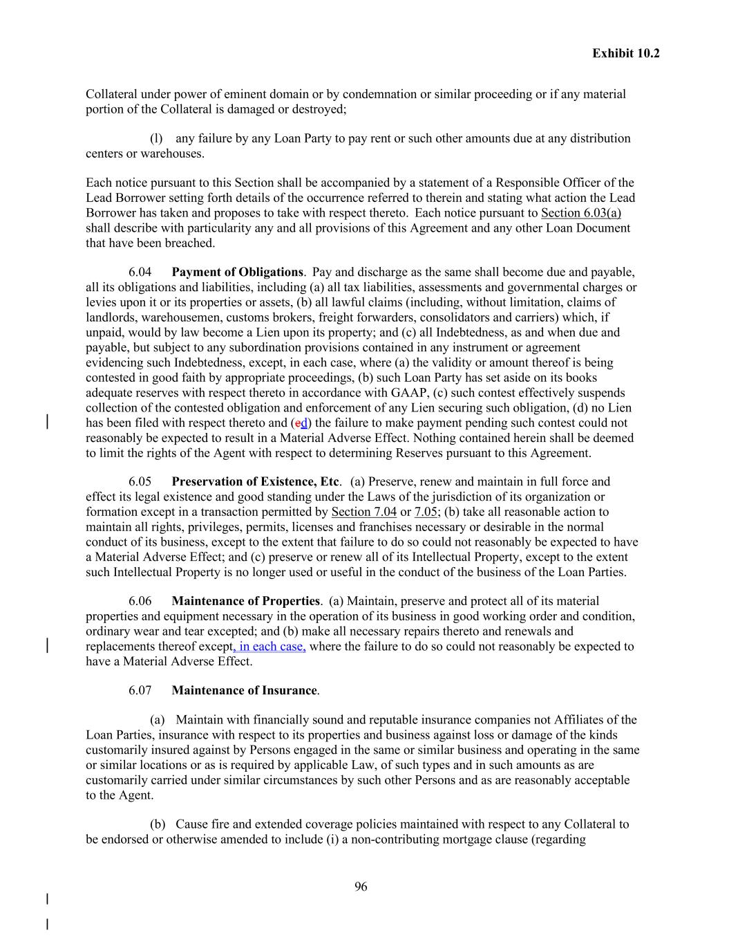 96 Exhibit 10.2 Collateral under power of eminent domain or by condemnation or similar proceeding or if any material portion of the Collateral is damaged or destroyed; (l) any failure by any Loan Party to pay rent or such other amounts due at any distribution centers or warehouses. Each notice pursuant to this Section shall be accompanied by a statement of a Responsible Officer of the Lead Borrower setting forth details of the occurrence referred to therein and stating what action the Lead Borrower has taken and proposes to take with respect thereto. Each notice pursuant to Section 6.03(a) shall describe with particularity any and all provisions of this Agreement and any other Loan Document that have been breached. 6.04 Payment of Obligations. Pay and discharge as the same shall become due and payable, all its obligations and liabilities, including (a) all tax liabilities, assessments and governmental charges or levies upon it or its properties or assets, (b) all lawful claims (including, without limitation, claims of landlords, warehousemen, customs brokers, freight forwarders, consolidators and carriers) which, if unpaid, would by law become a Lien upon its property; and (c) all Indebtedness, as and when due and payable, but subject to any subordination provisions contained in any instrument or agreement evidencing such Indebtedness, except, in each case, where (a) the validity or amount thereof is being contested in good faith by appropriate proceedings, (b) such Loan Party has set aside on its books adequate reserves with respect thereto in accordance with GAAP, (c) such contest effectively suspends collection of the contested obligation and enforcement of any Lien securing such obligation, (d) no Lien has been filed with respect thereto and (ed) the failure to make payment pending such contest could not reasonably be expected to result in a Material Adverse Effect. Nothing contained herein shall be deemed to limit the rights of the Agent with respect to determining Reserves pursuant to this Agreement. 6.05 Preservation of Existence, Etc. (a) Preserve, renew and maintain in full force and effect its legal existence and good standing under the Laws of the jurisdiction of its organization or formation except in a transaction permitted by Section 7.04 or 7.05; (b) take all reasonable action to maintain all rights, privileges, permits, licenses and franchises necessary or desirable in the normal conduct of its business, except to the extent that failure to do so could not reasonably be expected to have a Material Adverse Effect; and (c) preserve or renew all of its Intellectual Property, except to the extent such Intellectual Property is no longer used or useful in the conduct of the business of the Loan Parties. 6.06 Maintenance of Properties. (a) Maintain, preserve and protect all of its material properties and equipment necessary in the operation of its business in good working order and condition, ordinary wear and tear excepted; and (b) make all necessary repairs thereto and renewals and replacements thereof except, in each case, where the failure to do so could not reasonably be expected to have a Material Adverse Effect. 6.07 Maintenance of Insurance. (a) Maintain with financially sound and reputable insurance companies not Affiliates of the Loan Parties, insurance with respect to its properties and business against loss or damage of the kinds customarily insured against by Persons engaged in the same or similar business and operating in the same or similar locations or as is required by applicable Law, of such types and in such amounts as are customarily carried under similar circumstances by such other Persons and as are reasonably acceptable to the Agent. (b) Cause fire and extended coverage policies maintained with respect to any Collateral to be endorsed or otherwise amended to include (i) a non-contributing mortgage clause (regarding
