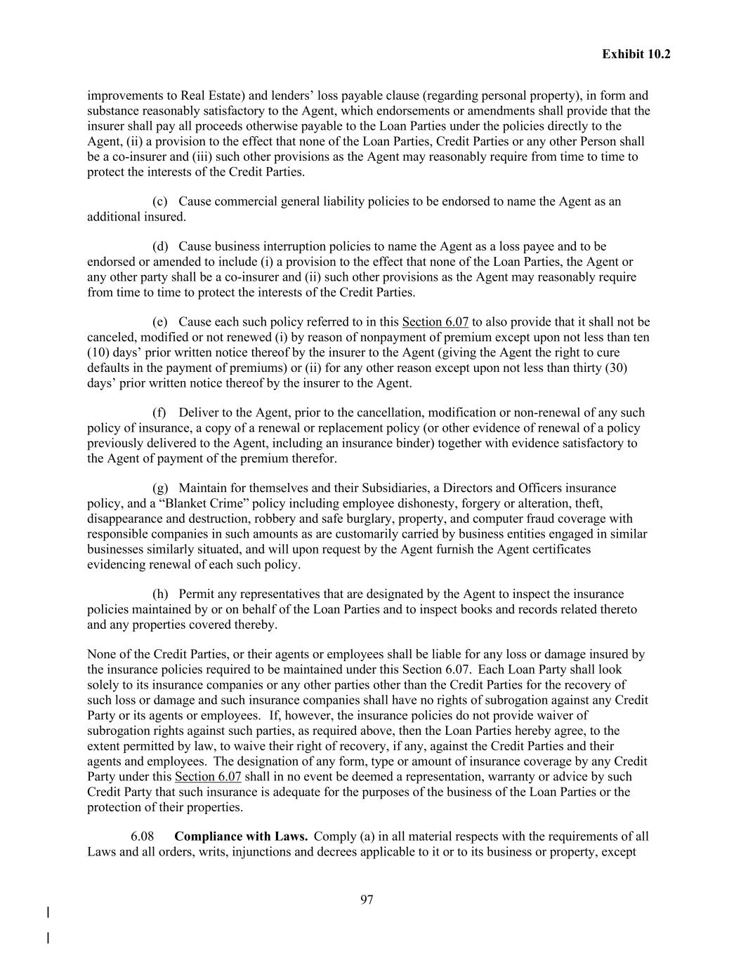 97 Exhibit 10.2 improvements to Real Estate) and lenders’ loss payable clause (regarding personal property), in form and substance reasonably satisfactory to the Agent, which endorsements or amendments shall provide that the insurer shall pay all proceeds otherwise payable to the Loan Parties under the policies directly to the Agent, (ii) a provision to the effect that none of the Loan Parties, Credit Parties or any other Person shall be a co-insurer and (iii) such other provisions as the Agent may reasonably require from time to time to protect the interests of the Credit Parties. (c) Cause commercial general liability policies to be endorsed to name the Agent as an additional insured. (d) Cause business interruption policies to name the Agent as a loss payee and to be endorsed or amended to include (i) a provision to the effect that none of the Loan Parties, the Agent or any other party shall be a co-insurer and (ii) such other provisions as the Agent may reasonably require from time to time to protect the interests of the Credit Parties. (e) Cause each such policy referred to in this Section 6.07 to also provide that it shall not be canceled, modified or not renewed (i) by reason of nonpayment of premium except upon not less than ten (10) days’ prior written notice thereof by the insurer to the Agent (giving the Agent the right to cure defaults in the payment of premiums) or (ii) for any other reason except upon not less than thirty (30) days’ prior written notice thereof by the insurer to the Agent. (f) Deliver to the Agent, prior to the cancellation, modification or non-renewal of any such policy of insurance, a copy of a renewal or replacement policy (or other evidence of renewal of a policy previously delivered to the Agent, including an insurance binder) together with evidence satisfactory to the Agent of payment of the premium therefor. (g) Maintain for themselves and their Subsidiaries, a Directors and Officers insurance policy, and a “Blanket Crime” policy including employee dishonesty, forgery or alteration, theft, disappearance and destruction, robbery and safe burglary, property, and computer fraud coverage with responsible companies in such amounts as are customarily carried by business entities engaged in similar businesses similarly situated, and will upon request by the Agent furnish the Agent certificates evidencing renewal of each such policy. (h) Permit any representatives that are designated by the Agent to inspect the insurance policies maintained by or on behalf of the Loan Parties and to inspect books and records related thereto and any properties covered thereby. None of the Credit Parties, or their agents or employees shall be liable for any loss or damage insured by the insurance policies required to be maintained under this Section 6.07. Each Loan Party shall look solely to its insurance companies or any other parties other than the Credit Parties for the recovery of such loss or damage and such insurance companies shall have no rights of subrogation against any Credit Party or its agents or employees. If, however, the insurance policies do not provide waiver of subrogation rights against such parties, as required above, then the Loan Parties hereby agree, to the extent permitted by law, to waive their right of recovery, if any, against the Credit Parties and their agents and employees. The designation of any form, type or amount of insurance coverage by any Credit Party under this Section 6.07 shall in no event be deemed a representation, warranty or advice by such Credit Party that such insurance is adequate for the purposes of the business of the Loan Parties or the protection of their properties. 6.08 Compliance with Laws. Comply (a) in all material respects with the requirements of all Laws and all orders, writs, injunctions and decrees applicable to it or to its business or property, except