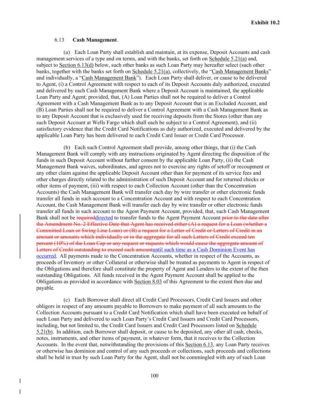 100 Exhibit 10.2 6.13 Cash Management. (a) Each Loan Party shall establish and maintain, at its expense, Deposit Accounts and cash management services of a type and on terms, and with the banks, set forth on Schedule 5.21(a) and, subject to Section 6.13(d) below, such other banks as such Loan Party may hereafter select (such other banks, together with the banks set forth on Schedule 5.21(a), collectively, the “Cash Management Banks” and individually, a “Cash Management Bank”). Each Loan Party shall deliver, or cause to be delivered to Agent, (i) a Control Agreement with respect to each of its Deposit Accounts duly authorized, executed and delivered by each Cash Management Bank where a Deposit Account is maintained, the applicable Loan Party and Agent; provided, that, (A) Loan Parties shall not be required to deliver a Control Agreement with a Cash Management Bank as to any Deposit Account that is an Excluded Account, and (B) Loan Parties shall not be required to deliver a Control Agreement with a Cash Management Bank as to any Deposit Account that is exclusively used for receiving deposits from the Stores (other than any such Deposit Account at Wells Fargo which shall each be subject to a Control Agreement), and (ii) satisfactory evidence that the Credit Card Notifications as duly authorized, executed and delivered by the applicable Loan Party has been delivered to each Credit Card Issuer or Credit Card Processor. (b) Each such Control Agreement shall provide, among other things, that (i) the Cash Management Bank will comply with any instructions originated by Agent directing the disposition of the funds in such Deposit Account without further consent by the applicable Loan Party, (ii) the Cash Management Bank waives, subordinates, and agrees not to exercise any rights of setoff or recoupment or any other claim against the applicable Deposit Account other than for payment of its service fees and other charges directly related to the administration of such Deposit Account and for returned checks or other items of payment, (iii) with respect to each Collection Account (other than the Concentration Accounts) the Cash Management Bank will transfer each day by wire transfer or other electronic funds transfer all funds in such account to a Concentration Account and with respect to each Concentration Account, the Cash Management Bank will transfer each day by wire transfer or other electronic funds transfer all funds in such account to the Agent Payment Account, provided, that, such Cash Management Bank shall not be requireddirected to transfer funds to the Agent Payment Account prior to the date after the Amendment No. 2 Effective Date that Agent has received either (A) a request for a Loan (whether a Committed Loan or Swing Line Loan) or (B) a request for a Letter of Credit or Letters of Credit in an amount or amounts which individually or in the aggregate for all such Letters of Credit exceed ten percent (10%) of the Loan Cap or any request or requests which would cause the aggregate amount of Letters of Credit outstanding to exceed such amountuntil such time as a Cash Dominion Event has occurred. All payments made to the Concentration Accounts, whether in respect of the Accounts, as proceeds of Inventory or other Collateral or otherwise shall be treated as payments to Agent in respect of the Obligations and therefore shall constitute the property of Agent and Lenders to the extent of the then outstanding Obligations. All funds received in the Agent Payment Account shall be applied to the Obligations as provided in accordance with Section 8.03 of this Agreement to the extent then due and payable. (c) Each Borrower shall direct all Credit Card Processors, Credit Card Issuers and other obligors in respect of any amounts payable to Borrowers to make payment of all such amounts to the Collection Accounts pursuant to a Credit Card Notification which shall have been executed on behalf of such Loan Party and delivered to such Loan Party’s Credit Card Issuers and Credit Card Processors, including, but not limited to, the Credit Card Issuers and Credit Card Processors listed on Schedule 5.21(b). In addition, each Borrower shall deposit, or cause to be deposited, any other all cash, checks, notes, instruments, and other items of payment, in whatever form, that it receives to the Collection Accounts. In the event that, notwithstanding the provisions of this Section 6.13, any Loan Party receives or otherwise has dominion and control of any such proceeds or collections, such proceeds and collections shall be held in trust by such Loan Party for the Agent, shall not be commingled with any of such Loan