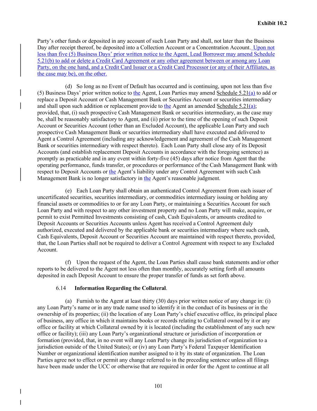 101 Exhibit 10.2 Party’s other funds or deposited in any account of such Loan Party and shall, not later than the Business Day after receipt thereof, be deposited into a Collection Account or a Concentration Account. Upon not less than five (5) Business Days’ prior written notice to the Agent, Lead Borrower may amend Schedule 5.21(b) to add or delete a Credit Card Agreement or any other agreement between or among any Loan Party, on the one hand, and a Credit Card Issuer or a Credit Card Processor (or any of their Affiliates, as the case may be), on the other. (d) So long as no Event of Default has occurred and is continuing, upon not less than five (5) Business Days’ prior written notice to the Agent, Loan Parties may amend Schedule 5.21(a) to add or replace a Deposit Account or Cash Management Bank or Securities Account or securities intermediary and shall upon such addition or replacement provide to the Agent an amended Schedule 5.21(a); provided, that, (i) such prospective Cash Management Bank or securities intermediary, as the case may be, shall be reasonably satisfactory to Agent, and (ii) prior to the time of the opening of such Deposit Account or Securities Account (other than an Excluded Account), the applicable Loan Party and such prospective Cash Management Bank or securities intermediary shall have executed and delivered to Agent a Control Agreement (including any acknowledgement and agreement of the Cash Management Bank or securities intermediary with respect thereto). Each Loan Party shall close any of its Deposit Accounts (and establish replacement Deposit Accounts in accordance with the foregoing sentence) as promptly as practicable and in any event within forty-five (45) days after notice from Agent that the operating performance, funds transfer, or procedures or performance of the Cash Management Bank with respect to Deposit Accounts or the Agent’s liability under any Control Agreement with such Cash Management Bank is no longer satisfactory in the Agent’s reasonable judgment. (e) Each Loan Party shall obtain an authenticated Control Agreement from each issuer of uncertificated securities, securities intermediary, or commodities intermediary issuing or holding any financial assets or commodities to or for any Loan Party, or maintaining a Securities Account for such Loan Party and with respect to any other investment property and no Loan Party will make, acquire, or permit to exist Permitted Investments consisting of cash, Cash Equivalents, or amounts credited to Deposit Accounts or Securities Accounts unless Agent has received a Control Agreement duly authorized, executed and delivered by the applicable bank or securities intermediary where such cash, Cash Equivalents, Deposit Account or Securities Account are maintained with respect thereto, provided, that, the Loan Parties shall not be required to deliver a Control Agreement with respect to any Excluded Account. (f) Upon the request of the Agent, the Loan Parties shall cause bank statements and/or other reports to be delivered to the Agent not less often than monthly, accurately setting forth all amounts deposited in each Deposit Account to ensure the proper transfer of funds as set forth above. 6.14 Information Regarding the Collateral. (a) Furnish to the Agent at least thirty (30) days prior written notice of any change in: (i) any Loan Party’s name or in any trade name used to identify it in the conduct of its business or in the ownership of its properties; (ii) the location of any Loan Party’s chief executive office, its principal place of business, any office in which it maintains books or records relating to Collateral owned by it or any office or facility at which Collateral owned by it is located (including the establishment of any such new office or facility); (iii) any Loan Party’s organizational structure or jurisdiction of incorporation or formation (provided, that, in no event will any Loan Party change its jurisdiction of organization to a jurisdiction outside of the United States); or (iv) any Loan Party’s Federal Taxpayer Identification Number or organizational identification number assigned to it by its state of organization. The Loan Parties agree not to effect or permit any change referred to in the preceding sentence unless all filings have been made under the UCC or otherwise that are required in order for the Agent to continue at all