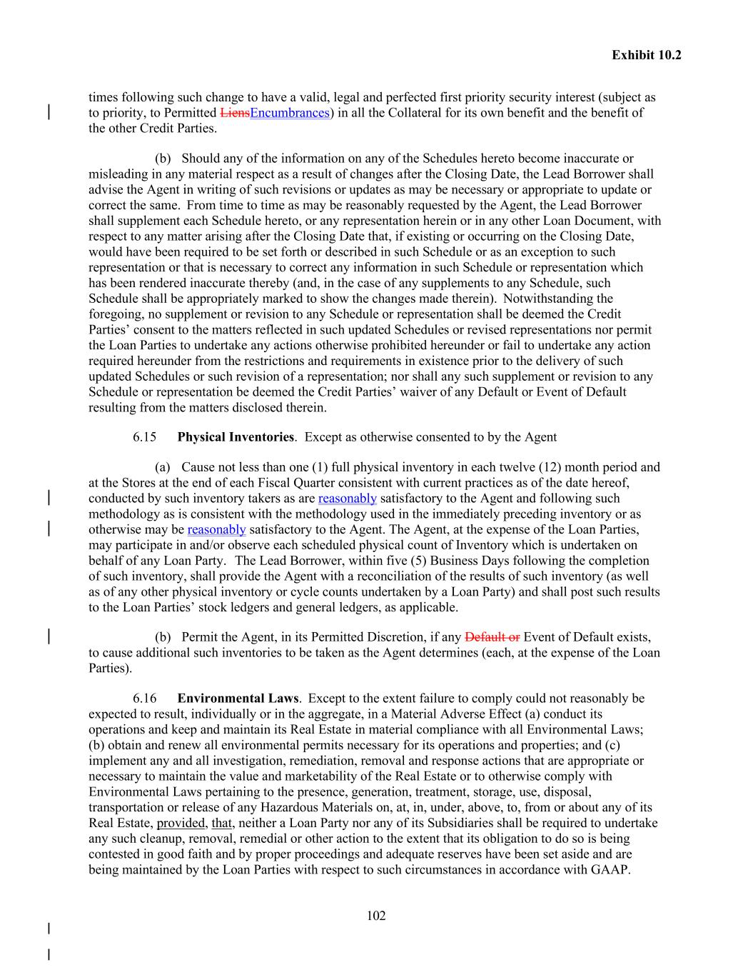 102 Exhibit 10.2 times following such change to have a valid, legal and perfected first priority security interest (subject as to priority, to Permitted LiensEncumbrances) in all the Collateral for its own benefit and the benefit of the other Credit Parties. (b) Should any of the information on any of the Schedules hereto become inaccurate or misleading in any material respect as a result of changes after the Closing Date, the Lead Borrower shall advise the Agent in writing of such revisions or updates as may be necessary or appropriate to update or correct the same. From time to time as may be reasonably requested by the Agent, the Lead Borrower shall supplement each Schedule hereto, or any representation herein or in any other Loan Document, with respect to any matter arising after the Closing Date that, if existing or occurring on the Closing Date, would have been required to be set forth or described in such Schedule or as an exception to such representation or that is necessary to correct any information in such Schedule or representation which has been rendered inaccurate thereby (and, in the case of any supplements to any Schedule, such Schedule shall be appropriately marked to show the changes made therein). Notwithstanding the foregoing, no supplement or revision to any Schedule or representation shall be deemed the Credit Parties’ consent to the matters reflected in such updated Schedules or revised representations nor permit the Loan Parties to undertake any actions otherwise prohibited hereunder or fail to undertake any action required hereunder from the restrictions and requirements in existence prior to the delivery of such updated Schedules or such revision of a representation; nor shall any such supplement or revision to any Schedule or representation be deemed the Credit Parties’ waiver of any Default or Event of Default resulting from the matters disclosed therein. 6.15 Physical Inventories. Except as otherwise consented to by the Agent (a) Cause not less than one (1) full physical inventory in each twelve (12) month period and at the Stores at the end of each Fiscal Quarter consistent with current practices as of the date hereof, conducted by such inventory takers as are reasonably satisfactory to the Agent and following such methodology as is consistent with the methodology used in the immediately preceding inventory or as otherwise may be reasonably satisfactory to the Agent. The Agent, at the expense of the Loan Parties, may participate in and/or observe each scheduled physical count of Inventory which is undertaken on behalf of any Loan Party. The Lead Borrower, within five (5) Business Days following the completion of such inventory, shall provide the Agent with a reconciliation of the results of such inventory (as well as of any other physical inventory or cycle counts undertaken by a Loan Party) and shall post such results to the Loan Parties’ stock ledgers and general ledgers, as applicable. (b) Permit the Agent, in its Permitted Discretion, if any Default or Event of Default exists, to cause additional such inventories to be taken as the Agent determines (each, at the expense of the Loan Parties). 6.16 Environmental Laws. Except to the extent failure to comply could not reasonably be expected to result, individually or in the aggregate, in a Material Adverse Effect (a) conduct its operations and keep and maintain its Real Estate in material compliance with all Environmental Laws; (b) obtain and renew all environmental permits necessary for its operations and properties; and (c) implement any and all investigation, remediation, removal and response actions that are appropriate or necessary to maintain the value and marketability of the Real Estate or to otherwise comply with Environmental Laws pertaining to the presence, generation, treatment, storage, use, disposal, transportation or release of any Hazardous Materials on, at, in, under, above, to, from or about any of its Real Estate, provided, that, neither a Loan Party nor any of its Subsidiaries shall be required to undertake any such cleanup, removal, remedial or other action to the extent that its obligation to do so is being contested in good faith and by proper proceedings and adequate reserves have been set aside and are being maintained by the Loan Parties with respect to such circumstances in accordance with GAAP.