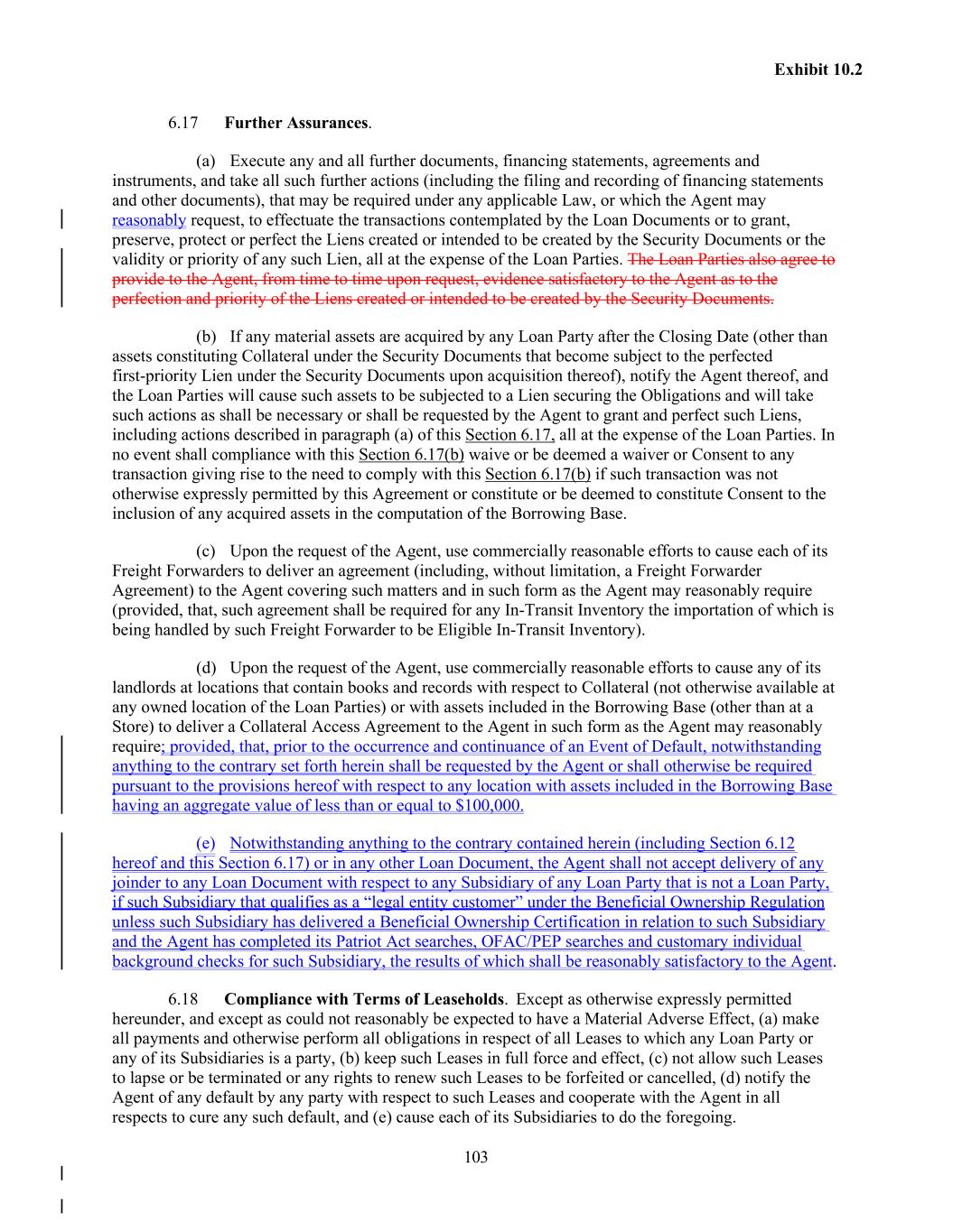 103 Exhibit 10.2 6.17 Further Assurances. (a) Execute any and all further documents, financing statements, agreements and instruments, and take all such further actions (including the filing and recording of financing statements and other documents), that may be required under any applicable Law, or which the Agent may reasonably request, to effectuate the transactions contemplated by the Loan Documents or to grant, preserve, protect or perfect the Liens created or intended to be created by the Security Documents or the validity or priority of any such Lien, all at the expense of the Loan Parties. The Loan Parties also agree to provide to the Agent, from time to time upon request, evidence satisfactory to the Agent as to the perfection and priority of the Liens created or intended to be created by the Security Documents. (b) If any material assets are acquired by any Loan Party after the Closing Date (other than assets constituting Collateral under the Security Documents that become subject to the perfected first-priority Lien under the Security Documents upon acquisition thereof), notify the Agent thereof, and the Loan Parties will cause such assets to be subjected to a Lien securing the Obligations and will take such actions as shall be necessary or shall be requested by the Agent to grant and perfect such Liens, including actions described in paragraph (a) of this Section 6.17, all at the expense of the Loan Parties. In no event shall compliance with this Section 6.17(b) waive or be deemed a waiver or Consent to any transaction giving rise to the need to comply with this Section 6.17(b) if such transaction was not otherwise expressly permitted by this Agreement or constitute or be deemed to constitute Consent to the inclusion of any acquired assets in the computation of the Borrowing Base. (c) Upon the request of the Agent, use commercially reasonable efforts to cause each of its Freight Forwarders to deliver an agreement (including, without limitation, a Freight Forwarder Agreement) to the Agent covering such matters and in such form as the Agent may reasonably require (provided, that, such agreement shall be required for any In-Transit Inventory the importation of which is being handled by such Freight Forwarder to be Eligible In-Transit Inventory). (d) Upon the request of the Agent, use commercially reasonable efforts to cause any of its landlords at locations that contain books and records with respect to Collateral (not otherwise available at any owned location of the Loan Parties) or with assets included in the Borrowing Base (other than at a Store) to deliver a Collateral Access Agreement to the Agent in such form as the Agent may reasonably require; provided, that, prior to the occurrence and continuance of an Event of Default, notwithstanding anything to the contrary set forth herein shall be requested by the Agent or shall otherwise be required pursuant to the provisions hereof with respect to any location with assets included in the Borrowing Base having an aggregate value of less than or equal to $100,000. (e) Notwithstanding anything to the contrary contained herein (including Section 6.12 hereof and this Section 6.17) or in any other Loan Document, the Agent shall not accept delivery of any joinder to any Loan Document with respect to any Subsidiary of any Loan Party that is not a Loan Party, if such Subsidiary that qualifies as a “legal entity customer” under the Beneficial Ownership Regulation unless such Subsidiary has delivered a Beneficial Ownership Certification in relation to such Subsidiary and the Agent has completed its Patriot Act searches, OFAC/PEP searches and customary individual background checks for such Subsidiary, the results of which shall be reasonably satisfactory to the Agent. 6.18 Compliance with Terms of Leaseholds. Except as otherwise expressly permitted hereunder, and except as could not reasonably be expected to have a Material Adverse Effect, (a) make all payments and otherwise perform all obligations in respect of all Leases to which any Loan Party or any of its Subsidiaries is a party, (b) keep such Leases in full force and effect, (c) not allow such Leases to lapse or be terminated or any rights to renew such Leases to be forfeited or cancelled, (d) notify the Agent of any default by any party with respect to such Leases and cooperate with the Agent in all respects to cure any such default, and (e) cause each of its Subsidiaries to do the foregoing.