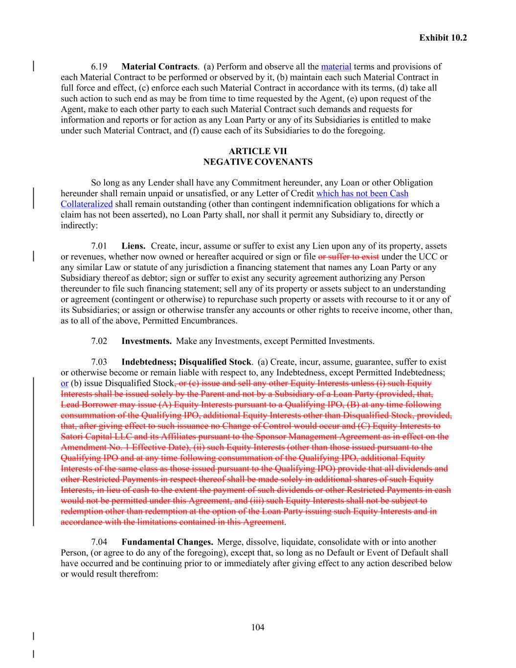 104 Exhibit 10.2 6.19 Material Contracts. (a) Perform and observe all the material terms and provisions of each Material Contract to be performed or observed by it, (b) maintain each such Material Contract in full force and effect, (c) enforce each such Material Contract in accordance with its terms, (d) take all such action to such end as may be from time to time requested by the Agent, (e) upon request of the Agent, make to each other party to each such Material Contract such demands and requests for information and reports or for action as any Loan Party or any of its Subsidiaries is entitled to make under such Material Contract, and (f) cause each of its Subsidiaries to do the foregoing. ARTICLE VII NEGATIVE COVENANTS So long as any Lender shall have any Commitment hereunder, any Loan or other Obligation hereunder shall remain unpaid or unsatisfied, or any Letter of Credit which has not been Cash Collateralized shall remain outstanding (other than contingent indemnification obligations for which a claim has not been asserted), no Loan Party shall, nor shall it permit any Subsidiary to, directly or indirectly: 7.01 Liens. Create, incur, assume or suffer to exist any Lien upon any of its property, assets or revenues, whether now owned or hereafter acquired or sign or file or suffer to exist under the UCC or any similar Law or statute of any jurisdiction a financing statement that names any Loan Party or any Subsidiary thereof as debtor; sign or suffer to exist any security agreement authorizing any Person thereunder to file such financing statement; sell any of its property or assets subject to an understanding or agreement (contingent or otherwise) to repurchase such property or assets with recourse to it or any of its Subsidiaries; or assign or otherwise transfer any accounts or other rights to receive income, other than, as to all of the above, Permitted Encumbrances. 7.02 Investments. Make any Investments, except Permitted Investments. 7.03 Indebtedness; Disqualified Stock. (a) Create, incur, assume, guarantee, suffer to exist or otherwise become or remain liable with respect to, any Indebtedness, except Permitted Indebtedness; or (b) issue Disqualified Stock, or (c) issue and sell any other Equity Interests unless (i) such Equity Interests shall be issued solely by the Parent and not by a Subsidiary of a Loan Party (provided, that, Lead Borrower may issue (A) Equity Interests pursuant to a Qualifying IPO, (B) at any time following consummation of the Qualifying IPO, additional Equity Interests other than Disqualified Stock, provided, that, after giving effect to such issuance no Change of Control would occur and (C) Equity Interests to Satori Capital LLC and its Affiliates pursuant to the Sponsor Management Agreement as in effect on the Amendment No. 1 Effective Date), (ii) such Equity Interests (other than those issued pursuant to the Qualifying IPO and at any time following consummation of the Qualifying IPO, additional Equity Interests of the same class as those issued pursuant to the Qualifying IPO) provide that all dividends and other Restricted Payments in respect thereof shall be made solely in additional shares of such Equity Interests, in lieu of cash to the extent the payment of such dividends or other Restricted Payments in cash would not be permitted under this Agreement, and (iii) such Equity Interests shall not be subject to redemption other than redemption at the option of the Loan Party issuing such Equity Interests and in accordance with the limitations contained in this Agreement. 7.04 Fundamental Changes. Merge, dissolve, liquidate, consolidate with or into another Person, (or agree to do any of the foregoing), except that, so long as no Default or Event of Default shall have occurred and be continuing prior to or immediately after giving effect to any action described below or would result therefrom: