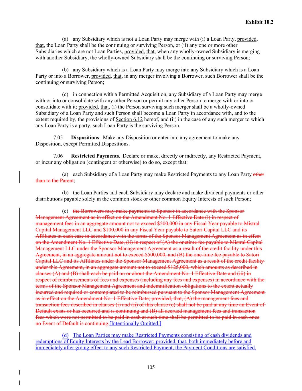 105 Exhibit 10.2 (a) any Subsidiary which is not a Loan Party may merge with (i) a Loan Party, provided, that, the Loan Party shall be the continuing or surviving Person, or (ii) any one or more other Subsidiaries which are not Loan Parties, provided, that, when any wholly-owned Subsidiary is merging with another Subsidiary, the wholly-owned Subsidiary shall be the continuing or surviving Person; (b) any Subsidiary which is a Loan Party may merge into any Subsidiary which is a Loan Party or into a Borrower, provided, that, in any merger involving a Borrower, such Borrower shall be the continuing or surviving Person; (c) in connection with a Permitted Acquisition, any Subsidiary of a Loan Party may merge with or into or consolidate with any other Person or permit any other Person to merge with or into or consolidate with it; provided, that, (i) the Person surviving such merger shall be a wholly-owned Subsidiary of a Loan Party and such Person shall become a Loan Party in accordance with, and to the extent required by, the provisions of Section 6.12 hereof, and (ii) in the case of any such merger to which any Loan Party is a party, such Loan Party is the surviving Person. 7.05 Dispositions. Make any Disposition or enter into any agreement to make any Disposition, except Permitted Dispositions. 7.06 Restricted Payments. Declare or make, directly or indirectly, any Restricted Payment, or incur any obligation (contingent or otherwise) to do so, except that: (a) each Subsidiary of a Loan Party may make Restricted Payments to any Loan Party other than to the Parent; (b) the Loan Parties and each Subsidiary may declare and make dividend payments or other distributions payable solely in the common stock or other common Equity Interests of such Person; (c) the Borrowers may make payments to Sponsor in accordance with the Sponsor Management Agreement as in effect on the Amendment No. 1 Effective Date (i) in respect of management fees in an aggregate amount not to exceed $500,000 in any Fiscal Year payable to Mistral Capital Management LLC and $100,000 in any Fiscal Year payable to Satori Capital LLC and its Affiliates in each case in accordance with the terms of the Sponsor Management Agreement as in effect on the Amendment No. 1 Effective Date, (ii) in respect of (A) the onetime fee payable to Mistral Capital Management LLC under the Sponsor Management Agreement as a result of the credit facility under this Agreement, in an aggregate amount not to exceed $500,000, and (B) the one-time fee payable to Satori Capital LLC and its Affiliates under the Sponsor Management Agreement as a result of the credit facility under this Agreement, in an aggregate amount not to exceed $125,000, which amounts as described in clauses (A) and (B) shall each be paid on or about the Amendment No. 1 Effective Date and (iii) in respect of reimbursements of fees and expenses (including any fees and expenses) in accordance with the terms of the Sponsor Management Agreement and indemnification obligations to the extent actually incurred and required or contemplated to be reimbursed pursuant to the Sponsor Management Agreement as in effect on the Amendment No. 1 Effective Date; provided, that, (A) the management fees and transaction fees described in clauses (i) and (ii) of this clause (c) shall not be paid at any time an Event of Default exists or has occurred and is continuing and (B) all accrued management fees and transaction fees which were not permitted to be paid in cash at such time shall be permitted to be paid in cash once no Event of Default is continuing.[Intentionally Omitted.] (d) The Loan Parties may make Restricted Payments consisting of cash dividends and redemptions of Equity Interests by the Lead Borrower; provided, that, both immediately before and immediately after giving effect to any such Restricted Payment, the Payment Conditions are satisfied.