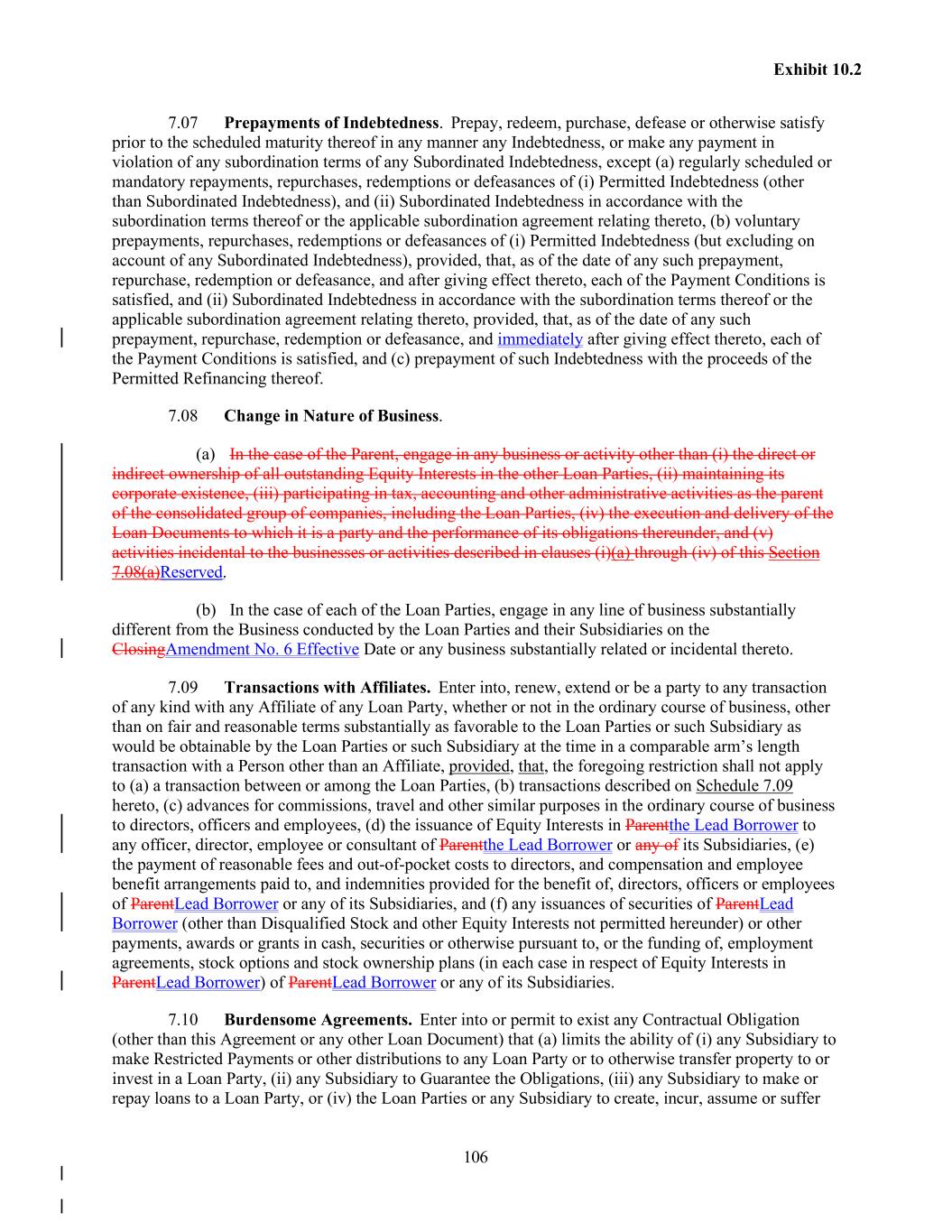 106 Exhibit 10.2 7.07 Prepayments of Indebtedness. Prepay, redeem, purchase, defease or otherwise satisfy prior to the scheduled maturity thereof in any manner any Indebtedness, or make any payment in violation of any subordination terms of any Subordinated Indebtedness, except (a) regularly scheduled or mandatory repayments, repurchases, redemptions or defeasances of (i) Permitted Indebtedness (other than Subordinated Indebtedness), and (ii) Subordinated Indebtedness in accordance with the subordination terms thereof or the applicable subordination agreement relating thereto, (b) voluntary prepayments, repurchases, redemptions or defeasances of (i) Permitted Indebtedness (but excluding on account of any Subordinated Indebtedness), provided, that, as of the date of any such prepayment, repurchase, redemption or defeasance, and after giving effect thereto, each of the Payment Conditions is satisfied, and (ii) Subordinated Indebtedness in accordance with the subordination terms thereof or the applicable subordination agreement relating thereto, provided, that, as of the date of any such prepayment, repurchase, redemption or defeasance, and immediately after giving effect thereto, each of the Payment Conditions is satisfied, and (c) prepayment of such Indebtedness with the proceeds of the Permitted Refinancing thereof. 7.08 Change in Nature of Business. (a) In the case of the Parent, engage in any business or activity other than (i) the direct or indirect ownership of all outstanding Equity Interests in the other Loan Parties, (ii) maintaining its corporate existence, (iii) participating in tax, accounting and other administrative activities as the parent of the consolidated group of companies, including the Loan Parties, (iv) the execution and delivery of the Loan Documents to which it is a party and the performance of its obligations thereunder, and (v) activities incidental to the businesses or activities described in clauses (i)(a) through (iv) of this Section 7.08(a)Reserved. (b) In the case of each of the Loan Parties, engage in any line of business substantially different from the Business conducted by the Loan Parties and their Subsidiaries on the ClosingAmendment No. 6 Effective Date or any business substantially related or incidental thereto. 7.09 Transactions with Affiliates. Enter into, renew, extend or be a party to any transaction of any kind with any Affiliate of any Loan Party, whether or not in the ordinary course of business, other than on fair and reasonable terms substantially as favorable to the Loan Parties or such Subsidiary as would be obtainable by the Loan Parties or such Subsidiary at the time in a comparable arm’s length transaction with a Person other than an Affiliate, provided, that, the foregoing restriction shall not apply to (a) a transaction between or among the Loan Parties, (b) transactions described on Schedule 7.09 hereto, (c) advances for commissions, travel and other similar purposes in the ordinary course of business to directors, officers and employees, (d) the issuance of Equity Interests in Parentthe Lead Borrower to any officer, director, employee or consultant of Parentthe Lead Borrower or any of its Subsidiaries, (e) the payment of reasonable fees and out-of-pocket costs to directors, and compensation and employee benefit arrangements paid to, and indemnities provided for the benefit of, directors, officers or employees of ParentLead Borrower or any of its Subsidiaries, and (f) any issuances of securities of ParentLead Borrower (other than Disqualified Stock and other Equity Interests not permitted hereunder) or other payments, awards or grants in cash, securities or otherwise pursuant to, or the funding of, employment agreements, stock options and stock ownership plans (in each case in respect of Equity Interests in ParentLead Borrower) of ParentLead Borrower or any of its Subsidiaries. 7.10 Burdensome Agreements. Enter into or permit to exist any Contractual Obligation (other than this Agreement or any other Loan Document) that (a) limits the ability of (i) any Subsidiary to make Restricted Payments or other distributions to any Loan Party or to otherwise transfer property to or invest in a Loan Party, (ii) any Subsidiary to Guarantee the Obligations, (iii) any Subsidiary to make or repay loans to a Loan Party, or (iv) the Loan Parties or any Subsidiary to create, incur, assume or suffer