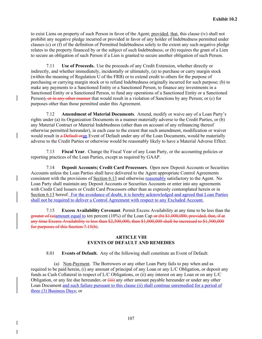 107 Exhibit 10.2 to exist Liens on property of such Person in favor of the Agent; provided, that, this clause (iv) shall not prohibit any negative pledge incurred or provided in favor of any holder of Indebtedness permitted under clauses (c) or (f) of the definition of Permitted Indebtedness solely to the extent any such negative pledge relates to the property financed by or the subject of such Indebtedness; or (b) requires the grant of a Lien to secure an obligation of such Person if a Lien is granted to secure another obligation of such Person. 7.11 Use of Proceeds. Use the proceeds of any Credit Extension, whether directly or indirectly, and whether immediately, incidentally or ultimately, (a) to purchase or carry margin stock (within the meaning of Regulation U of the FRB) or to extend credit to others for the purpose of purchasing or carrying margin stock or to refund Indebtedness originally incurred for such purpose; (b) to make any payments to a Sanctioned Entity or a Sanctioned Person, to finance any investments in a Sanctioned Entity or a Sanctioned Person, to fund any operations of a Sanctioned Entity or a Sanctioned Person), or in any other manner that would result in a violation of Sanctions by any Person; or (c) for purposes other than those permitted under this Agreement. 7.12 Amendment of Material Documents. Amend, modify or waive any of a Loan Party’s rights under (a) its Organization Documents in a manner materially adverse to the Credit Parties, or (b) any Material Contract or Material Indebtedness (other than on account of any refinancing thereof otherwise permitted hereunder), in each case to the extent that such amendment, modification or waiver would result in a Default oran Event of Default under any of the Loan Documents, would be materially adverse to the Credit Parties or otherwise would be reasonably likely to have a Material Adverse Effect. 7.13 Fiscal Year. Change the Fiscal Year of any Loan Party, or the accounting policies or reporting practices of the Loan Parties, except as required by GAAP. 7.14 Deposit Accounts; Credit Card Processors. Open new Deposit Accounts or Securities Accounts unless the Loan Parties shall have delivered to the Agent appropriate Control Agreements consistent with the provisions of Section 6.13 and otherwise reasonably satisfactory to the Agent. No Loan Party shall maintain any Deposit Accounts or Securities Accounts or enter into any agreements with Credit Card Issuers or Credit Card Processors other than as expressly contemplated herein or in Section 6.13 hereof. For the avoidance of doubt, it is hereby acknowledged and agreed that Loan Parties shall not be required to deliver a Control Agreement with respect to any Excluded Account. 7.15 Excess Availability Covenant. Permit Excess Availability at any time to be less than the greater of (a)amount equal to ten percent (10%) of the Loan Cap or (b) $1,000,000; provided, that, if at any time Excess Availability is less than $2,500,000, then $1,000,000 shall be increased to $1,500,000 for purposes of this Section 7.15(b). ARTICLE VIII EVENTS OF DEFAULT AND REMEDIES 8.01 Events of Default. Any of the following shall constitute an Event of Default: (a) Non-Payment. The Borrowers or any other Loan Party fails to pay when and as required to be paid herein, (i) any amount of principal of any Loan or any L/C Obligation, or deposit any funds as Cash Collateral in respect of L/C Obligations, or (ii) any interest on any Loan or on any L/C Obligation, or any fee due hereunder, or (iii) any other amount payable hereunder or under any other Loan Document and such failure pursuant to this clause (ii) shall continue unremedied for a period of three (3) Business Days; or