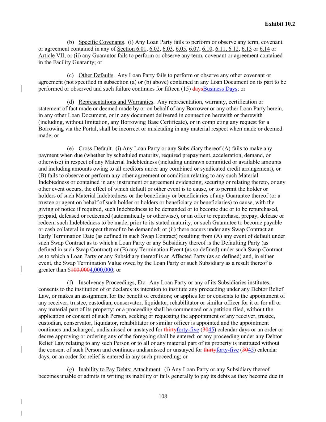 108 Exhibit 10.2 (b) Specific Covenants. (i) Any Loan Party fails to perform or observe any term, covenant or agreement contained in any of Section 6.01, 6.02, 6.03, 6.05, 6.07, 6.10, 6.11, 6.12, 6.13 or 6.14 or Article VII; or (ii) any Guarantor fails to perform or observe any term, covenant or agreement contained in the Facility Guaranty; or (c) Other Defaults. Any Loan Party fails to perform or observe any other covenant or agreement (not specified in subsection (a) or (b) above) contained in any Loan Document on its part to be performed or observed and such failure continues for fifteen (15) daysBusiness Days; or (d) Representations and Warranties. Any representation, warranty, certification or statement of fact made or deemed made by or on behalf of any Borrower or any other Loan Party herein, in any other Loan Document, or in any document delivered in connection herewith or therewith (including, without limitation, any Borrowing Base Certificate), or in completing any request for a Borrowing via the Portal, shall be incorrect or misleading in any material respect when made or deemed made; or (e) Cross-Default. (i) Any Loan Party or any Subsidiary thereof (A) fails to make any payment when due (whether by scheduled maturity, required prepayment, acceleration, demand, or otherwise) in respect of any Material Indebtedness (including undrawn committed or available amounts and including amounts owing to all creditors under any combined or syndicated credit arrangement), or (B) fails to observe or perform any other agreement or condition relating to any such Material Indebtedness or contained in any instrument or agreement evidencing, securing or relating thereto, or any other event occurs, the effect of which default or other event is to cause, or to permit the holder or holders of such Material Indebtedness or the beneficiary or beneficiaries of any Guarantee thereof (or a trustee or agent on behalf of such holder or holders or beneficiary or beneficiaries) to cause, with the giving of notice if required, such Indebtedness to be demanded or to become due or to be repurchased, prepaid, defeased or redeemed (automatically or otherwise), or an offer to repurchase, prepay, defease or redeem such Indebtedness to be made, prior to its stated maturity, or such Guarantee to become payable or cash collateral in respect thereof to be demanded; or (ii) there occurs under any Swap Contract an Early Termination Date (as defined in such Swap Contract) resulting from (A) any event of default under such Swap Contract as to which a Loan Party or any Subsidiary thereof is the Defaulting Party (as defined in such Swap Contract) or (B) any Termination Event (as so defined) under such Swap Contract as to which a Loan Party or any Subsidiary thereof is an Affected Party (as so defined) and, in either event, the Swap Termination Value owed by the Loan Party or such Subsidiary as a result thereof is greater than $100,0004,000,000; or (f) Insolvency Proceedings, Etc. Any Loan Party or any of its Subsidiaries institutes, consents to the institution of or declares its intention to institute any proceeding under any Debtor Relief Law, or makes an assignment for the benefit of creditors; or applies for or consents to the appointment of any receiver, trustee, custodian, conservator, liquidator, rehabilitator or similar officer for it or for all or any material part of its property; or a proceeding shall be commenced or a petition filed, without the application or consent of such Person, seeking or requesting the appointment of any receiver, trustee, custodian, conservator, liquidator, rehabilitator or similar officer is appointed and the appointment continues undischarged, undismissed or unstayed for thirtyforty-five (3045) calendar days or an order or decree approving or ordering any of the foregoing shall be entered; or any proceeding under any Debtor Relief Law relating to any such Person or to all or any material part of its property is instituted without the consent of such Person and continues undismissed or unstayed for thirtyforty-five (3045) calendar days, or an order for relief is entered in any such proceeding; or (g) Inability to Pay Debts; Attachment. (i) Any Loan Party or any Subsidiary thereof becomes unable or admits in writing its inability or fails generally to pay its debts as they become due in