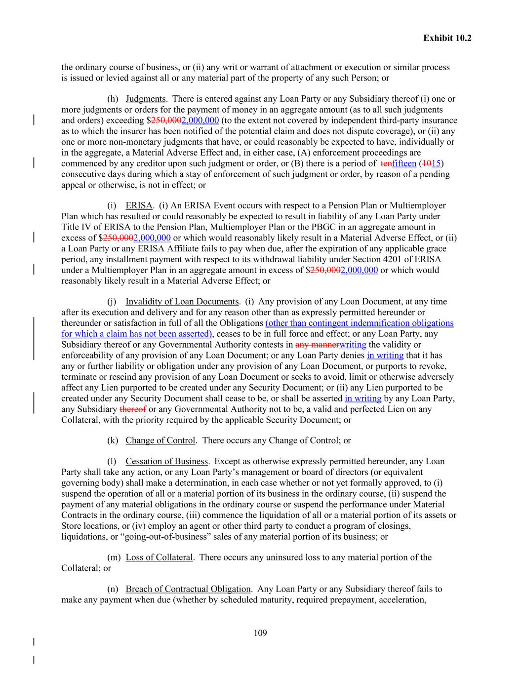 109 Exhibit 10.2 the ordinary course of business, or (ii) any writ or warrant of attachment or execution or similar process is issued or levied against all or any material part of the property of any such Person; or (h) Judgments. There is entered against any Loan Party or any Subsidiary thereof (i) one or more judgments or orders for the payment of money in an aggregate amount (as to all such judgments and orders) exceeding $250,0002,000,000 (to the extent not covered by independent third-party insurance as to which the insurer has been notified of the potential claim and does not dispute coverage), or (ii) any one or more non-monetary judgments that have, or could reasonably be expected to have, individually or in the aggregate, a Material Adverse Effect and, in either case, (A) enforcement proceedings are commenced by any creditor upon such judgment or order, or (B) there is a period of tenfifteen (1015) consecutive days during which a stay of enforcement of such judgment or order, by reason of a pending appeal or otherwise, is not in effect; or (i) ERISA. (i) An ERISA Event occurs with respect to a Pension Plan or Multiemployer Plan which has resulted or could reasonably be expected to result in liability of any Loan Party under Title IV of ERISA to the Pension Plan, Multiemployer Plan or the PBGC in an aggregate amount in excess of $250,0002,000,000 or which would reasonably likely result in a Material Adverse Effect, or (ii) a Loan Party or any ERISA Affiliate fails to pay when due, after the expiration of any applicable grace period, any installment payment with respect to its withdrawal liability under Section 4201 of ERISA under a Multiemployer Plan in an aggregate amount in excess of $250,0002,000,000 or which would reasonably likely result in a Material Adverse Effect; or (j) Invalidity of Loan Documents. (i) Any provision of any Loan Document, at any time after its execution and delivery and for any reason other than as expressly permitted hereunder or thereunder or satisfaction in full of all the Obligations (other than contingent indemnification obligations for which a claim has not been asserted), ceases to be in full force and effect; or any Loan Party, any Subsidiary thereof or any Governmental Authority contests in any mannerwriting the validity or enforceability of any provision of any Loan Document; or any Loan Party denies in writing that it has any or further liability or obligation under any provision of any Loan Document, or purports to revoke, terminate or rescind any provision of any Loan Document or seeks to avoid, limit or otherwise adversely affect any Lien purported to be created under any Security Document; or (ii) any Lien purported to be created under any Security Document shall cease to be, or shall be asserted in writing by any Loan Party, any Subsidiary thereof or any Governmental Authority not to be, a valid and perfected Lien on any Collateral, with the priority required by the applicable Security Document; or (k) Change of Control. There occurs any Change of Control; or (l) Cessation of Business. Except as otherwise expressly permitted hereunder, any Loan Party shall take any action, or any Loan Party’s management or board of directors (or equivalent governing body) shall make a determination, in each case whether or not yet formally approved, to (i) suspend the operation of all or a material portion of its business in the ordinary course, (ii) suspend the payment of any material obligations in the ordinary course or suspend the performance under Material Contracts in the ordinary course, (iii) commence the liquidation of all or a material portion of its assets or Store locations, or (iv) employ an agent or other third party to conduct a program of closings, liquidations, or “going-out-of-business” sales of any material portion of its business; or (m) Loss of Collateral. There occurs any uninsured loss to any material portion of the Collateral; or (n) Breach of Contractual Obligation. Any Loan Party or any Subsidiary thereof fails to make any payment when due (whether by scheduled maturity, required prepayment, acceleration,