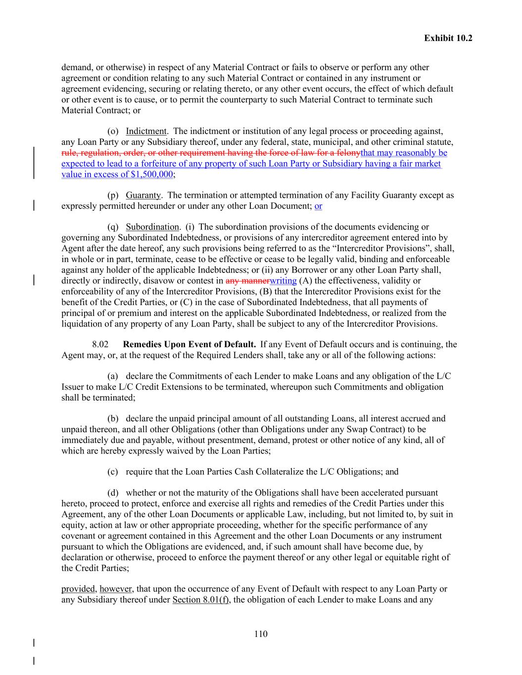 110 Exhibit 10.2 demand, or otherwise) in respect of any Material Contract or fails to observe or perform any other agreement or condition relating to any such Material Contract or contained in any instrument or agreement evidencing, securing or relating thereto, or any other event occurs, the effect of which default or other event is to cause, or to permit the counterparty to such Material Contract to terminate such Material Contract; or (o) Indictment. The indictment or institution of any legal process or proceeding against, any Loan Party or any Subsidiary thereof, under any federal, state, municipal, and other criminal statute, rule, regulation, order, or other requirement having the force of law for a felonythat may reasonably be expected to lead to a forfeiture of any property of such Loan Party or Subsidiary having a fair market value in excess of $1,500,000; (p) Guaranty. The termination or attempted termination of any Facility Guaranty except as expressly permitted hereunder or under any other Loan Document; or (q) Subordination. (i) The subordination provisions of the documents evidencing or governing any Subordinated Indebtedness, or provisions of any intercreditor agreement entered into by Agent after the date hereof, any such provisions being referred to as the “Intercreditor Provisions”, shall, in whole or in part, terminate, cease to be effective or cease to be legally valid, binding and enforceable against any holder of the applicable Indebtedness; or (ii) any Borrower or any other Loan Party shall, directly or indirectly, disavow or contest in any mannerwriting (A) the effectiveness, validity or enforceability of any of the Intercreditor Provisions, (B) that the Intercreditor Provisions exist for the benefit of the Credit Parties, or (C) in the case of Subordinated Indebtedness, that all payments of principal of or premium and interest on the applicable Subordinated Indebtedness, or realized from the liquidation of any property of any Loan Party, shall be subject to any of the Intercreditor Provisions. 8.02 Remedies Upon Event of Default. If any Event of Default occurs and is continuing, the Agent may, or, at the request of the Required Lenders shall, take any or all of the following actions: (a) declare the Commitments of each Lender to make Loans and any obligation of the L/C Issuer to make L/C Credit Extensions to be terminated, whereupon such Commitments and obligation shall be terminated; (b) declare the unpaid principal amount of all outstanding Loans, all interest accrued and unpaid thereon, and all other Obligations (other than Obligations under any Swap Contract) to be immediately due and payable, without presentment, demand, protest or other notice of any kind, all of which are hereby expressly waived by the Loan Parties; (c) require that the Loan Parties Cash Collateralize the L/C Obligations; and (d) whether or not the maturity of the Obligations shall have been accelerated pursuant hereto, proceed to protect, enforce and exercise all rights and remedies of the Credit Parties under this Agreement, any of the other Loan Documents or applicable Law, including, but not limited to, by suit in equity, action at law or other appropriate proceeding, whether for the specific performance of any covenant or agreement contained in this Agreement and the other Loan Documents or any instrument pursuant to which the Obligations are evidenced, and, if such amount shall have become due, by declaration or otherwise, proceed to enforce the payment thereof or any other legal or equitable right of the Credit Parties; provided, however, that upon the occurrence of any Event of Default with respect to any Loan Party or any Subsidiary thereof under Section 8.01(f), the obligation of each Lender to make Loans and any