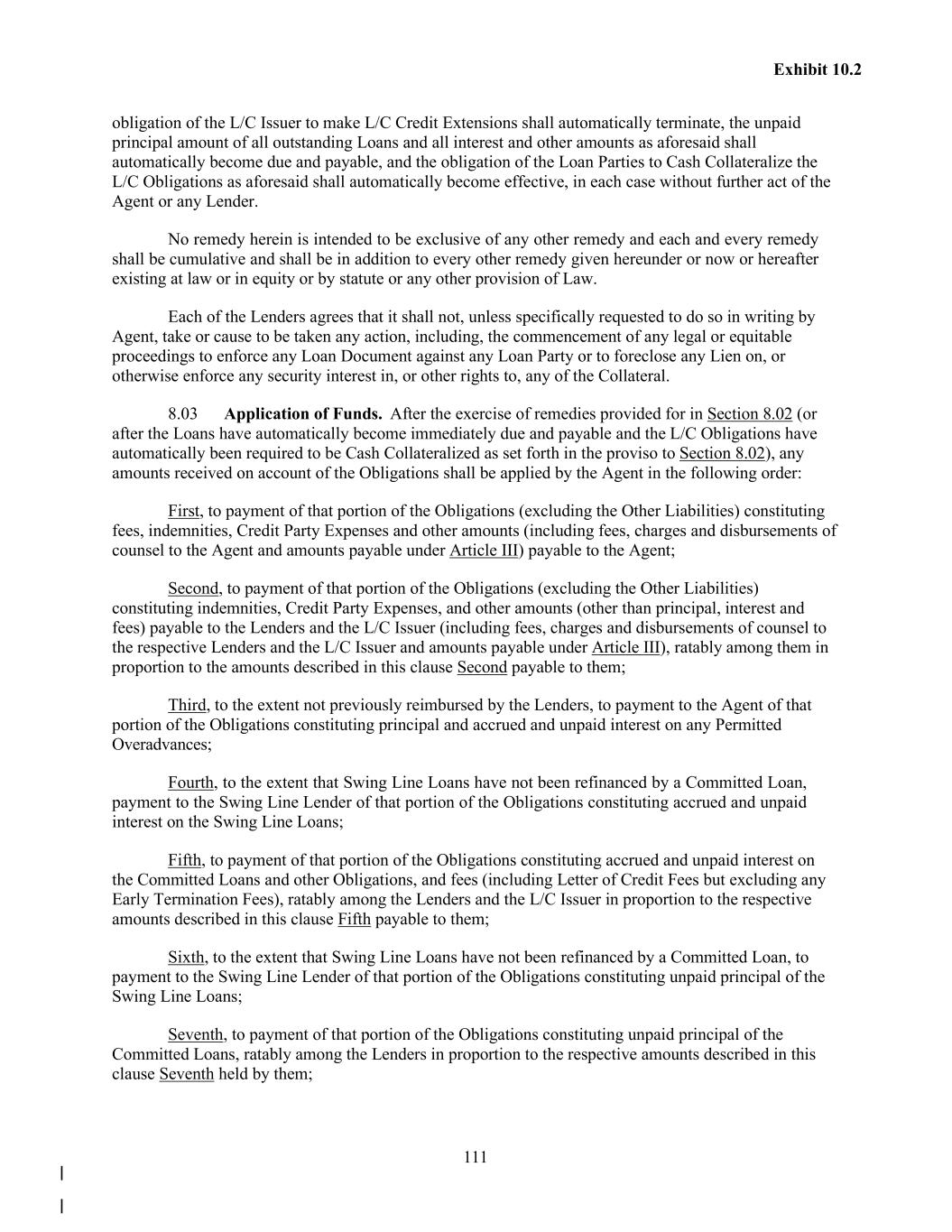 111 Exhibit 10.2 obligation of the L/C Issuer to make L/C Credit Extensions shall automatically terminate, the unpaid principal amount of all outstanding Loans and all interest and other amounts as aforesaid shall automatically become due and payable, and the obligation of the Loan Parties to Cash Collateralize the L/C Obligations as aforesaid shall automatically become effective, in each case without further act of the Agent or any Lender. No remedy herein is intended to be exclusive of any other remedy and each and every remedy shall be cumulative and shall be in addition to every other remedy given hereunder or now or hereafter existing at law or in equity or by statute or any other provision of Law. Each of the Lenders agrees that it shall not, unless specifically requested to do so in writing by Agent, take or cause to be taken any action, including, the commencement of any legal or equitable proceedings to enforce any Loan Document against any Loan Party or to foreclose any Lien on, or otherwise enforce any security interest in, or other rights to, any of the Collateral. 8.03 Application of Funds. After the exercise of remedies provided for in Section 8.02 (or after the Loans have automatically become immediately due and payable and the L/C Obligations have automatically been required to be Cash Collateralized as set forth in the proviso to Section 8.02), any amounts received on account of the Obligations shall be applied by the Agent in the following order: First, to payment of that portion of the Obligations (excluding the Other Liabilities) constituting fees, indemnities, Credit Party Expenses and other amounts (including fees, charges and disbursements of counsel to the Agent and amounts payable under Article III) payable to the Agent; Second, to payment of that portion of the Obligations (excluding the Other Liabilities) constituting indemnities, Credit Party Expenses, and other amounts (other than principal, interest and fees) payable to the Lenders and the L/C Issuer (including fees, charges and disbursements of counsel to the respective Lenders and the L/C Issuer and amounts payable under Article III), ratably among them in proportion to the amounts described in this clause Second payable to them; Third, to the extent not previously reimbursed by the Lenders, to payment to the Agent of that portion of the Obligations constituting principal and accrued and unpaid interest on any Permitted Overadvances; Fourth, to the extent that Swing Line Loans have not been refinanced by a Committed Loan, payment to the Swing Line Lender of that portion of the Obligations constituting accrued and unpaid interest on the Swing Line Loans; Fifth, to payment of that portion of the Obligations constituting accrued and unpaid interest on the Committed Loans and other Obligations, and fees (including Letter of Credit Fees but excluding any Early Termination Fees), ratably among the Lenders and the L/C Issuer in proportion to the respective amounts described in this clause Fifth payable to them; Sixth, to the extent that Swing Line Loans have not been refinanced by a Committed Loan, to payment to the Swing Line Lender of that portion of the Obligations constituting unpaid principal of the Swing Line Loans; Seventh, to payment of that portion of the Obligations constituting unpaid principal of the Committed Loans, ratably among the Lenders in proportion to the respective amounts described in this clause Seventh held by them;