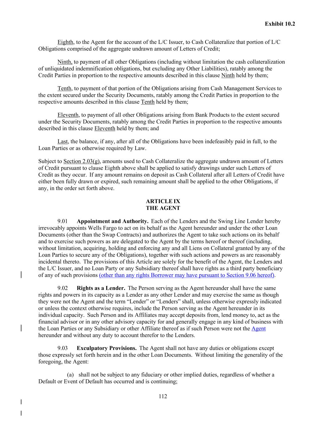 112 Exhibit 10.2 Eighth, to the Agent for the account of the L/C Issuer, to Cash Collateralize that portion of L/C Obligations comprised of the aggregate undrawn amount of Letters of Credit; Ninth, to payment of all other Obligations (including without limitation the cash collateralization of unliquidated indemnification obligations, but excluding any Other Liabilities), ratably among the Credit Parties in proportion to the respective amounts described in this clause Ninth held by them; Tenth, to payment of that portion of the Obligations arising from Cash Management Services to the extent secured under the Security Documents, ratably among the Credit Parties in proportion to the respective amounts described in this clause Tenth held by them; Eleventh, to payment of all other Obligations arising from Bank Products to the extent secured under the Security Documents, ratably among the Credit Parties in proportion to the respective amounts described in this clause Eleventh held by them; and Last, the balance, if any, after all of the Obligations have been indefeasibly paid in full, to the Loan Parties or as otherwise required by Law. Subject to Section 2.03(g), amounts used to Cash Collateralize the aggregate undrawn amount of Letters of Credit pursuant to clause Eighth above shall be applied to satisfy drawings under such Letters of Credit as they occur. If any amount remains on deposit as Cash Collateral after all Letters of Credit have either been fully drawn or expired, such remaining amount shall be applied to the other Obligations, if any, in the order set forth above. ARTICLE IX THE AGENT 9.01 Appointment and Authority. Each of the Lenders and the Swing Line Lender hereby irrevocably appoints Wells Fargo to act on its behalf as the Agent hereunder and under the other Loan Documents (other than the Swap Contracts) and authorizes the Agent to take such actions on its behalf and to exercise such powers as are delegated to the Agent by the terms hereof or thereof (including, without limitation, acquiring, holding and enforcing any and all Liens on Collateral granted by any of the Loan Parties to secure any of the Obligations), together with such actions and powers as are reasonably incidental thereto. The provisions of this Article are solely for the benefit of the Agent, the Lenders and the L/C Issuer, and no Loan Party or any Subsidiary thereof shall have rights as a third party beneficiary of any of such provisions (other than any rights Borrower may have pursuant to Section 9.06 hereof). 9.02 Rights as a Lender. The Person serving as the Agent hereunder shall have the same rights and powers in its capacity as a Lender as any other Lender and may exercise the same as though they were not the Agent and the term “Lender” or “Lenders” shall, unless otherwise expressly indicated or unless the context otherwise requires, include the Person serving as the Agent hereunder in its individual capacity. Such Person and its Affiliates may accept deposits from, lend money to, act as the financial advisor or in any other advisory capacity for and generally engage in any kind of business with the Loan Parties or any Subsidiary or other Affiliate thereof as if such Person were not the Agent hereunder and without any duty to account therefor to the Lenders. 9.03 Exculpatory Provisions. The Agent shall not have any duties or obligations except those expressly set forth herein and in the other Loan Documents. Without limiting the generality of the foregoing, the Agent: (a) shall not be subject to any fiduciary or other implied duties, regardless of whether a Default or Event of Default has occurred and is continuing;