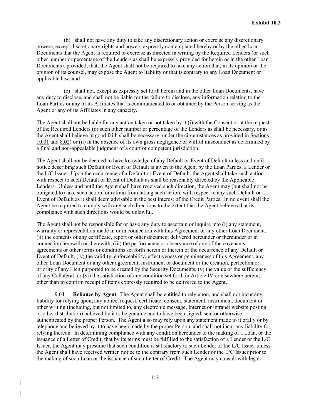 113 Exhibit 10.2 (b) shall not have any duty to take any discretionary action or exercise any discretionary powers, except discretionary rights and powers expressly contemplated hereby or by the other Loan Documents that the Agent is required to exercise as directed in writing by the Required Lenders (or such other number or percentage of the Lenders as shall be expressly provided for herein or in the other Loan Documents), provided, that, the Agent shall not be required to take any action that, in its opinion or the opinion of its counsel, may expose the Agent to liability or that is contrary to any Loan Document or applicable law; and (c) shall not, except as expressly set forth herein and in the other Loan Documents, have any duty to disclose, and shall not be liable for the failure to disclose, any information relating to the Loan Parties or any of its Affiliates that is communicated to or obtained by the Person serving as the Agent or any of its Affiliates in any capacity. The Agent shall not be liable for any action taken or not taken by it (i) with the Consent or at the request of the Required Lenders (or such other number or percentage of the Lenders as shall be necessary, or as the Agent shall believe in good faith shall be necessary, under the circumstances as provided in Sections 10.01 and 8.02) or (ii) in the absence of its own gross negligence or willful misconduct as determined by a final and non-appealable judgment of a court of competent jurisdiction. The Agent shall not be deemed to have knowledge of any Default or Event of Default unless and until notice describing such Default or Event of Default is given to the Agent by the Loan Parties, a Lender or the L/C Issuer. Upon the occurrence of a Default or Event of Default, the Agent shall take such action with respect to such Default or Event of Default as shall be reasonably directed by the Applicable Lenders. Unless and until the Agent shall have received such direction, the Agent may (but shall not be obligated to) take such action, or refrain from taking such action, with respect to any such Default or Event of Default as it shall deem advisable in the best interest of the Credit Parties. In no event shall the Agent be required to comply with any such directions to the extent that the Agent believes that its compliance with such directions would be unlawful. The Agent shall not be responsible for or have any duty to ascertain or inquire into (i) any statement, warranty or representation made in or in connection with this Agreement or any other Loan Document, (ii) the contents of any certificate, report or other document delivered hereunder or thereunder or in connection herewith or therewith, (iii) the performance or observance of any of the covenants, agreements or other terms or conditions set forth herein or therein or the occurrence of any Default or Event of Default, (iv) the validity, enforceability, effectiveness or genuineness of this Agreement, any other Loan Document or any other agreement, instrument or document or the creation, perfection or priority of any Lien purported to be created by the Security Documents, (v) the value or the sufficiency of any Collateral, or (vi) the satisfaction of any condition set forth in Article IV or elsewhere herein, other than to confirm receipt of items expressly required to be delivered to the Agent. 9.04 Reliance by Agent. The Agent shall be entitled to rely upon, and shall not incur any liability for relying upon, any notice, request, certificate, consent, statement, instrument, document or other writing (including, but not limited to, any electronic message, Internet or intranet website posting or other distribution) believed by it to be genuine and to have been signed, sent or otherwise authenticated by the proper Person. The Agent also may rely upon any statement made to it orally or by telephone and believed by it to have been made by the proper Person, and shall not incur any liability for relying thereon. In determining compliance with any condition hereunder to the making of a Loan, or the issuance of a Letter of Credit, that by its terms must be fulfilled to the satisfaction of a Lender or the L/C Issuer, the Agent may presume that such condition is satisfactory to such Lender or the L/C Issuer unless the Agent shall have received written notice to the contrary from such Lender or the L/C Issuer prior to the making of such Loan or the issuance of such Letter of Credit. The Agent may consult with legal