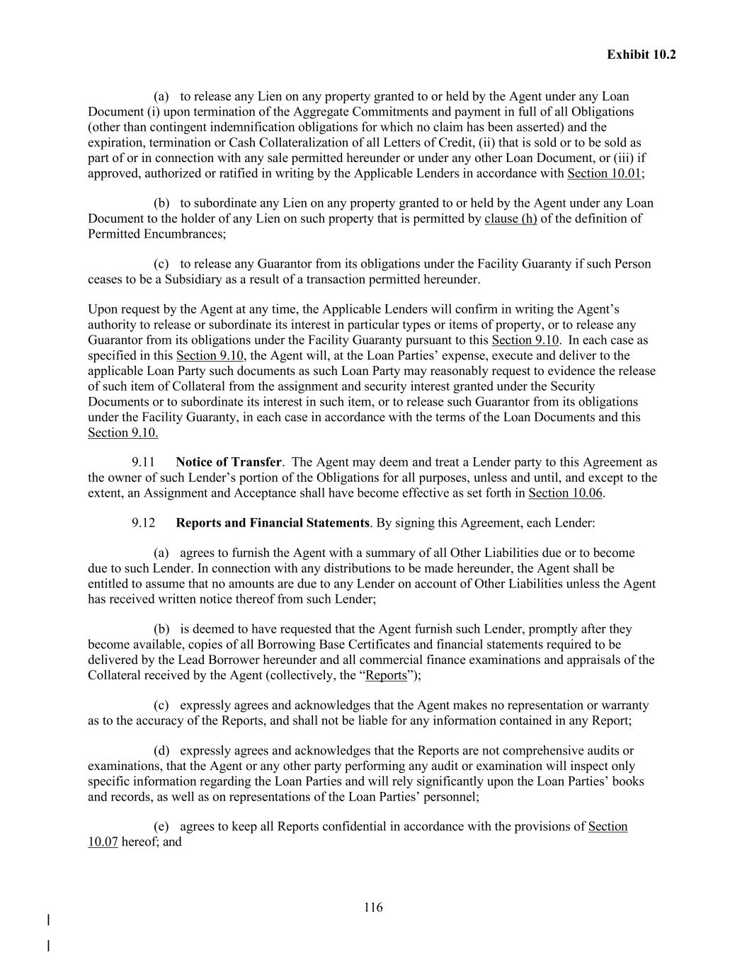 116 Exhibit 10.2 (a) to release any Lien on any property granted to or held by the Agent under any Loan Document (i) upon termination of the Aggregate Commitments and payment in full of all Obligations (other than contingent indemnification obligations for which no claim has been asserted) and the expiration, termination or Cash Collateralization of all Letters of Credit, (ii) that is sold or to be sold as part of or in connection with any sale permitted hereunder or under any other Loan Document, or (iii) if approved, authorized or ratified in writing by the Applicable Lenders in accordance with Section 10.01; (b) to subordinate any Lien on any property granted to or held by the Agent under any Loan Document to the holder of any Lien on such property that is permitted by clause (h) of the definition of Permitted Encumbrances; (c) to release any Guarantor from its obligations under the Facility Guaranty if such Person ceases to be a Subsidiary as a result of a transaction permitted hereunder. Upon request by the Agent at any time, the Applicable Lenders will confirm in writing the Agent’s authority to release or subordinate its interest in particular types or items of property, or to release any Guarantor from its obligations under the Facility Guaranty pursuant to this Section 9.10. In each case as specified in this Section 9.10, the Agent will, at the Loan Parties’ expense, execute and deliver to the applicable Loan Party such documents as such Loan Party may reasonably request to evidence the release of such item of Collateral from the assignment and security interest granted under the Security Documents or to subordinate its interest in such item, or to release such Guarantor from its obligations under the Facility Guaranty, in each case in accordance with the terms of the Loan Documents and this Section 9.10. 9.11 Notice of Transfer. The Agent may deem and treat a Lender party to this Agreement as the owner of such Lender’s portion of the Obligations for all purposes, unless and until, and except to the extent, an Assignment and Acceptance shall have become effective as set forth in Section 10.06. 9.12 Reports and Financial Statements. By signing this Agreement, each Lender: (a) agrees to furnish the Agent with a summary of all Other Liabilities due or to become due to such Lender. In connection with any distributions to be made hereunder, the Agent shall be entitled to assume that no amounts are due to any Lender on account of Other Liabilities unless the Agent has received written notice thereof from such Lender; (b) is deemed to have requested that the Agent furnish such Lender, promptly after they become available, copies of all Borrowing Base Certificates and financial statements required to be delivered by the Lead Borrower hereunder and all commercial finance examinations and appraisals of the Collateral received by the Agent (collectively, the “Reports”); (c) expressly agrees and acknowledges that the Agent makes no representation or warranty as to the accuracy of the Reports, and shall not be liable for any information contained in any Report; (d) expressly agrees and acknowledges that the Reports are not comprehensive audits or examinations, that the Agent or any other party performing any audit or examination will inspect only specific information regarding the Loan Parties and will rely significantly upon the Loan Parties’ books and records, as well as on representations of the Loan Parties’ personnel; (e) agrees to keep all Reports confidential in accordance with the provisions of Section 10.07 hereof; and