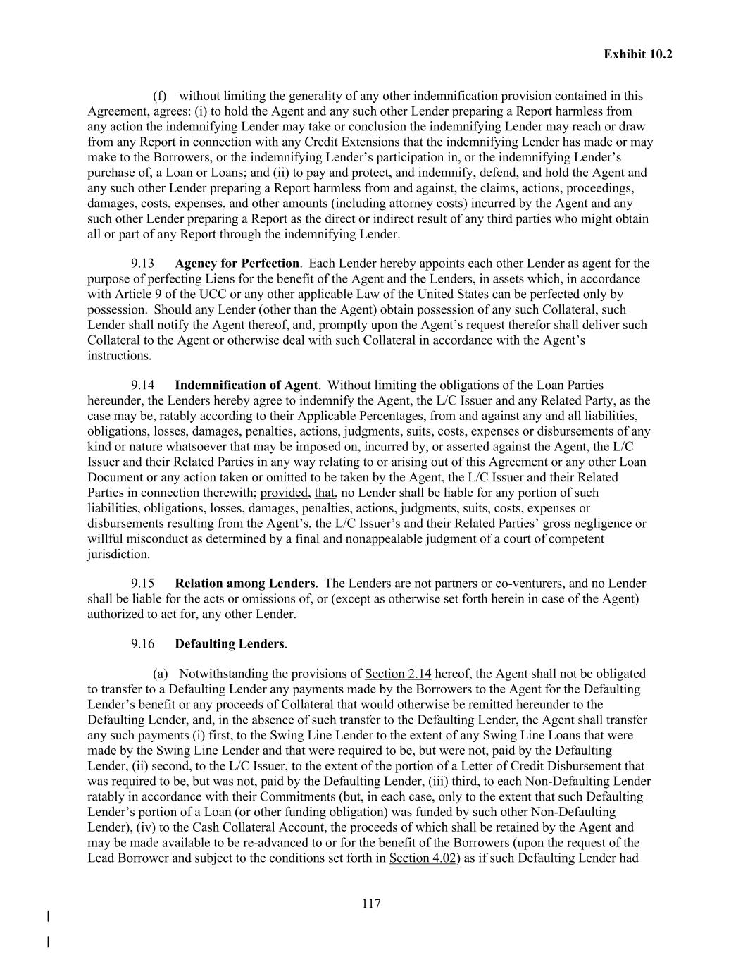 117 Exhibit 10.2 (f) without limiting the generality of any other indemnification provision contained in this Agreement, agrees: (i) to hold the Agent and any such other Lender preparing a Report harmless from any action the indemnifying Lender may take or conclusion the indemnifying Lender may reach or draw from any Report in connection with any Credit Extensions that the indemnifying Lender has made or may make to the Borrowers, or the indemnifying Lender’s participation in, or the indemnifying Lender’s purchase of, a Loan or Loans; and (ii) to pay and protect, and indemnify, defend, and hold the Agent and any such other Lender preparing a Report harmless from and against, the claims, actions, proceedings, damages, costs, expenses, and other amounts (including attorney costs) incurred by the Agent and any such other Lender preparing a Report as the direct or indirect result of any third parties who might obtain all or part of any Report through the indemnifying Lender. 9.13 Agency for Perfection. Each Lender hereby appoints each other Lender as agent for the purpose of perfecting Liens for the benefit of the Agent and the Lenders, in assets which, in accordance with Article 9 of the UCC or any other applicable Law of the United States can be perfected only by possession. Should any Lender (other than the Agent) obtain possession of any such Collateral, such Lender shall notify the Agent thereof, and, promptly upon the Agent’s request therefor shall deliver such Collateral to the Agent or otherwise deal with such Collateral in accordance with the Agent’s instructions. 9.14 Indemnification of Agent. Without limiting the obligations of the Loan Parties hereunder, the Lenders hereby agree to indemnify the Agent, the L/C Issuer and any Related Party, as the case may be, ratably according to their Applicable Percentages, from and against any and all liabilities, obligations, losses, damages, penalties, actions, judgments, suits, costs, expenses or disbursements of any kind or nature whatsoever that may be imposed on, incurred by, or asserted against the Agent, the L/C Issuer and their Related Parties in any way relating to or arising out of this Agreement or any other Loan Document or any action taken or omitted to be taken by the Agent, the L/C Issuer and their Related Parties in connection therewith; provided, that, no Lender shall be liable for any portion of such liabilities, obligations, losses, damages, penalties, actions, judgments, suits, costs, expenses or disbursements resulting from the Agent’s, the L/C Issuer’s and their Related Parties’ gross negligence or willful misconduct as determined by a final and nonappealable judgment of a court of competent jurisdiction. 9.15 Relation among Lenders. The Lenders are not partners or co-venturers, and no Lender shall be liable for the acts or omissions of, or (except as otherwise set forth herein in case of the Agent) authorized to act for, any other Lender. 9.16 Defaulting Lenders. (a) Notwithstanding the provisions of Section 2.14 hereof, the Agent shall not be obligated to transfer to a Defaulting Lender any payments made by the Borrowers to the Agent for the Defaulting Lender’s benefit or any proceeds of Collateral that would otherwise be remitted hereunder to the Defaulting Lender, and, in the absence of such transfer to the Defaulting Lender, the Agent shall transfer any such payments (i) first, to the Swing Line Lender to the extent of any Swing Line Loans that were made by the Swing Line Lender and that were required to be, but were not, paid by the Defaulting Lender, (ii) second, to the L/C Issuer, to the extent of the portion of a Letter of Credit Disbursement that was required to be, but was not, paid by the Defaulting Lender, (iii) third, to each Non-Defaulting Lender ratably in accordance with their Commitments (but, in each case, only to the extent that such Defaulting Lender’s portion of a Loan (or other funding obligation) was funded by such other Non-Defaulting Lender), (iv) to the Cash Collateral Account, the proceeds of which shall be retained by the Agent and may be made available to be re-advanced to or for the benefit of the Borrowers (upon the request of the Lead Borrower and subject to the conditions set forth in Section 4.02) as if such Defaulting Lender had