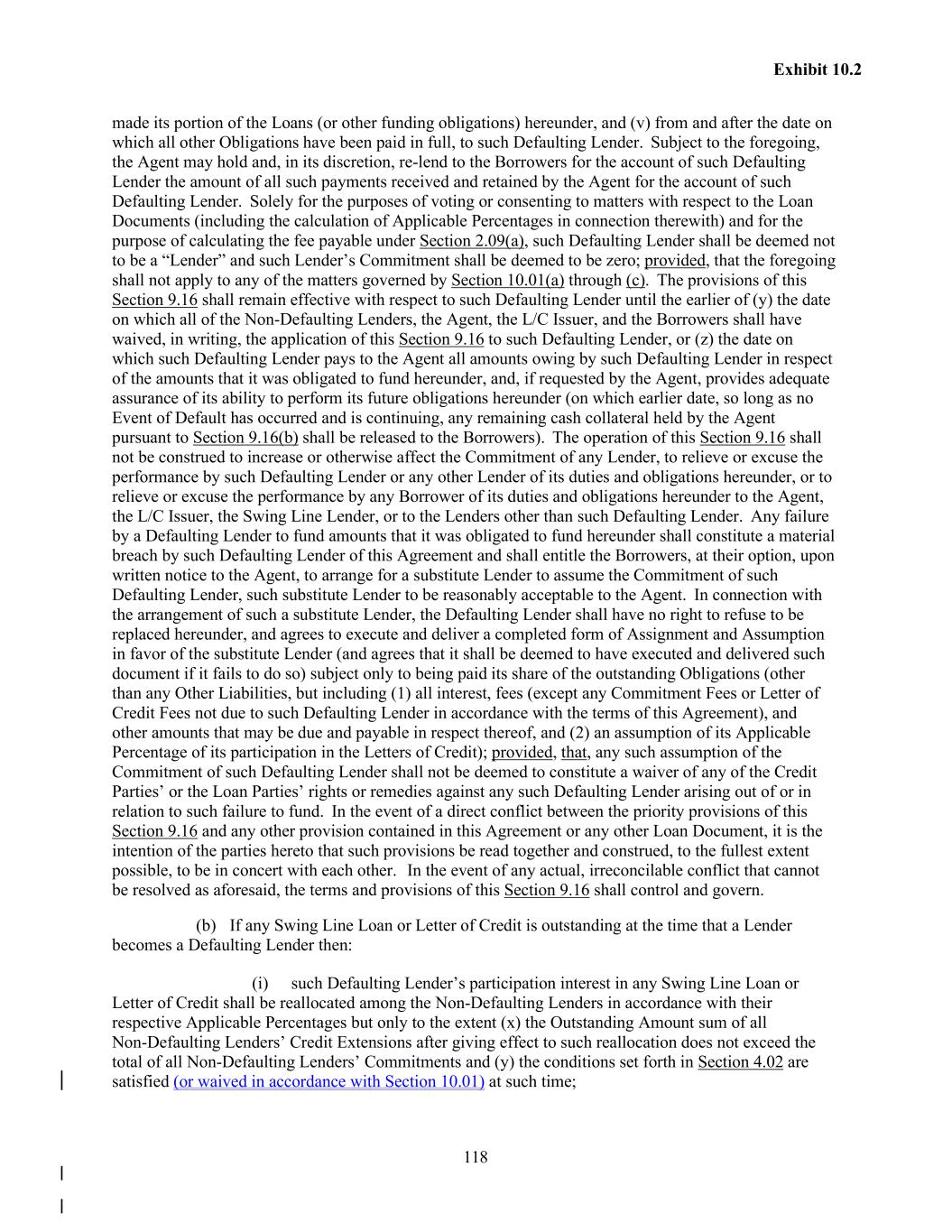 118 Exhibit 10.2 made its portion of the Loans (or other funding obligations) hereunder, and (v) from and after the date on which all other Obligations have been paid in full, to such Defaulting Lender. Subject to the foregoing, the Agent may hold and, in its discretion, re-lend to the Borrowers for the account of such Defaulting Lender the amount of all such payments received and retained by the Agent for the account of such Defaulting Lender. Solely for the purposes of voting or consenting to matters with respect to the Loan Documents (including the calculation of Applicable Percentages in connection therewith) and for the purpose of calculating the fee payable under Section 2.09(a), such Defaulting Lender shall be deemed not to be a “Lender” and such Lender’s Commitment shall be deemed to be zero; provided, that the foregoing shall not apply to any of the matters governed by Section 10.01(a) through (c). The provisions of this Section 9.16 shall remain effective with respect to such Defaulting Lender until the earlier of (y) the date on which all of the Non-Defaulting Lenders, the Agent, the L/C Issuer, and the Borrowers shall have waived, in writing, the application of this Section 9.16 to such Defaulting Lender, or (z) the date on which such Defaulting Lender pays to the Agent all amounts owing by such Defaulting Lender in respect of the amounts that it was obligated to fund hereunder, and, if requested by the Agent, provides adequate assurance of its ability to perform its future obligations hereunder (on which earlier date, so long as no Event of Default has occurred and is continuing, any remaining cash collateral held by the Agent pursuant to Section 9.16(b) shall be released to the Borrowers). The operation of this Section 9.16 shall not be construed to increase or otherwise affect the Commitment of any Lender, to relieve or excuse the performance by such Defaulting Lender or any other Lender of its duties and obligations hereunder, or to relieve or excuse the performance by any Borrower of its duties and obligations hereunder to the Agent, the L/C Issuer, the Swing Line Lender, or to the Lenders other than such Defaulting Lender. Any failure by a Defaulting Lender to fund amounts that it was obligated to fund hereunder shall constitute a material breach by such Defaulting Lender of this Agreement and shall entitle the Borrowers, at their option, upon written notice to the Agent, to arrange for a substitute Lender to assume the Commitment of such Defaulting Lender, such substitute Lender to be reasonably acceptable to the Agent. In connection with the arrangement of such a substitute Lender, the Defaulting Lender shall have no right to refuse to be replaced hereunder, and agrees to execute and deliver a completed form of Assignment and Assumption in favor of the substitute Lender (and agrees that it shall be deemed to have executed and delivered such document if it fails to do so) subject only to being paid its share of the outstanding Obligations (other than any Other Liabilities, but including (1) all interest, fees (except any Commitment Fees or Letter of Credit Fees not due to such Defaulting Lender in accordance with the terms of this Agreement), and other amounts that may be due and payable in respect thereof, and (2) an assumption of its Applicable Percentage of its participation in the Letters of Credit); provided, that, any such assumption of the Commitment of such Defaulting Lender shall not be deemed to constitute a waiver of any of the Credit Parties’ or the Loan Parties’ rights or remedies against any such Defaulting Lender arising out of or in relation to such failure to fund. In the event of a direct conflict between the priority provisions of this Section 9.16 and any other provision contained in this Agreement or any other Loan Document, it is the intention of the parties hereto that such provisions be read together and construed, to the fullest extent possible, to be in concert with each other. In the event of any actual, irreconcilable conflict that cannot be resolved as aforesaid, the terms and provisions of this Section 9.16 shall control and govern. (b) If any Swing Line Loan or Letter of Credit is outstanding at the time that a Lender becomes a Defaulting Lender then: (i) such Defaulting Lender’s participation interest in any Swing Line Loan or Letter of Credit shall be reallocated among the Non-Defaulting Lenders in accordance with their respective Applicable Percentages but only to the extent (x) the Outstanding Amount sum of all Non-Defaulting Lenders’ Credit Extensions after giving effect to such reallocation does not exceed the total of all Non-Defaulting Lenders’ Commitments and (y) the conditions set forth in Section 4.02 are satisfied (or waived in accordance with Section 10.01) at such time;