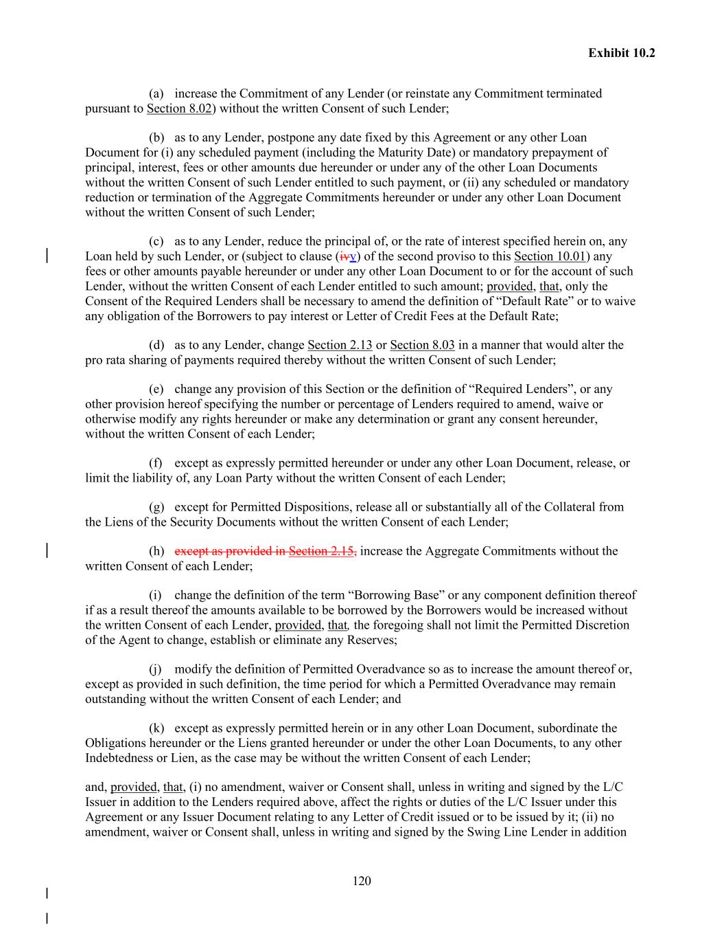 120 Exhibit 10.2 (a) increase the Commitment of any Lender (or reinstate any Commitment terminated pursuant to Section 8.02) without the written Consent of such Lender; (b) as to any Lender, postpone any date fixed by this Agreement or any other Loan Document for (i) any scheduled payment (including the Maturity Date) or mandatory prepayment of principal, interest, fees or other amounts due hereunder or under any of the other Loan Documents without the written Consent of such Lender entitled to such payment, or (ii) any scheduled or mandatory reduction or termination of the Aggregate Commitments hereunder or under any other Loan Document without the written Consent of such Lender; (c) as to any Lender, reduce the principal of, or the rate of interest specified herein on, any Loan held by such Lender, or (subject to clause (ivv) of the second proviso to this Section 10.01) any fees or other amounts payable hereunder or under any other Loan Document to or for the account of such Lender, without the written Consent of each Lender entitled to such amount; provided, that, only the Consent of the Required Lenders shall be necessary to amend the definition of “Default Rate” or to waive any obligation of the Borrowers to pay interest or Letter of Credit Fees at the Default Rate; (d) as to any Lender, change Section 2.13 or Section 8.03 in a manner that would alter the pro rata sharing of payments required thereby without the written Consent of such Lender; (e) change any provision of this Section or the definition of “Required Lenders”, or any other provision hereof specifying the number or percentage of Lenders required to amend, waive or otherwise modify any rights hereunder or make any determination or grant any consent hereunder, without the written Consent of each Lender; (f) except as expressly permitted hereunder or under any other Loan Document, release, or limit the liability of, any Loan Party without the written Consent of each Lender; (g) except for Permitted Dispositions, release all or substantially all of the Collateral from the Liens of the Security Documents without the written Consent of each Lender; (h) except as provided in Section 2.15, increase the Aggregate Commitments without the written Consent of each Lender; (i) change the definition of the term “Borrowing Base” or any component definition thereof if as a result thereof the amounts available to be borrowed by the Borrowers would be increased without the written Consent of each Lender, provided, that, the foregoing shall not limit the Permitted Discretion of the Agent to change, establish or eliminate any Reserves; (j) modify the definition of Permitted Overadvance so as to increase the amount thereof or, except as provided in such definition, the time period for which a Permitted Overadvance may remain outstanding without the written Consent of each Lender; and (k) except as expressly permitted herein or in any other Loan Document, subordinate the Obligations hereunder or the Liens granted hereunder or under the other Loan Documents, to any other Indebtedness or Lien, as the case may be without the written Consent of each Lender; and, provided, that, (i) no amendment, waiver or Consent shall, unless in writing and signed by the L/C Issuer in addition to the Lenders required above, affect the rights or duties of the L/C Issuer under this Agreement or any Issuer Document relating to any Letter of Credit issued or to be issued by it; (ii) no amendment, waiver or Consent shall, unless in writing and signed by the Swing Line Lender in addition