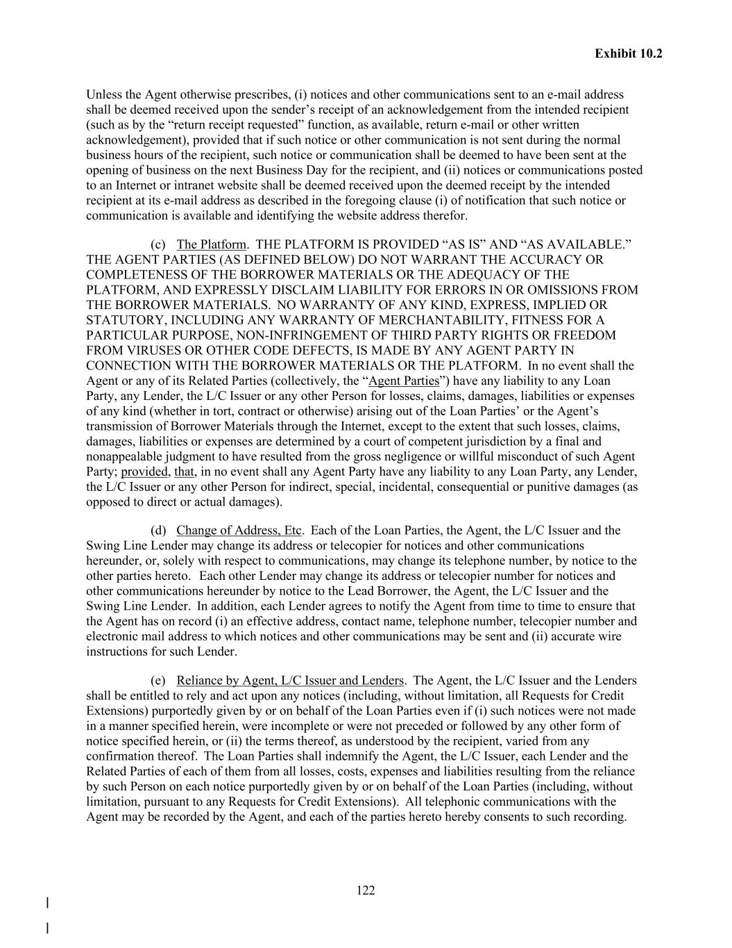122 Exhibit 10.2 Unless the Agent otherwise prescribes, (i) notices and other communications sent to an e-mail address shall be deemed received upon the sender’s receipt of an acknowledgement from the intended recipient (such as by the “return receipt requested” function, as available, return e-mail or other written acknowledgement), provided that if such notice or other communication is not sent during the normal business hours of the recipient, such notice or communication shall be deemed to have been sent at the opening of business on the next Business Day for the recipient, and (ii) notices or communications posted to an Internet or intranet website shall be deemed received upon the deemed receipt by the intended recipient at its e-mail address as described in the foregoing clause (i) of notification that such notice or communication is available and identifying the website address therefor. (c) The Platform. THE PLATFORM IS PROVIDED “AS IS” AND “AS AVAILABLE.” THE AGENT PARTIES (AS DEFINED BELOW) DO NOT WARRANT THE ACCURACY OR COMPLETENESS OF THE BORROWER MATERIALS OR THE ADEQUACY OF THE PLATFORM, AND EXPRESSLY DISCLAIM LIABILITY FOR ERRORS IN OR OMISSIONS FROM THE BORROWER MATERIALS. NO WARRANTY OF ANY KIND, EXPRESS, IMPLIED OR STATUTORY, INCLUDING ANY WARRANTY OF MERCHANTABILITY, FITNESS FOR A PARTICULAR PURPOSE, NON-INFRINGEMENT OF THIRD PARTY RIGHTS OR FREEDOM FROM VIRUSES OR OTHER CODE DEFECTS, IS MADE BY ANY AGENT PARTY IN CONNECTION WITH THE BORROWER MATERIALS OR THE PLATFORM. In no event shall the Agent or any of its Related Parties (collectively, the “Agent Parties”) have any liability to any Loan Party, any Lender, the L/C Issuer or any other Person for losses, claims, damages, liabilities or expenses of any kind (whether in tort, contract or otherwise) arising out of the Loan Parties’ or the Agent’s transmission of Borrower Materials through the Internet, except to the extent that such losses, claims, damages, liabilities or expenses are determined by a court of competent jurisdiction by a final and nonappealable judgment to have resulted from the gross negligence or willful misconduct of such Agent Party; provided, that, in no event shall any Agent Party have any liability to any Loan Party, any Lender, the L/C Issuer or any other Person for indirect, special, incidental, consequential or punitive damages (as opposed to direct or actual damages). (d) Change of Address, Etc. Each of the Loan Parties, the Agent, the L/C Issuer and the Swing Line Lender may change its address or telecopier for notices and other communications hereunder, or, solely with respect to communications, may change its telephone number, by notice to the other parties hereto. Each other Lender may change its address or telecopier number for notices and other communications hereunder by notice to the Lead Borrower, the Agent, the L/C Issuer and the Swing Line Lender. In addition, each Lender agrees to notify the Agent from time to time to ensure that the Agent has on record (i) an effective address, contact name, telephone number, telecopier number and electronic mail address to which notices and other communications may be sent and (ii) accurate wire instructions for such Lender. (e) Reliance by Agent, L/C Issuer and Lenders. The Agent, the L/C Issuer and the Lenders shall be entitled to rely and act upon any notices (including, without limitation, all Requests for Credit Extensions) purportedly given by or on behalf of the Loan Parties even if (i) such notices were not made in a manner specified herein, were incomplete or were not preceded or followed by any other form of notice specified herein, or (ii) the terms thereof, as understood by the recipient, varied from any confirmation thereof. The Loan Parties shall indemnify the Agent, the L/C Issuer, each Lender and the Related Parties of each of them from all losses, costs, expenses and liabilities resulting from the reliance by such Person on each notice purportedly given by or on behalf of the Loan Parties (including, without limitation, pursuant to any Requests for Credit Extensions). All telephonic communications with the Agent may be recorded by the Agent, and each of the parties hereto hereby consents to such recording.